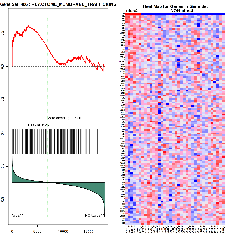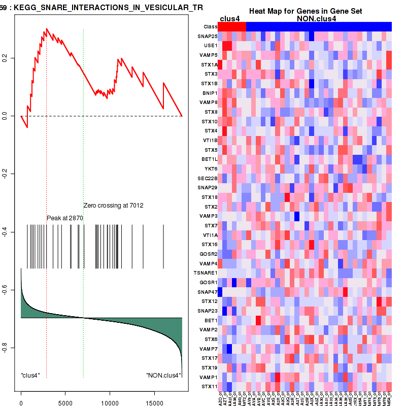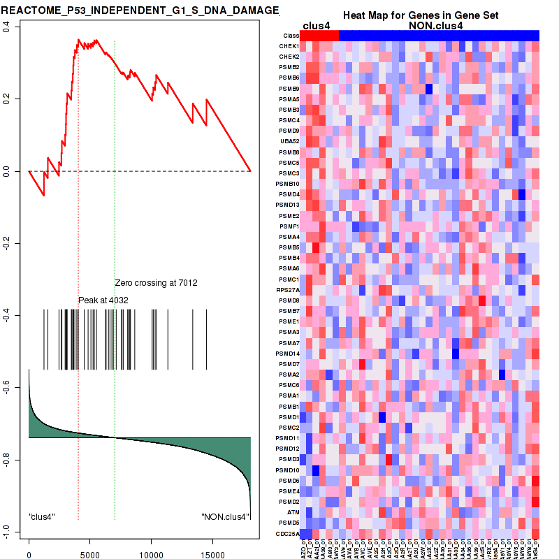 For the expression subtypes of 18131 genes in 37 samples, GSEA found enriched gene sets in each cluster using 36 gene sets in MSigDB canonical pathways. Top enriched gene sets are listed as below.