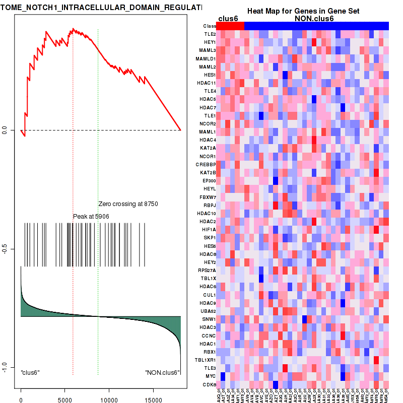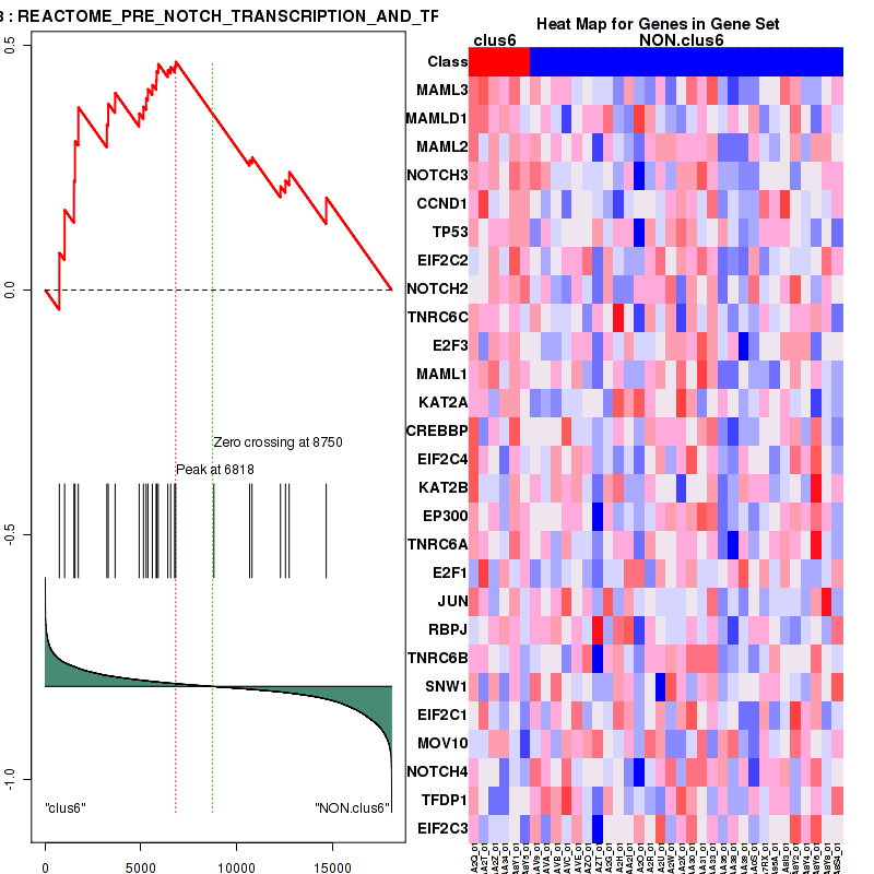 Figure S119. Get High-res Image This plot shows mRNAseq_cNMF expression data heatmap (on the left) a RunningEnrichmentScore(RES) plot (on the top right) and a Signal2Noise(S2N) plot (on the bottom right) of genes in the pathway: REACTOME NOTCH1 INTRACELLULAR DOMAIN REGULATES TRANSCRIPTION.