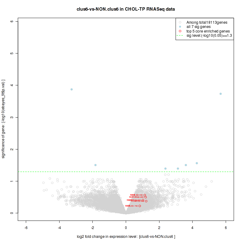 Figure S120. Get High-res Image For the top 5 core enriched genes in the pathway: REACTOME NOTCH1 INTRACELLULAR DOMAIN REGULATES TRANSCRIPTION, this volcano plot shows how much they are up/down-regulated and significant. The significance was calculated by empirical bayesian fit