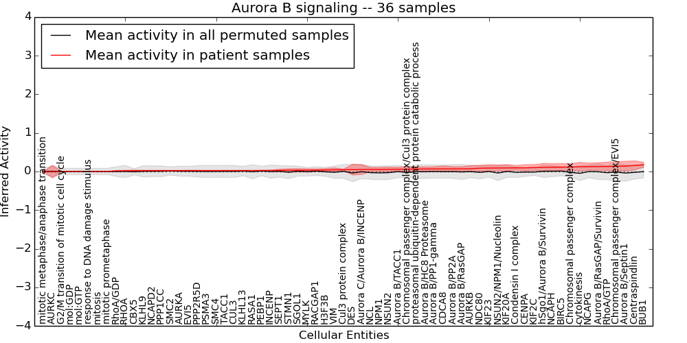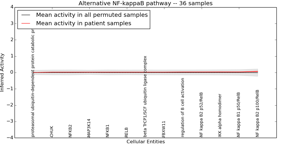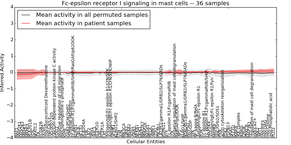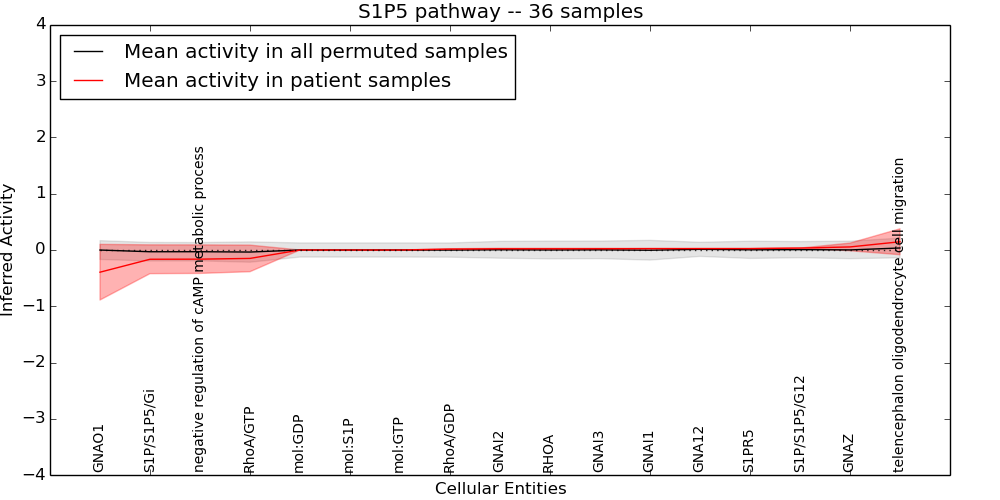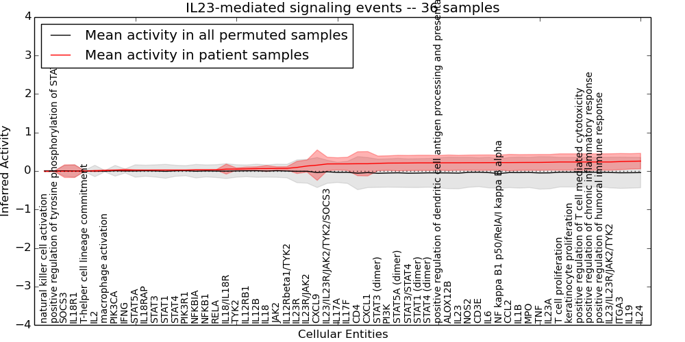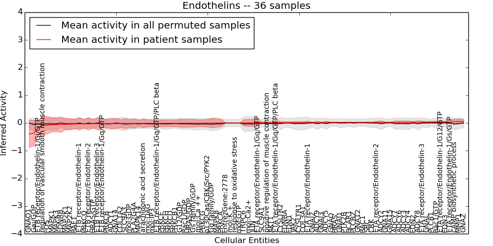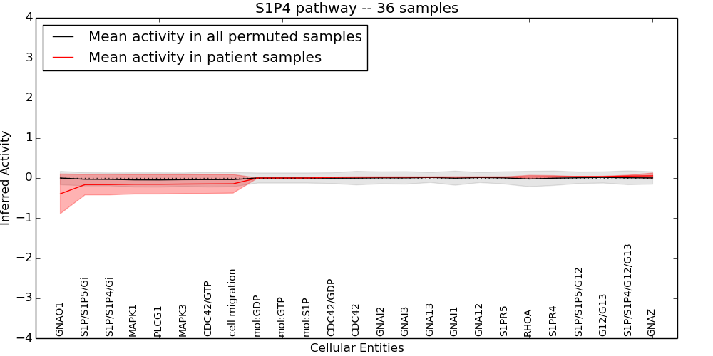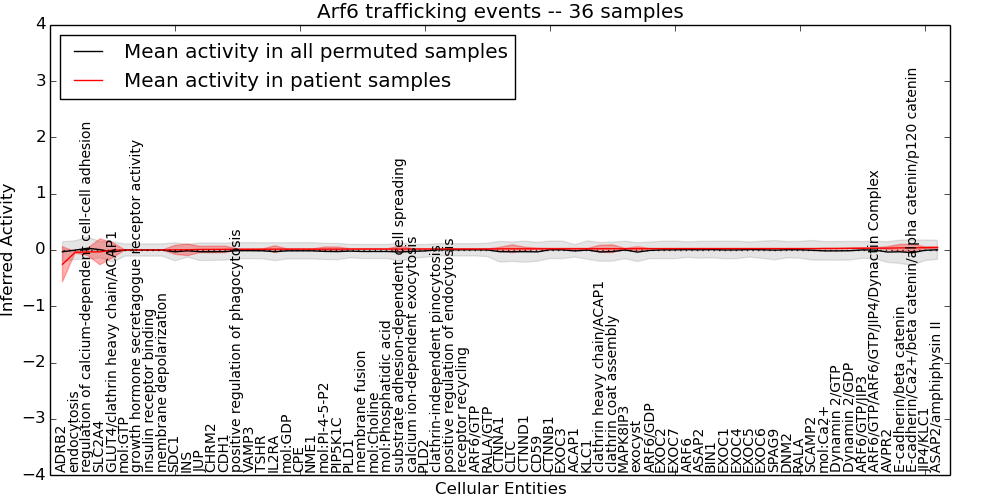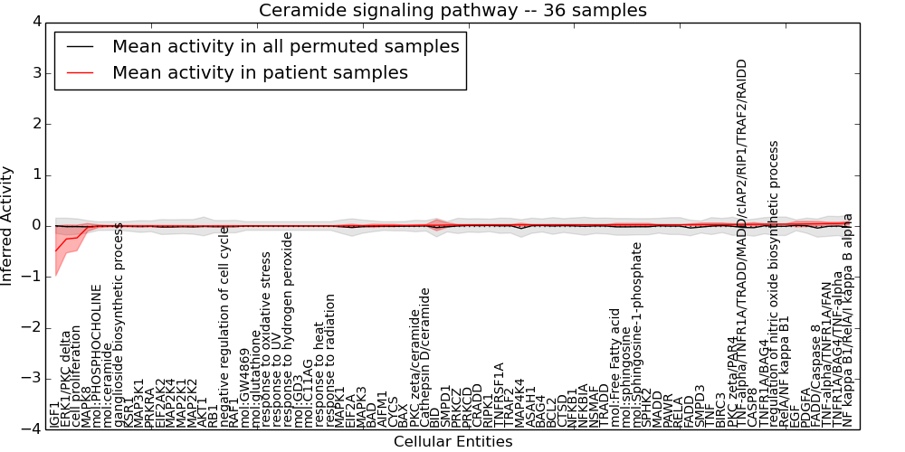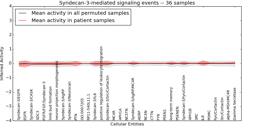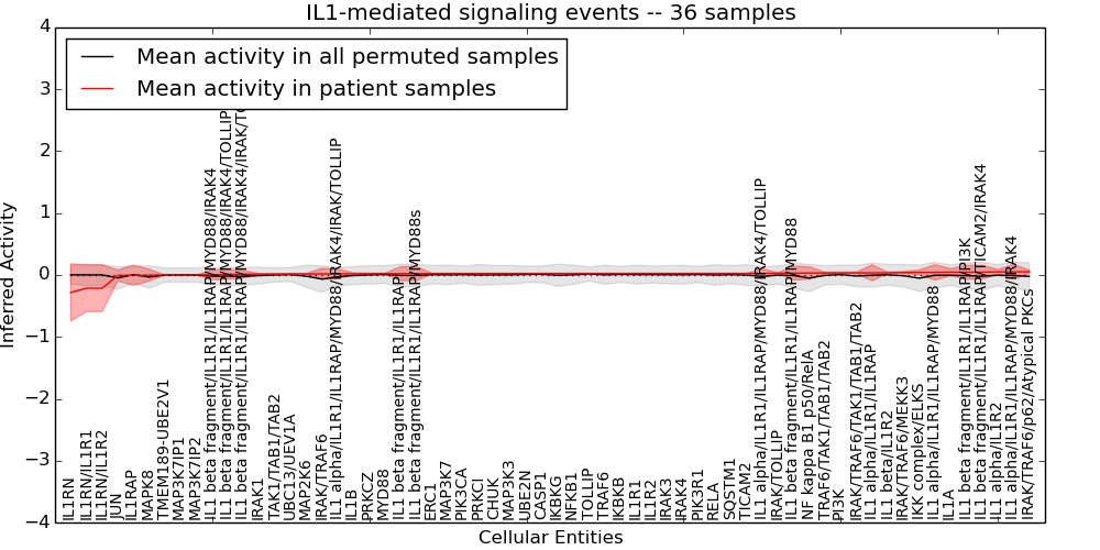 Figure S130. Get High-res Image This plot shows pathway concept perturbations across all samples against a permutation model. The concepts along the x-axis are sorted by lowest to highest mean activity for the real patient samples. Mean inferred activities are plotted along the y-axis as a colored band showing the average level and one standard deviation range. Real samples are shown in red and permuted samples in black.