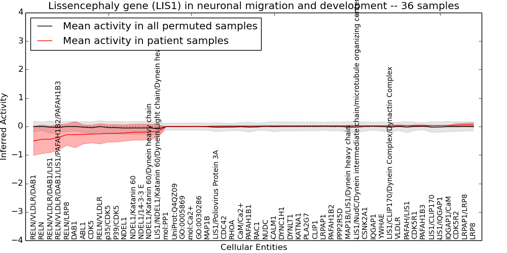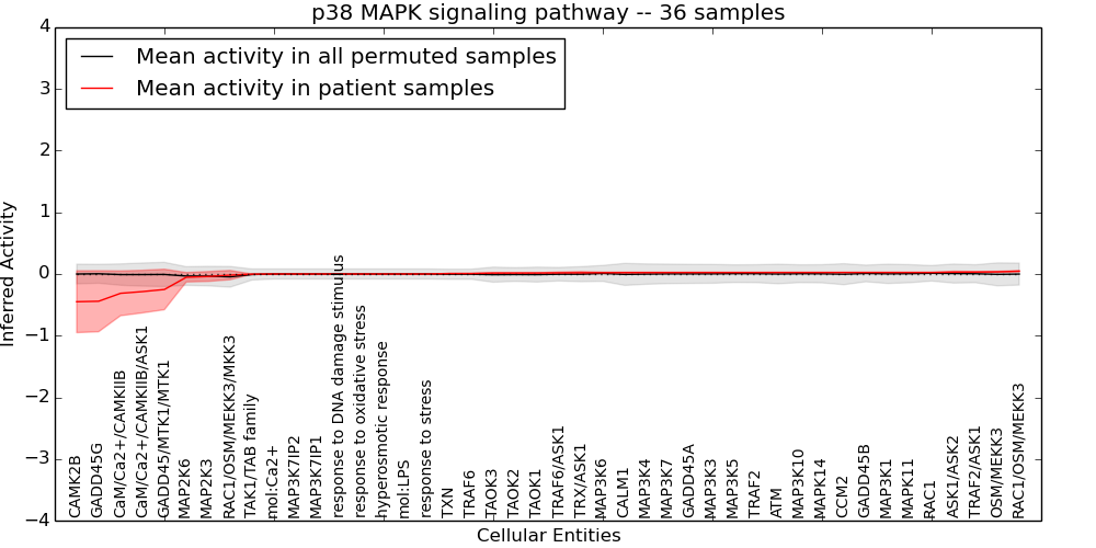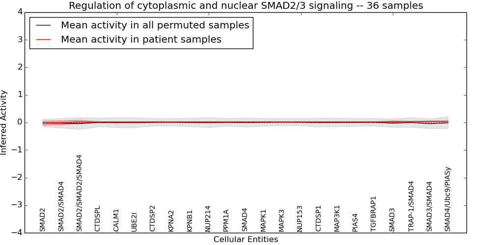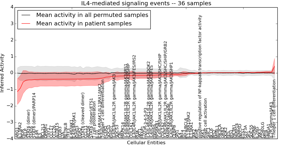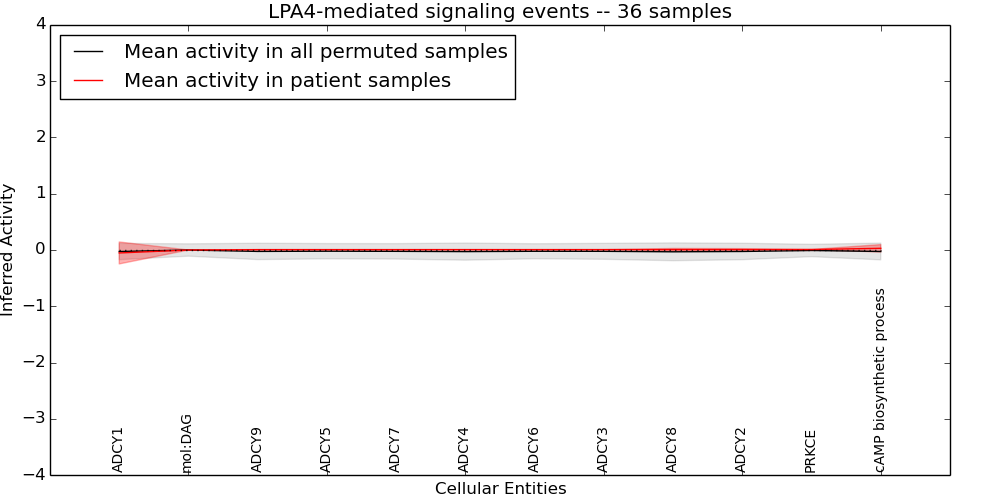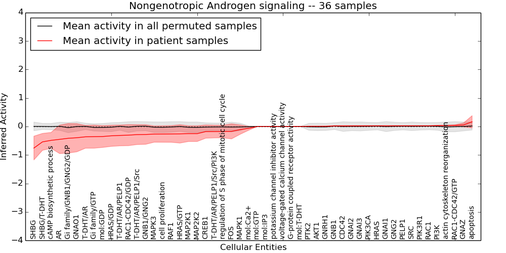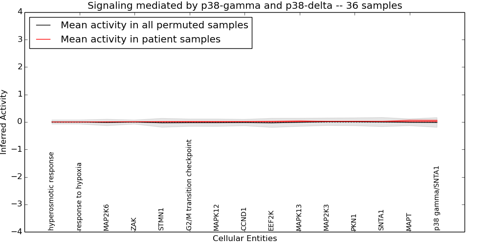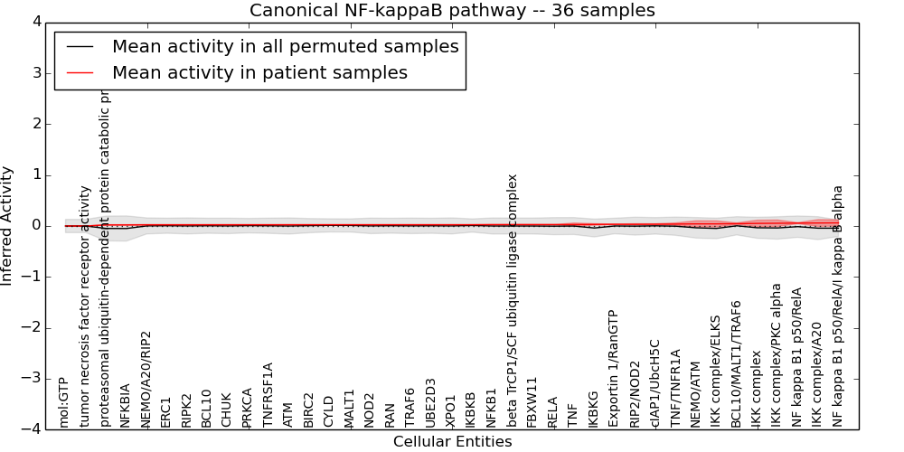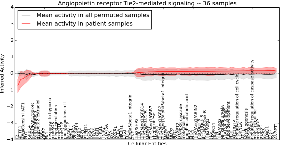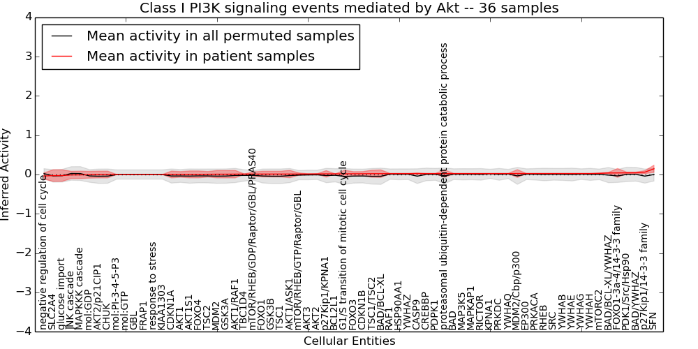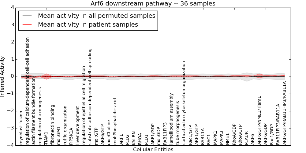 Figure S130. Get High-res Image This plot shows pathway concept perturbations across all samples against a permutation model. The concepts along the x-axis are sorted by lowest to highest mean activity for the real patient samples. Mean inferred activities are plotted along the y-axis as a colored band showing the average level and one standard deviation range. Real samples are shown in red and permuted samples in black.