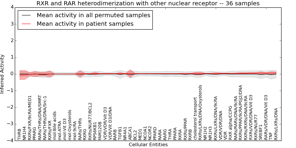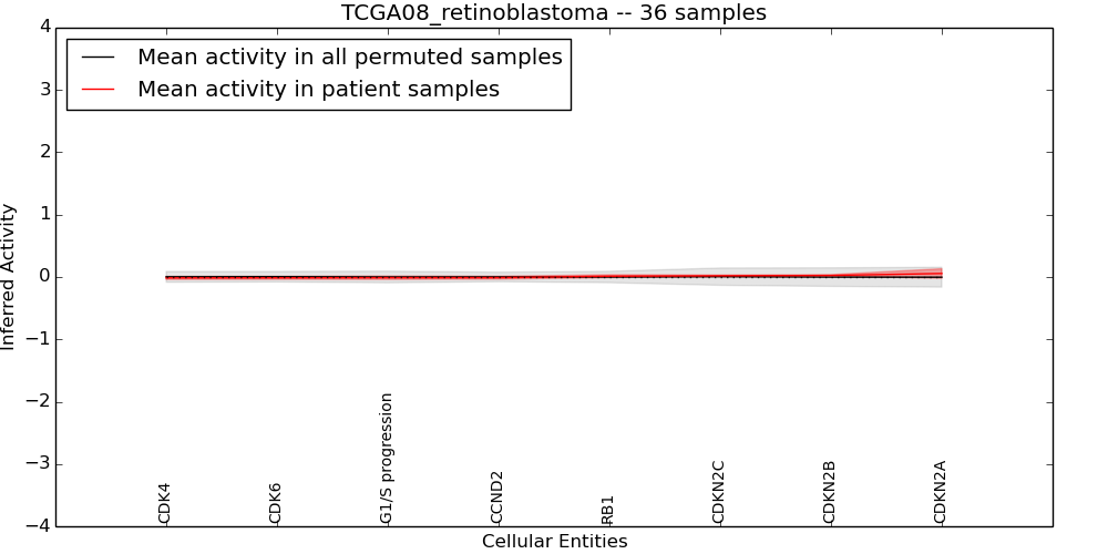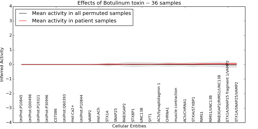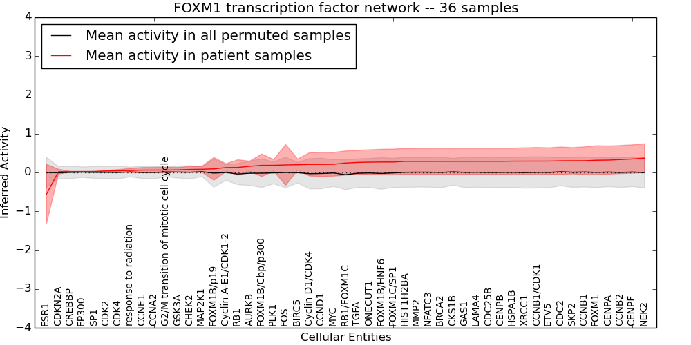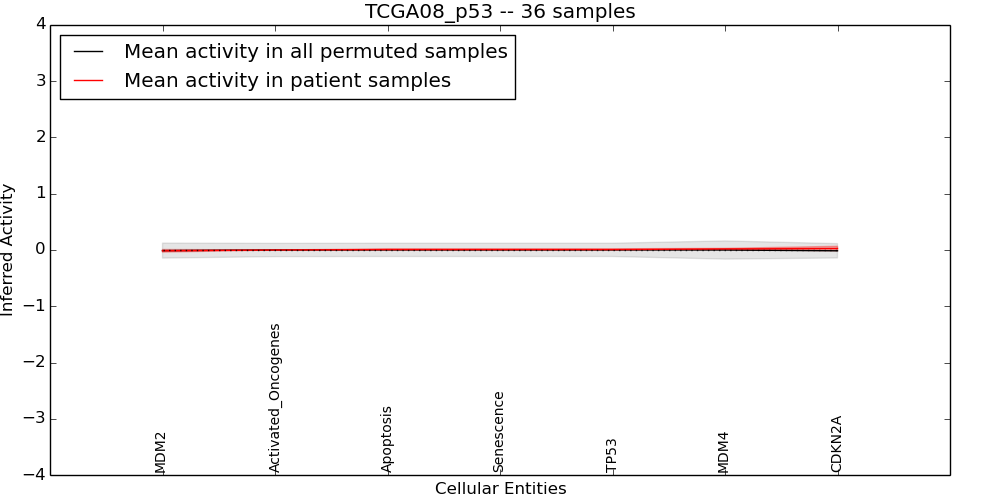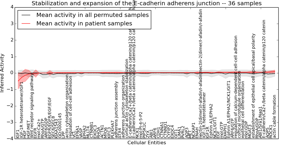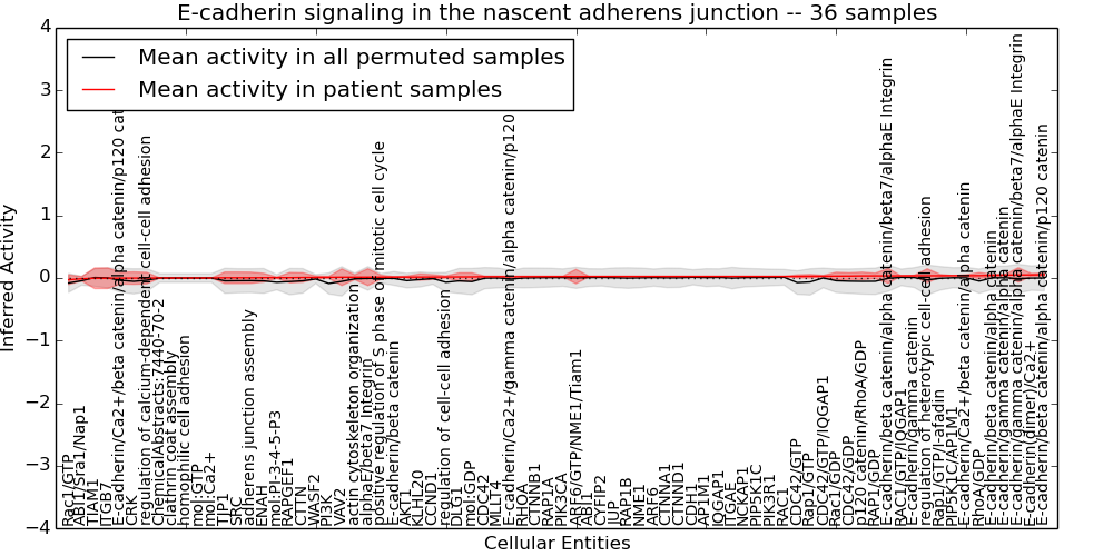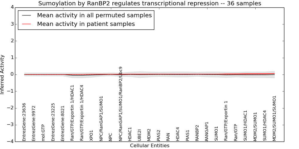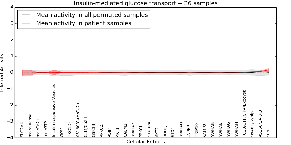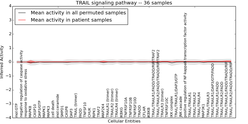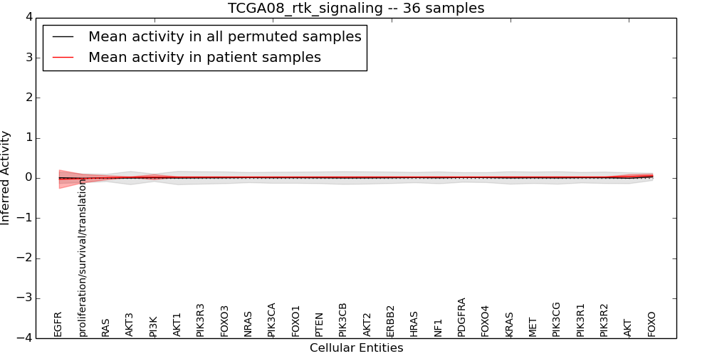 Figure S130. Get High-res Image This plot shows pathway concept perturbations across all samples against a permutation model. The concepts along the x-axis are sorted by lowest to highest mean activity for the real patient samples. Mean inferred activities are plotted along the y-axis as a colored band showing the average level and one standard deviation range. Real samples are shown in red and permuted samples in black.