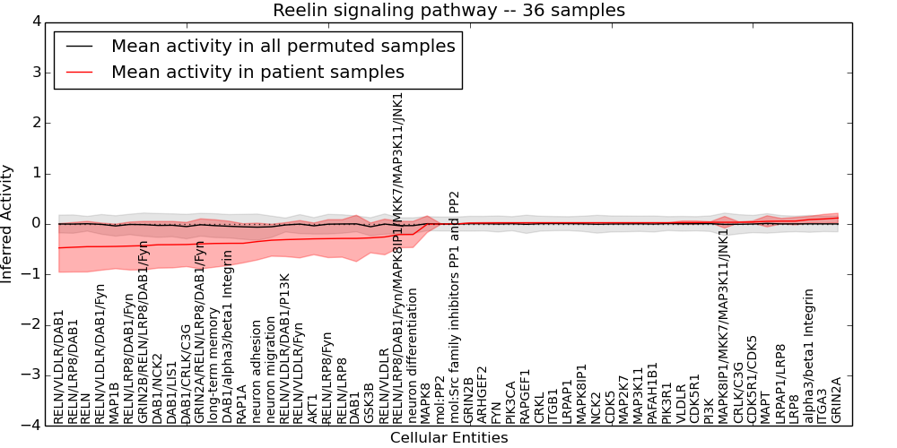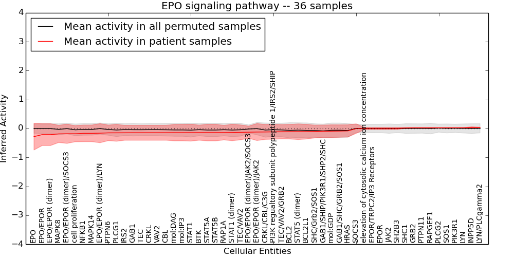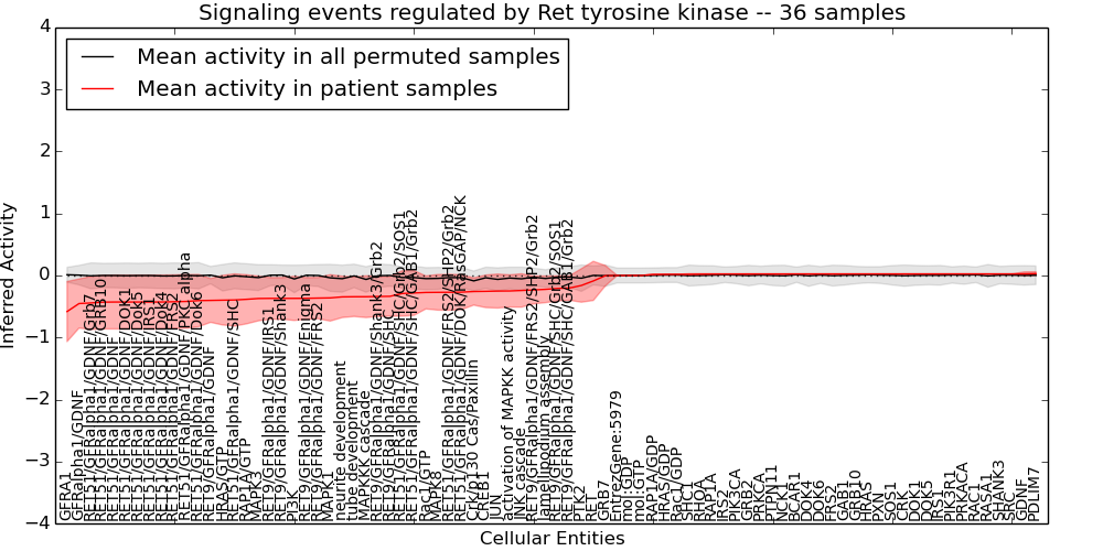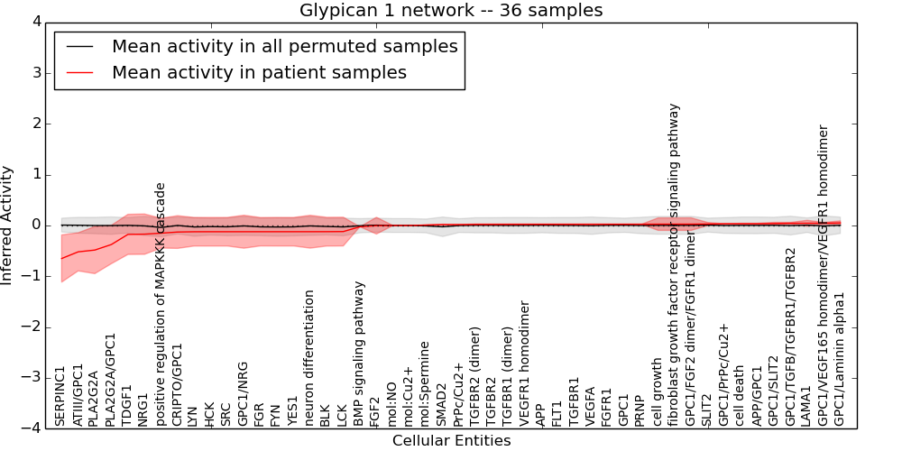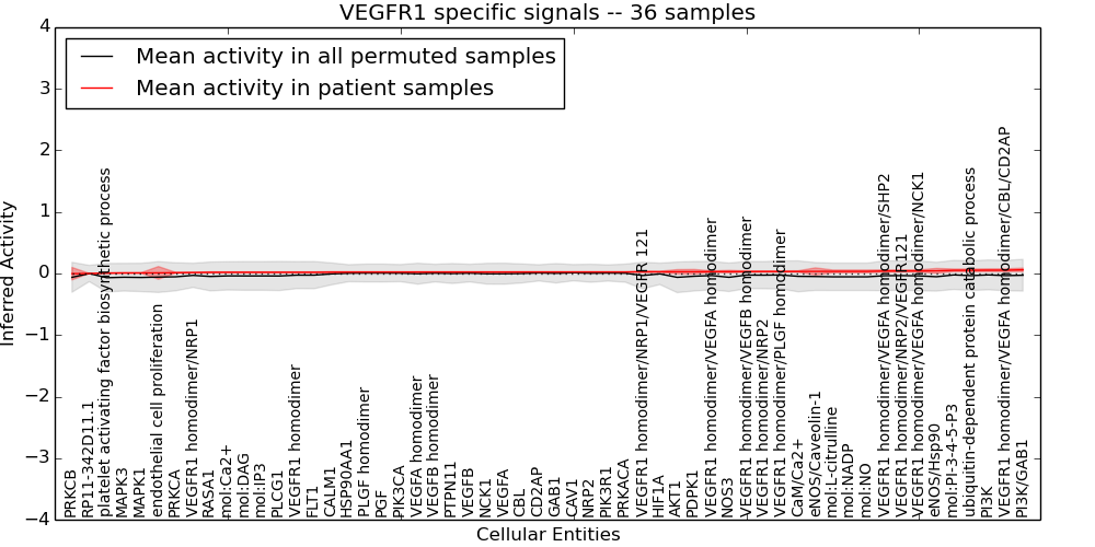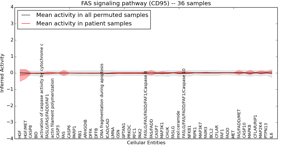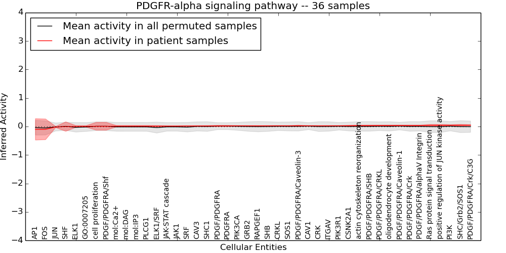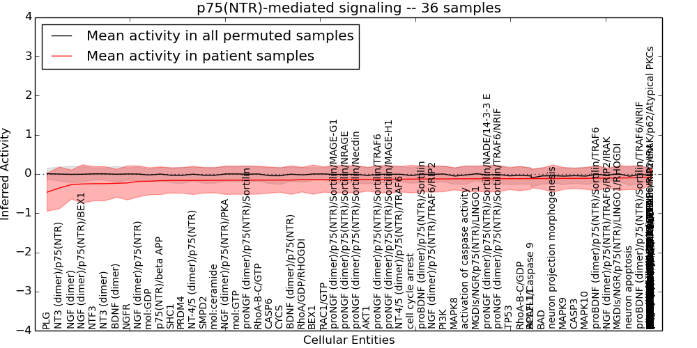 Figure S131. Get High-res Image This plot shows pathway concept perturbations across all samples against a permutation model. The concepts along the x-axis are sorted by lowest to highest mean activity for the real patient samples. Mean inferred activities are plotted along the y-axis as a colored band showing the average level and one standard deviation range. Real samples are shown in red and permuted samples in black.