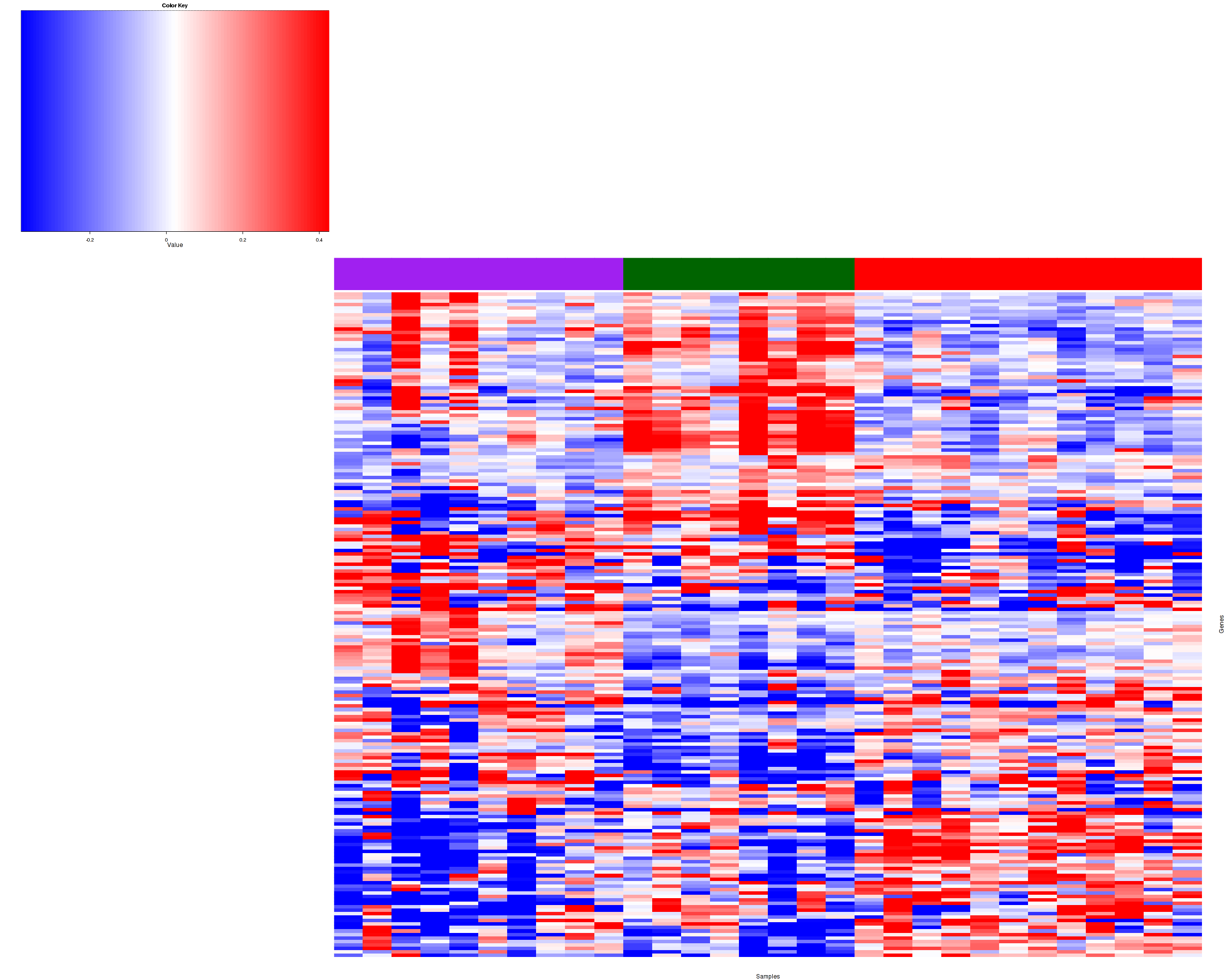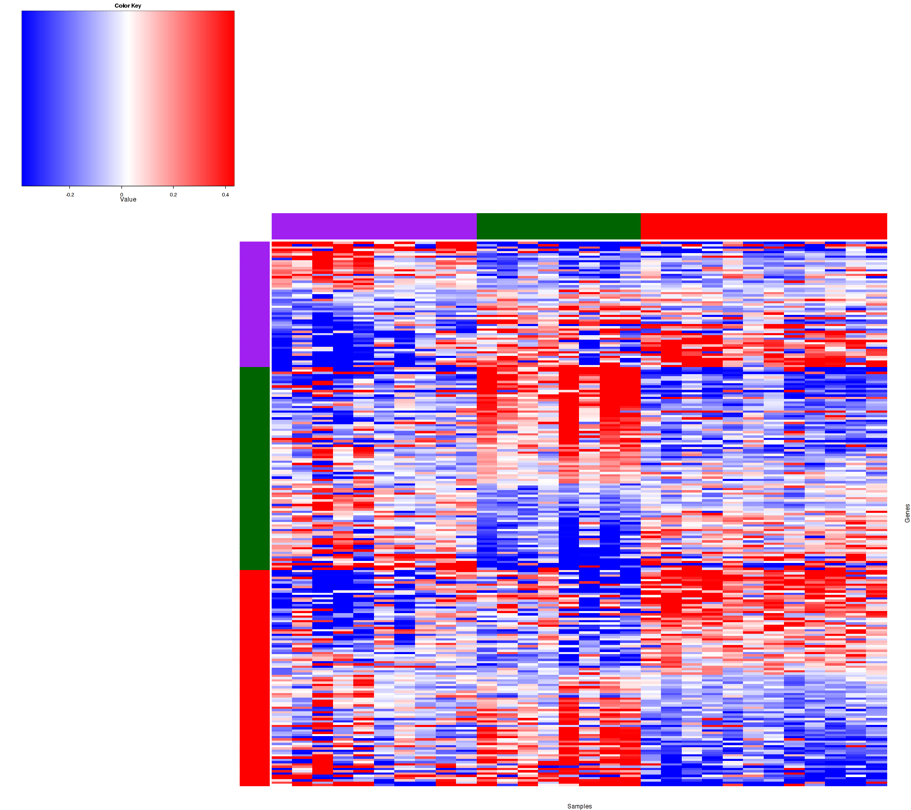 Figure 1. Get High-res Image Samples were separated into 3 clusters. Shown are 30 samples and 239 marker proteins. The color bar of the row indicates the marker proteins for the corresponding cluster.