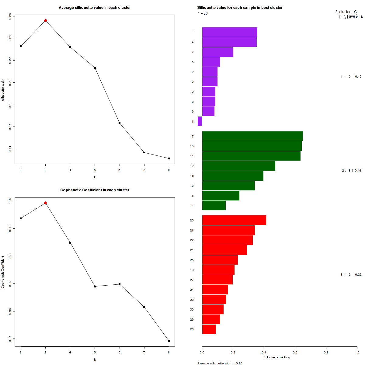 Figure 3. Get High-res Image The silhouette width was calculated for each sample and each value of k. The left upper panel shows the average silhouette width across all samples for each tested k (left upper panel). The left lower panel shows the Cophenetic Correlation Coefficients for each tested k. The right panel shows assignments of clusters to samples and the silhouette width of each sample for the most robust clustering.