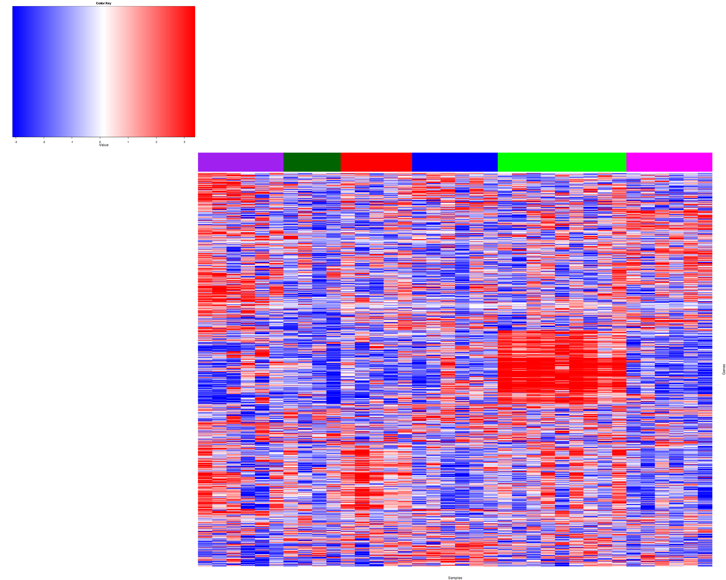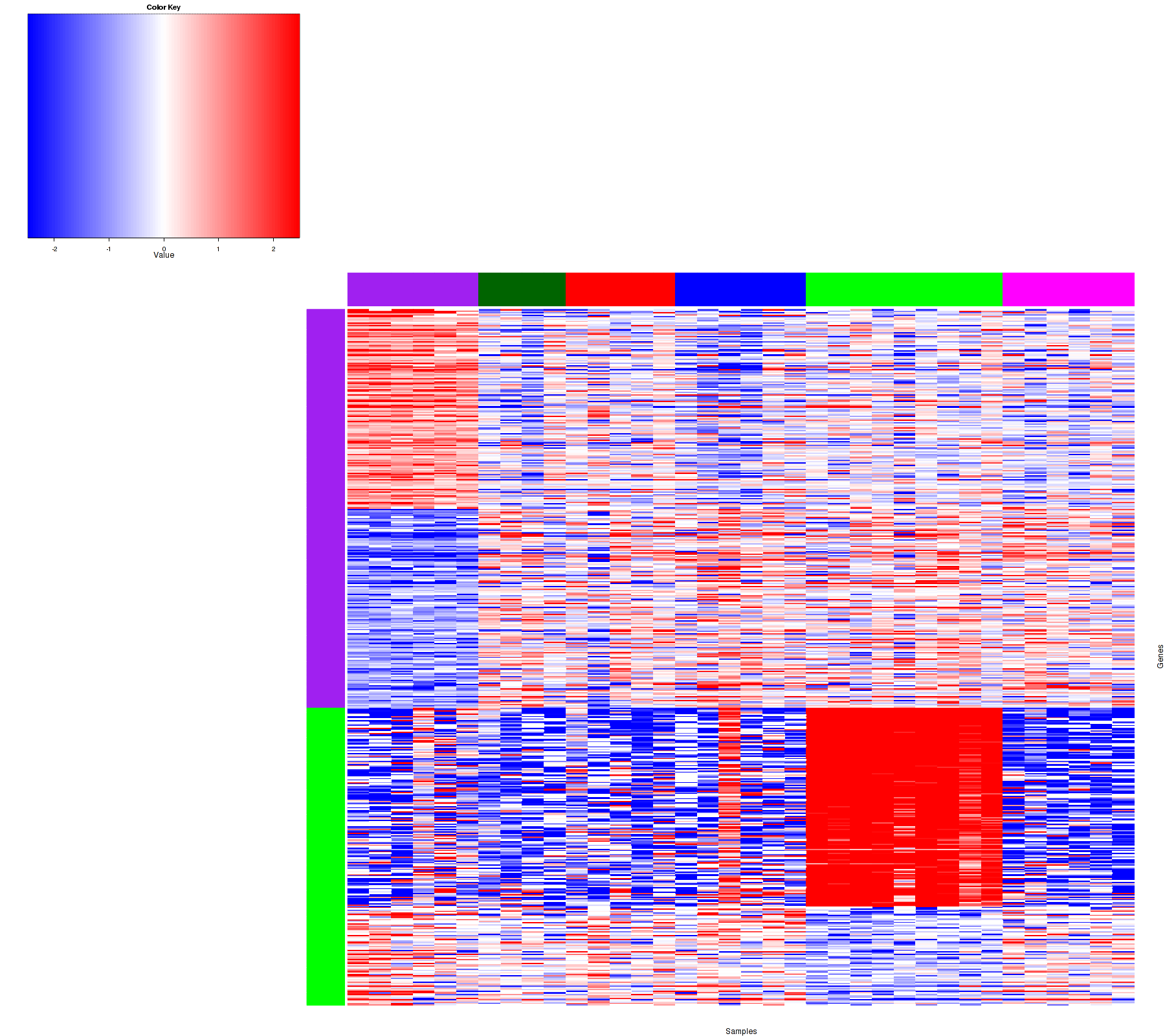 Figure 1. Get High-res Image Samples were separated into 6 clusters. Shown are 36 samples and 524 marker genes. The color bar of the row indicates the marker genes for the corresponding cluster.