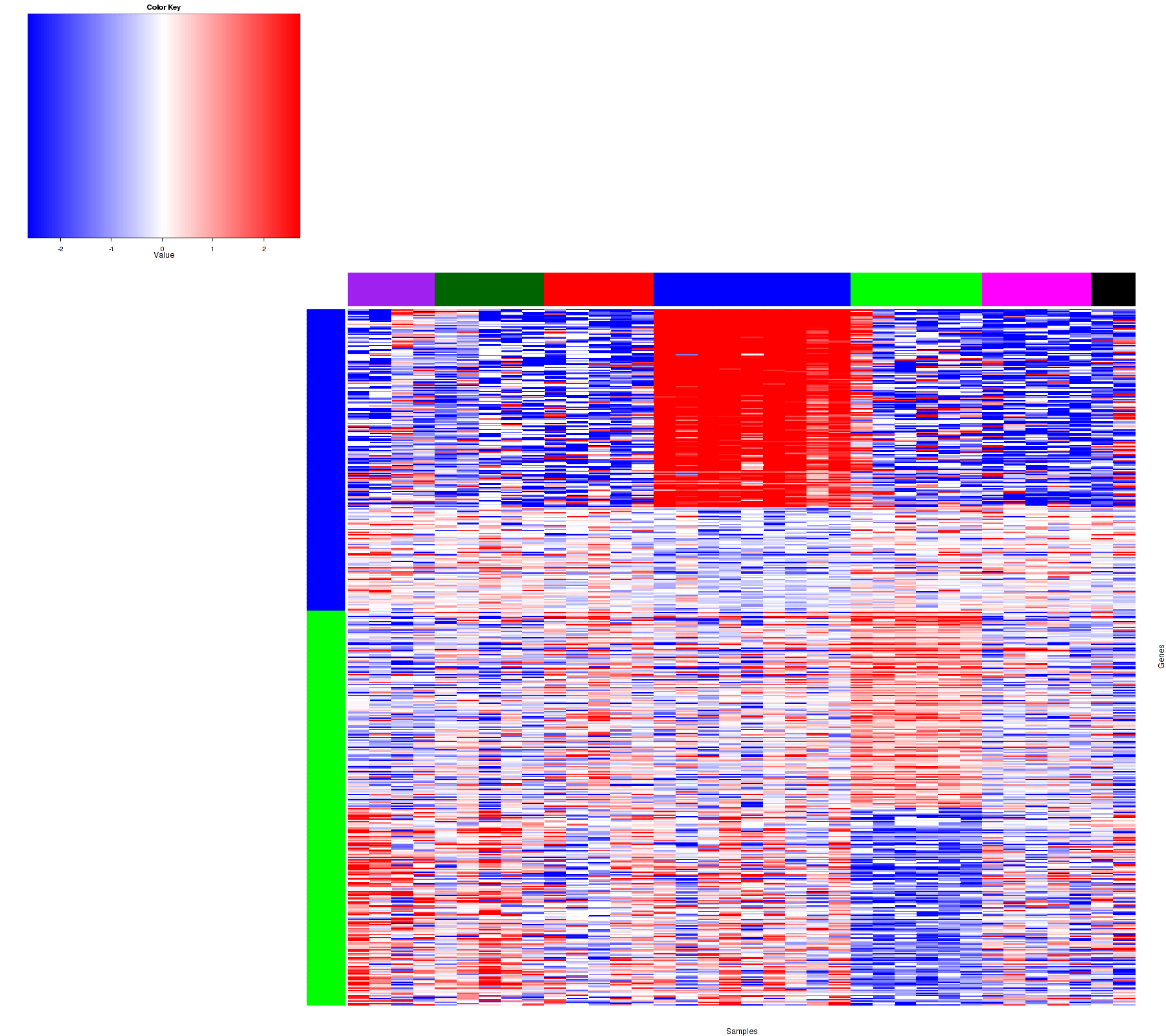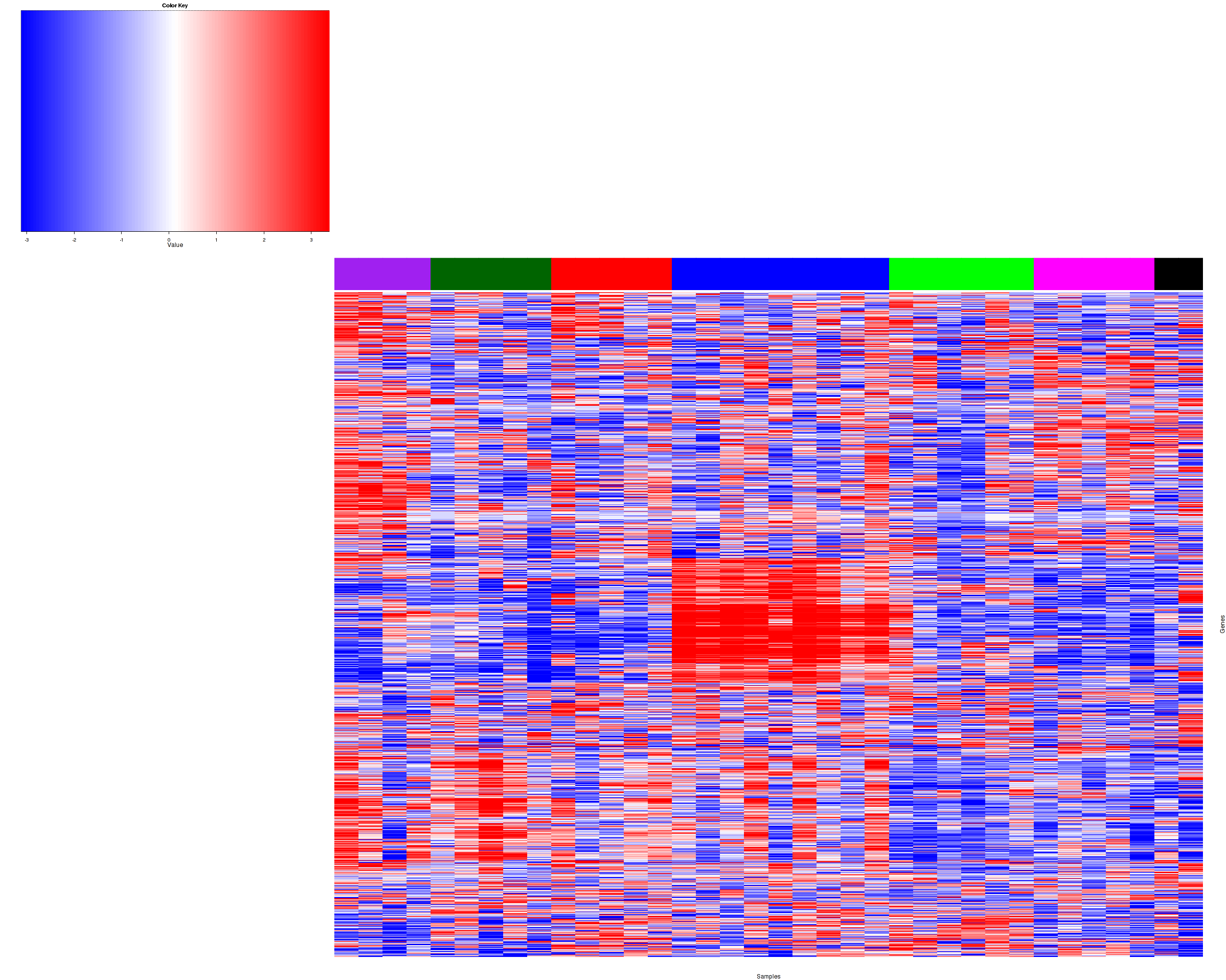 Figure 1. Get High-res Image Samples were separated into 7 clusters. Shown are 36 samples and 529 marker genes. The color bar of the row indicates the marker genes for the corresponding cluster.