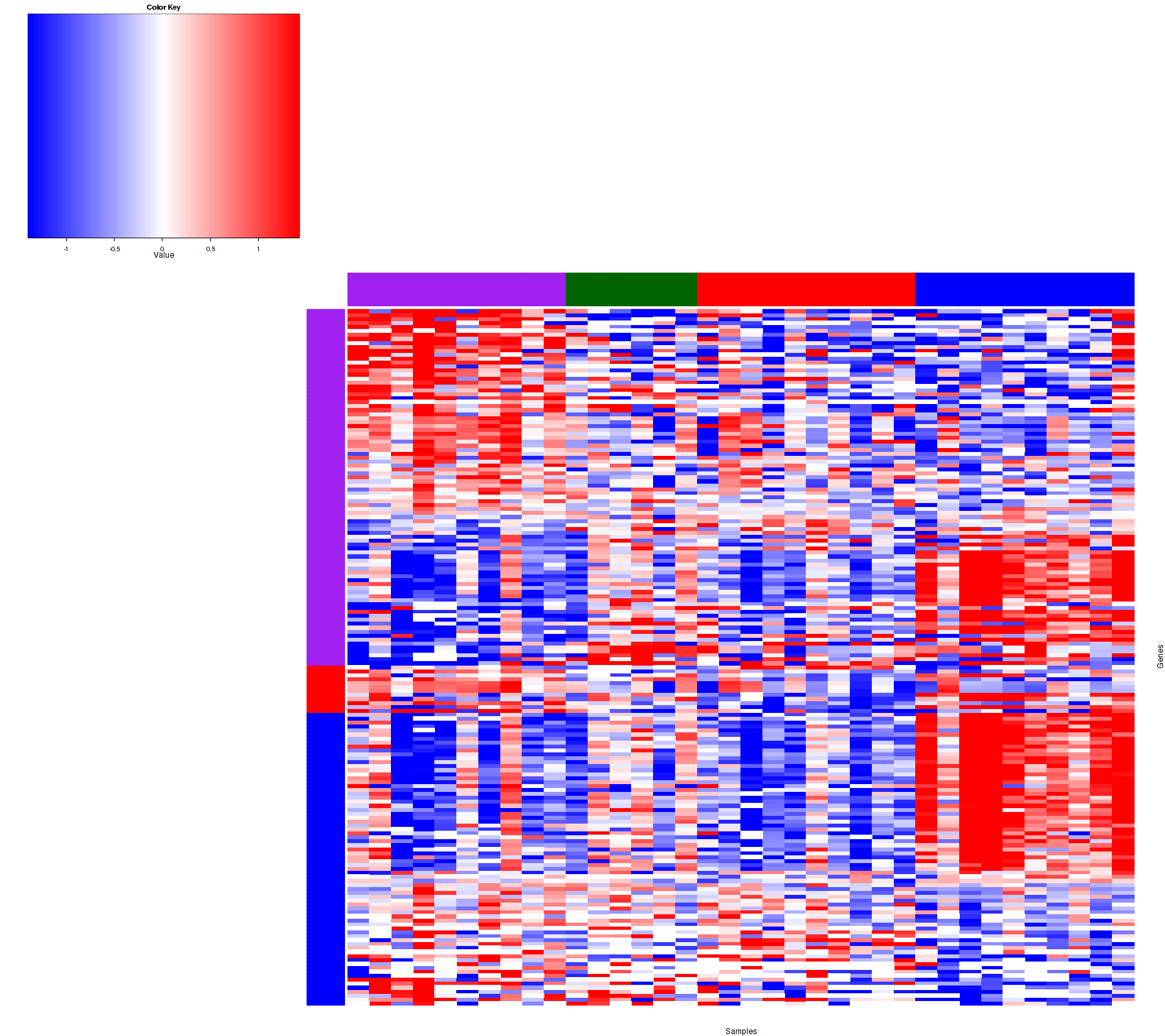 Figure 1. Get High-res Image Samples were separated into 4 clusters. Shown are 36 samples and 176 marker miRs. The color bar of the row indicates the marker miRs for the corresponding cluster.