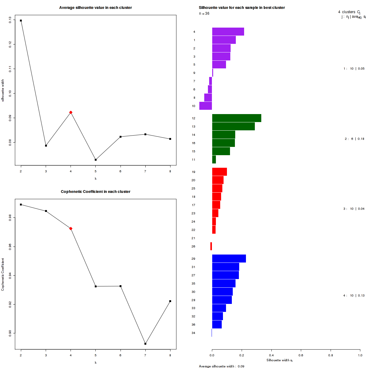 The most robust consensus NMF clustering of 36 samples using the 150 most variable miRs was identified for k = 4 clusters. We computed the clustering for k = 2 to k = 10 and uused the cophenetic correlation coefficient and the average silhouette width calculation to determine the robust clusters.