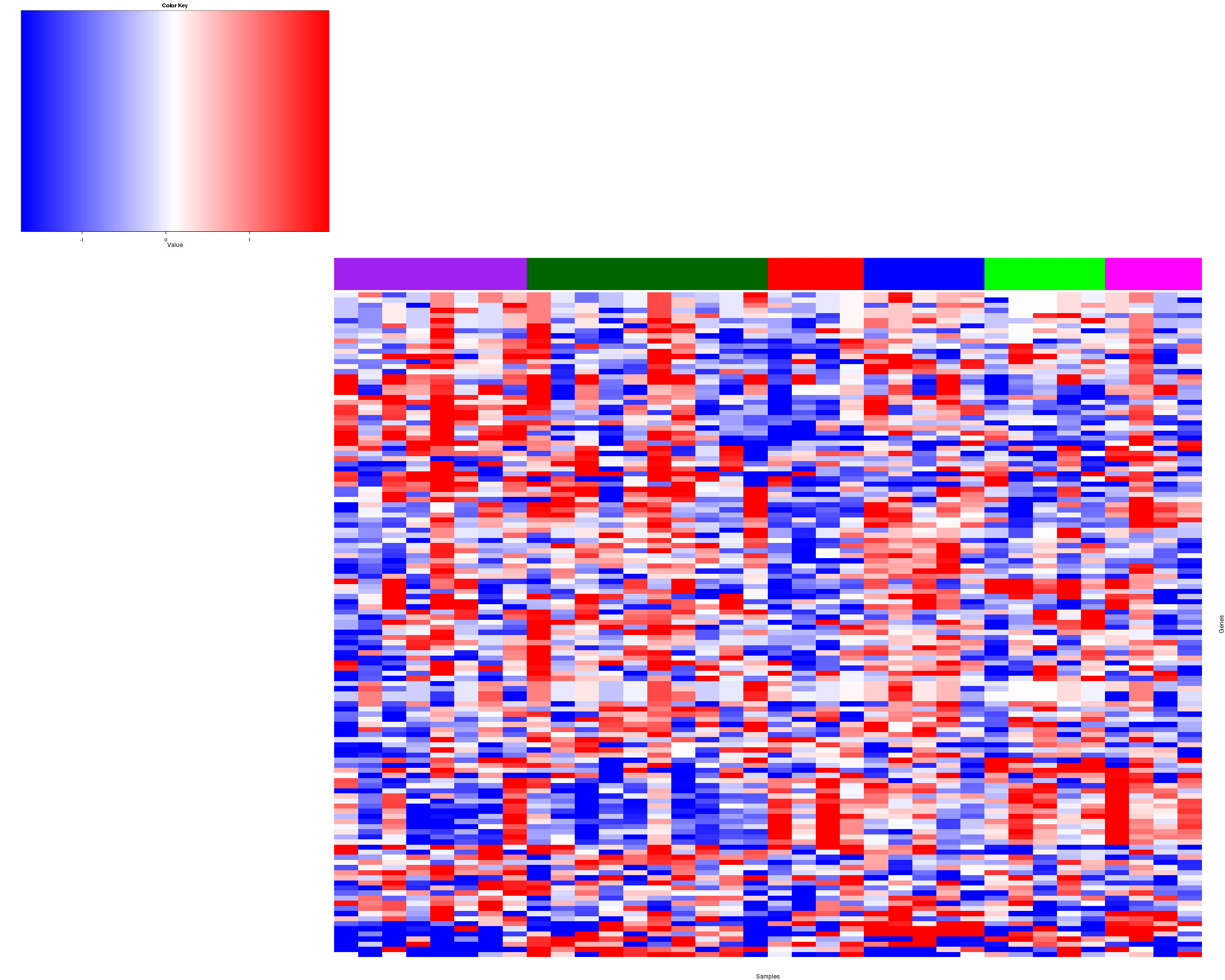 Figure 1. Get High-res Image Samples were separated into 6 clusters. Shown are 36 samples and 56 marker miRs. The color bar of the row indicates the marker miRs for the corresponding cluster.