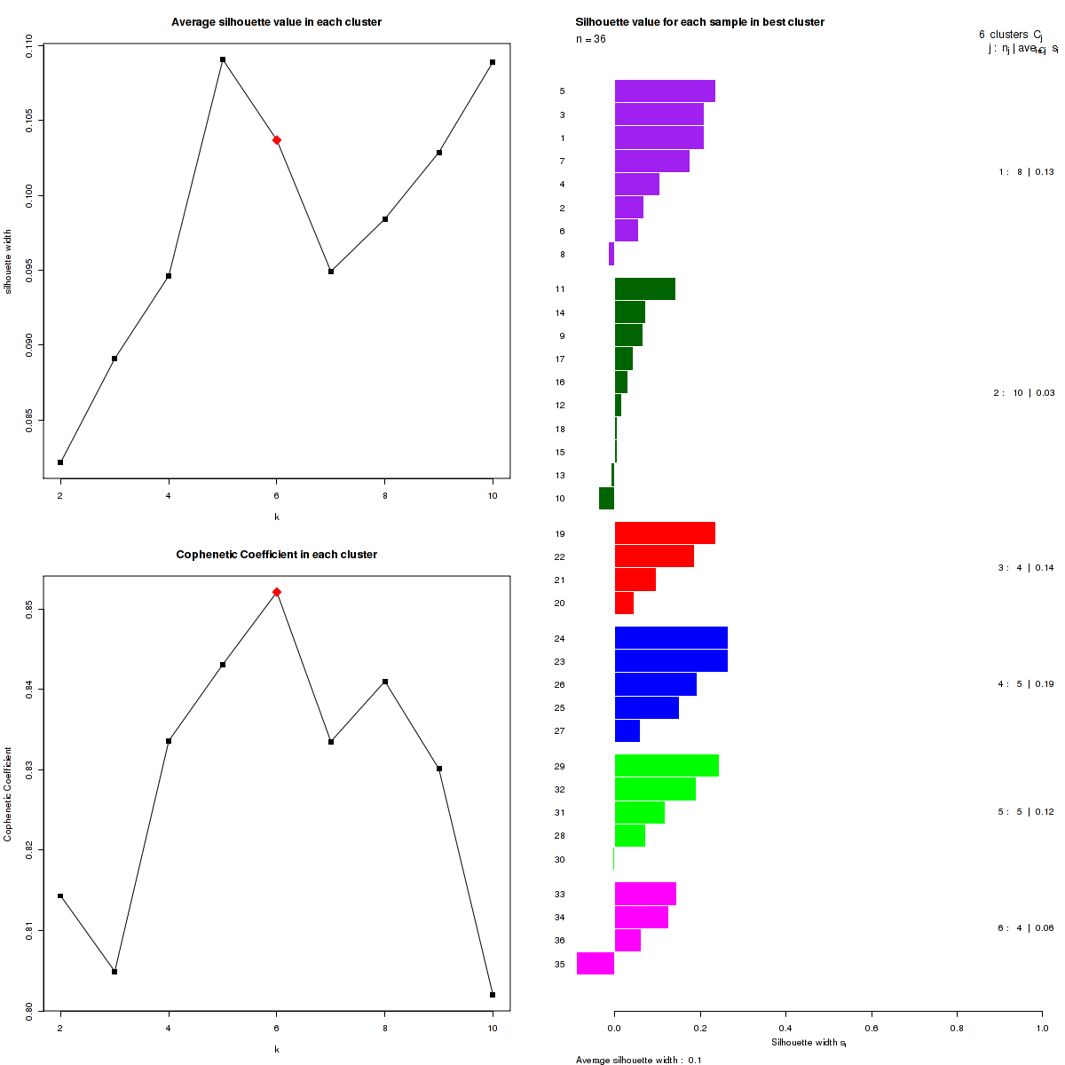 The cophenetic correlation coefficients and average silhouette values are used to determine the k with the most robust clusterings. From the plot of cophenetic correlation versus k, we select modes and the the point preceding the greatest decrease in cophenetic correlation coefficient, and from these choose the k with the highest average silhouette value.