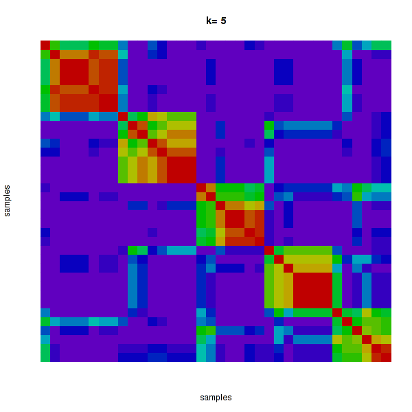 Figure 4. Get High-res Image The consensus matrix after clustering shows 5 clusters with limited overlap between clusters.