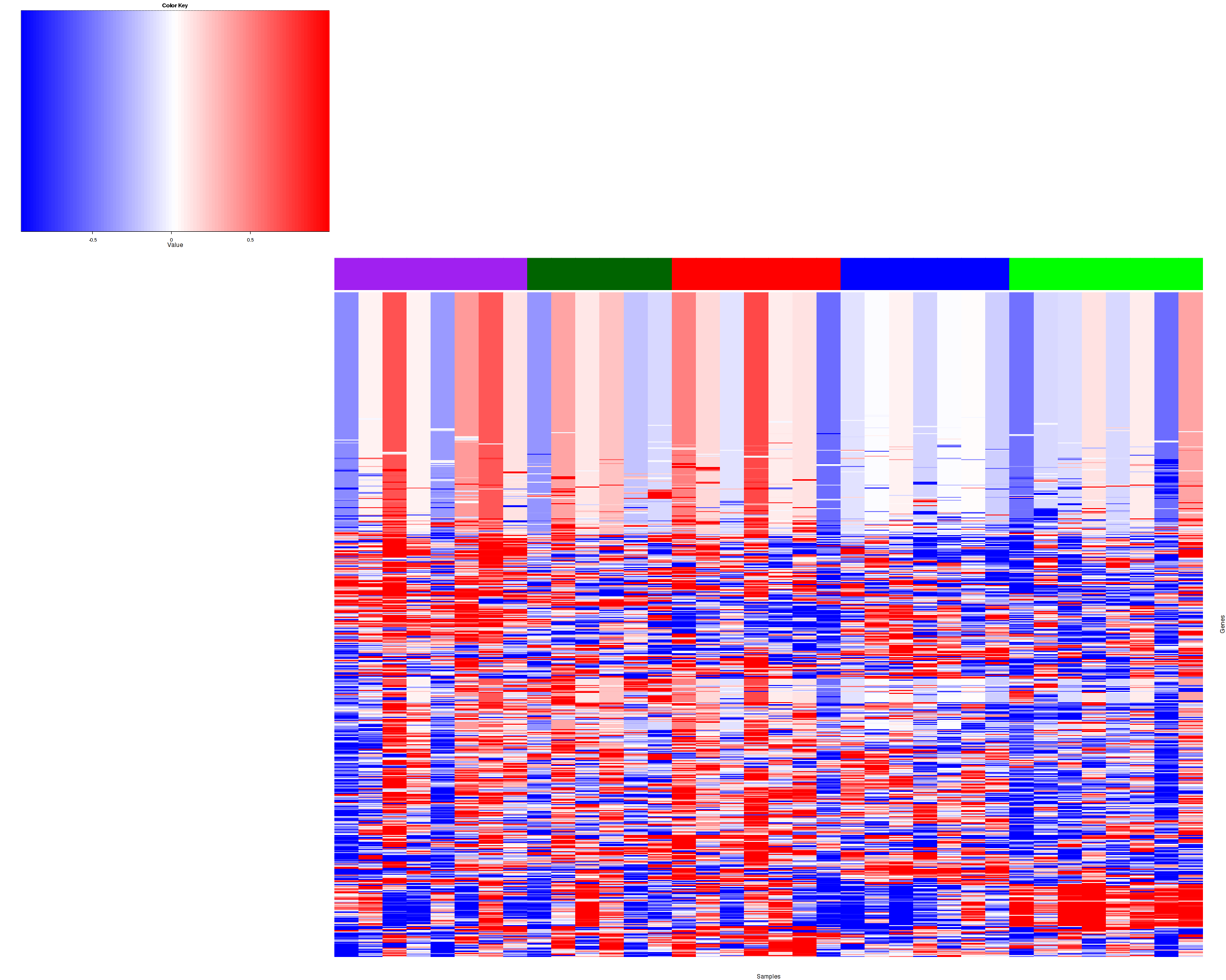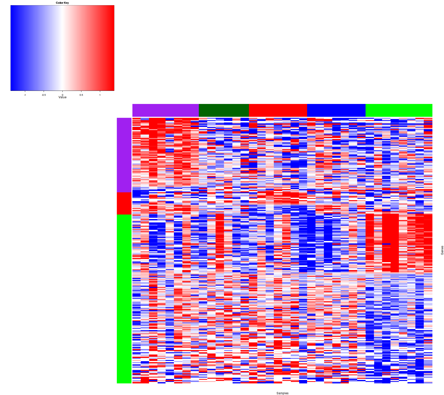 Figure 1. Get High-res Image Samples were separated into 5 clusters. Shown are 36 samples and 239 marker miRs. The color bar of the row indicates the marker miRs for the corresponding cluster.