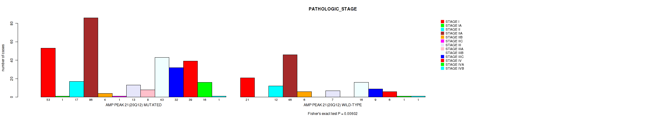 amp_20q12 cnv correlated to 'PATHOLOGIC_STAGE', 'PATHOLOGY_N_STAGE', 'PATHOLOGY_M_STAGE', 'HISTOLOGICAL_TYPE', and 'NUMBER_OF_LYMPH_NODES'.