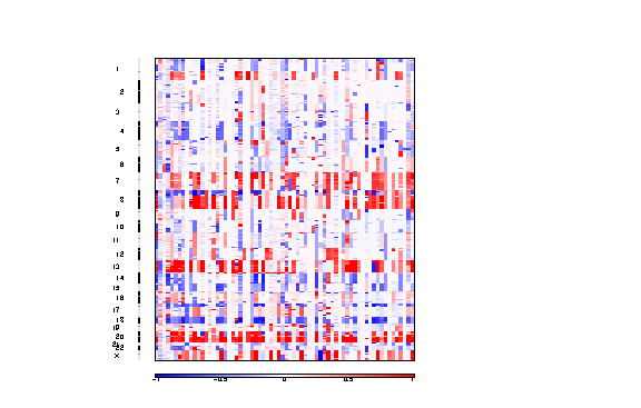 A table of chromosome arm amplification levels for each sample. Each row is a chromosome arm, and each column a sample. The data are in units of absolute copy number -2.