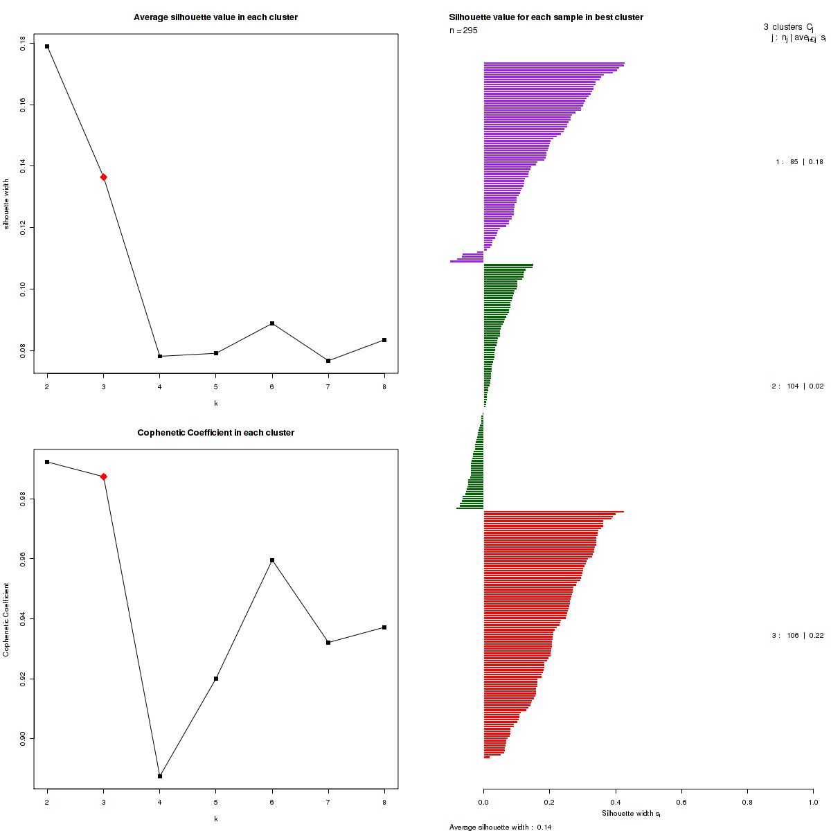 Figure 3. Get High-res Image The silhouette width was calculated for each sample and each value of k. The left upper panel shows the average silhouette width across all samples for each tested k (left upper panel). The left lower panel shows the Cophenetic Correlation Coefficients for each tested k. The right panel shows assignments of clusters to samples and the silhouette width of each sample for the most robust clustering.