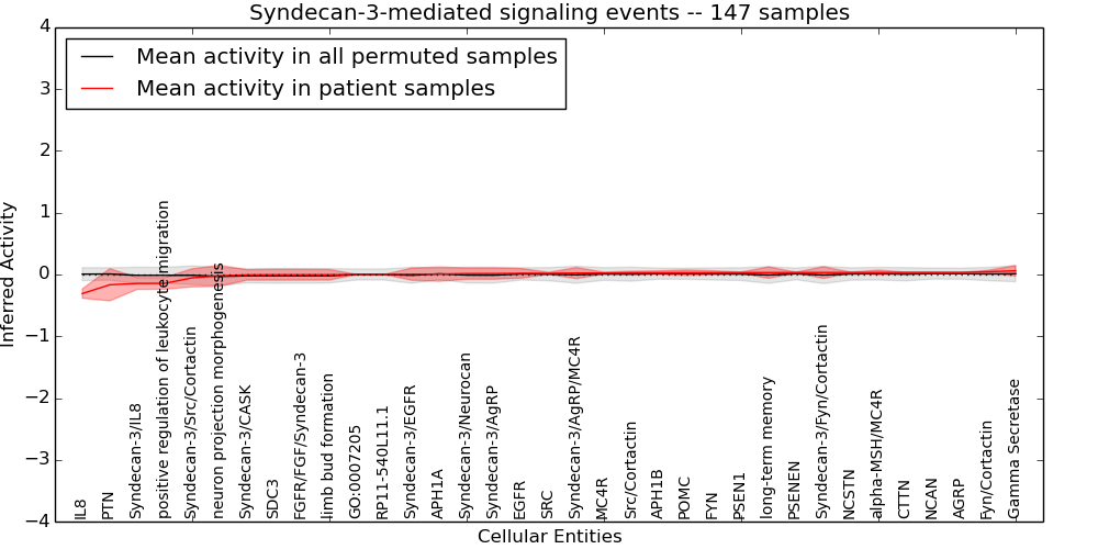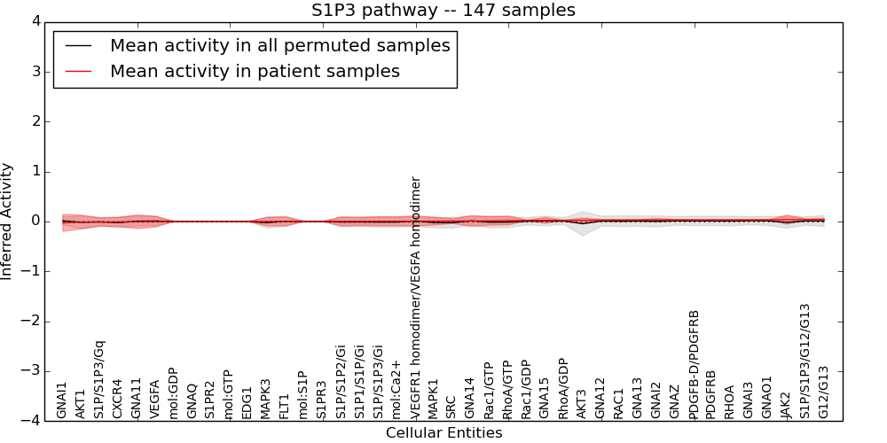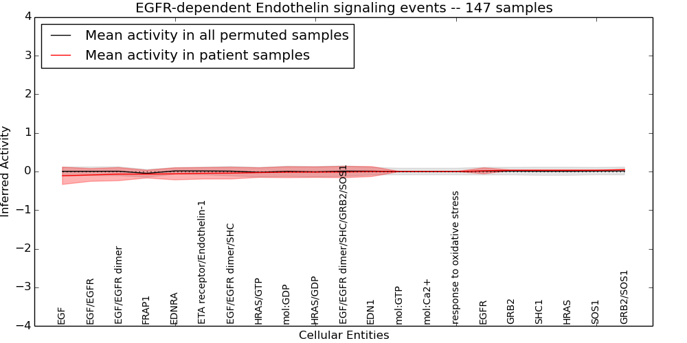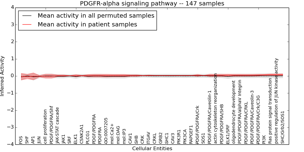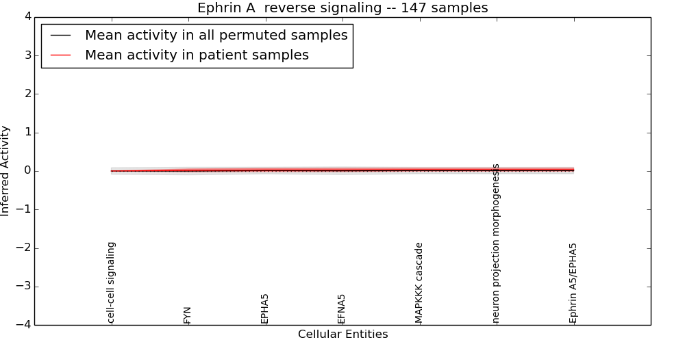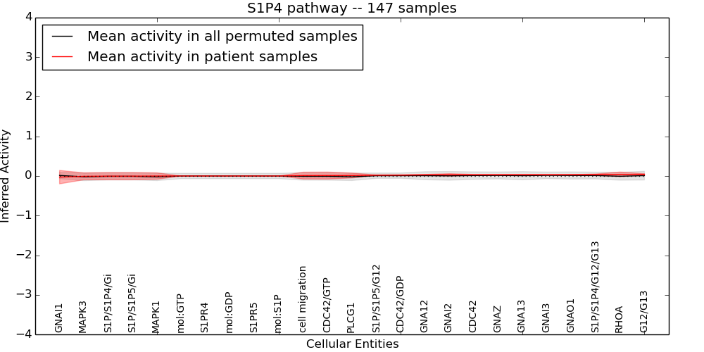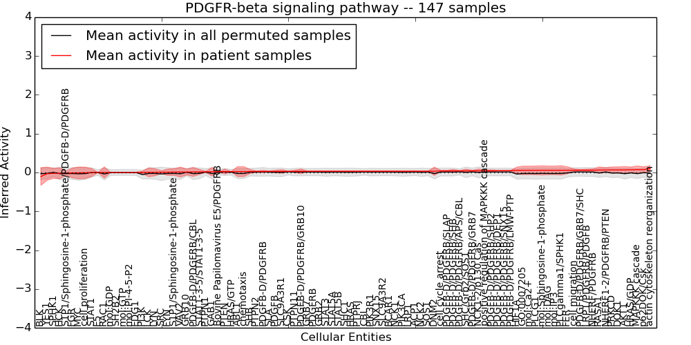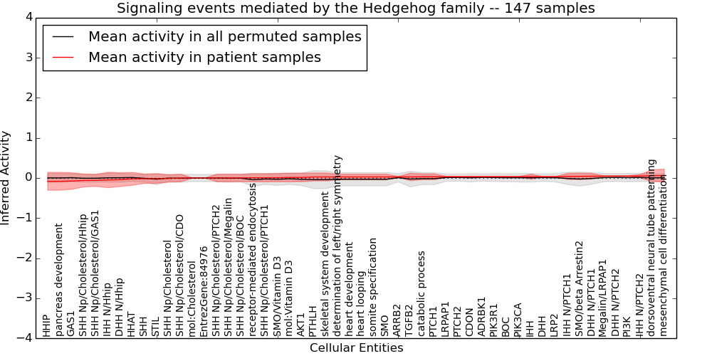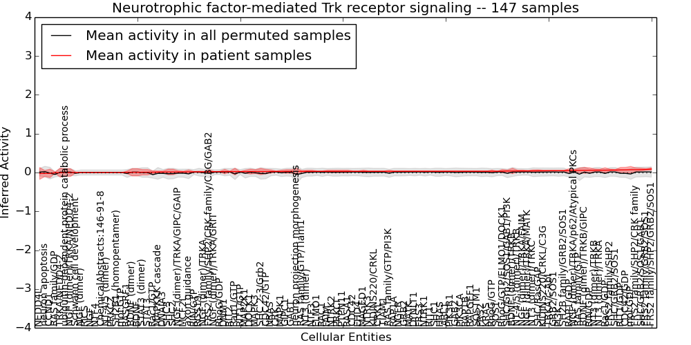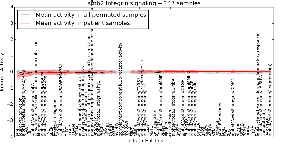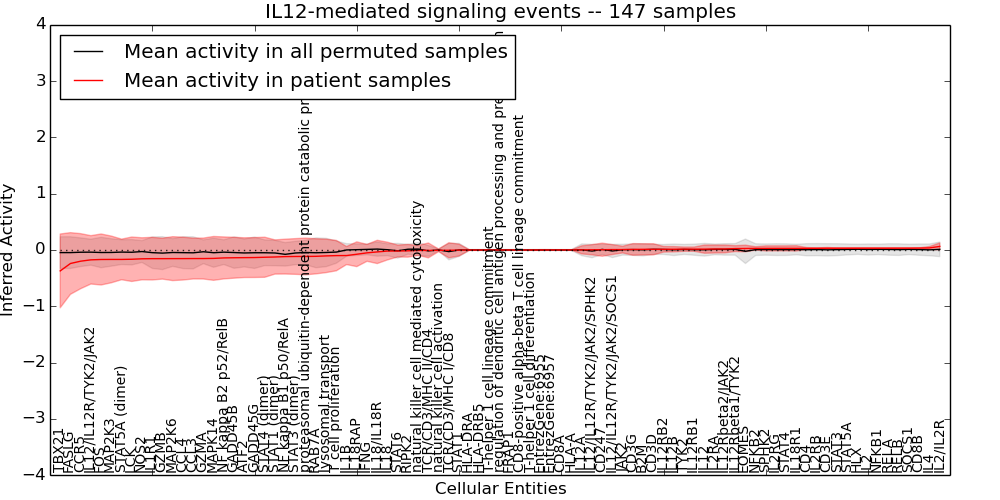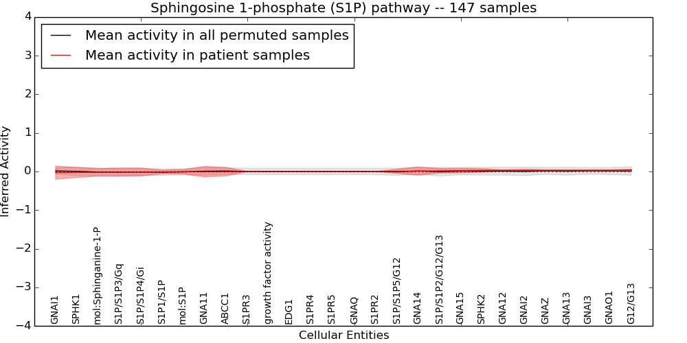 Figure S131.  Get High-res Image This plot shows pathway concept perturbations across all samples against a permutation model. The concepts along the x-axis are sorted by lowest to highest mean activity for the real patient samples. Mean inferred activities are plotted along the y-axis as a colored band showing the average level and one standard deviation range. Real samples are shown in red and permuted samples in black.