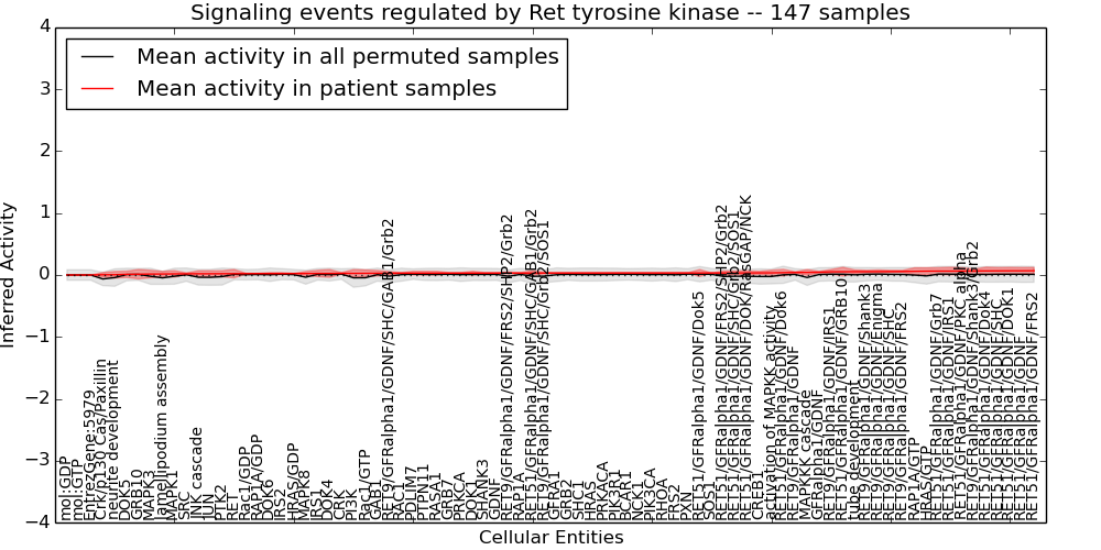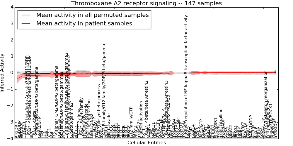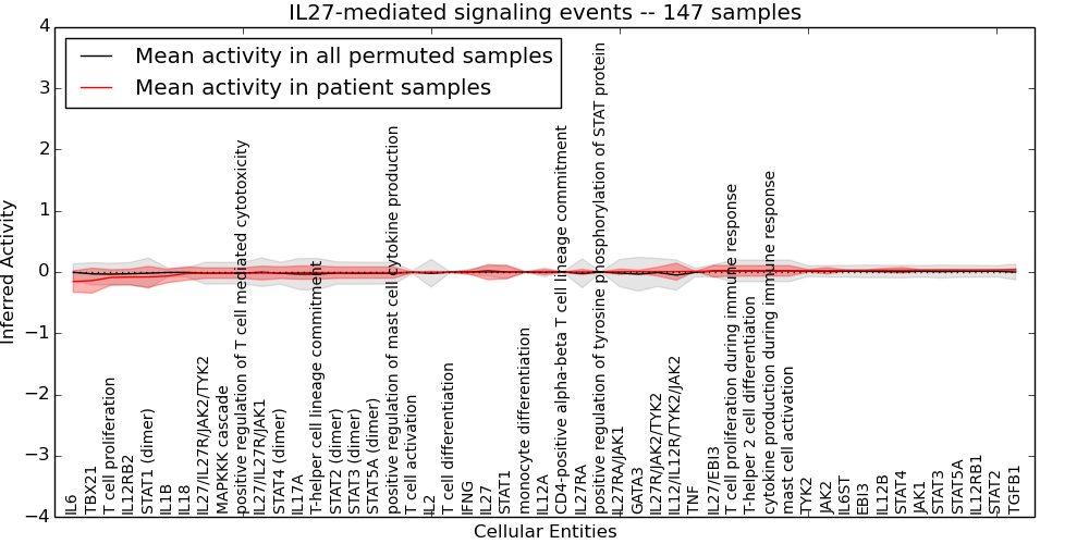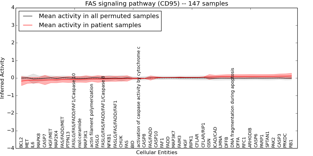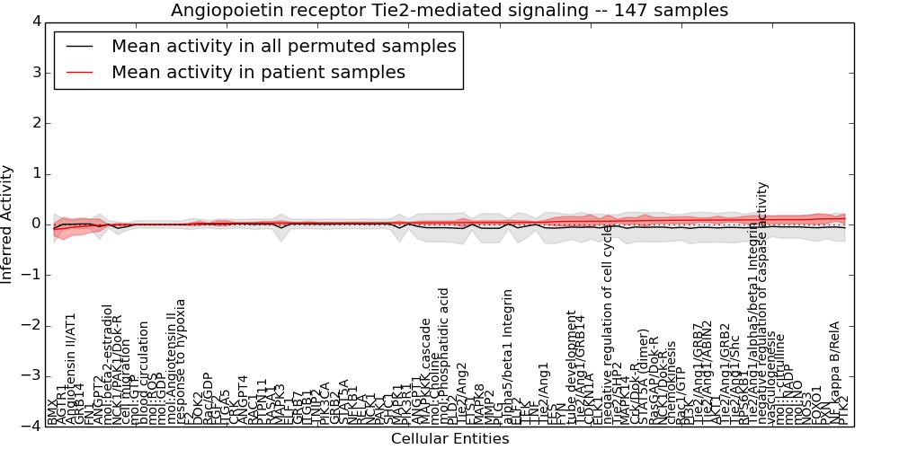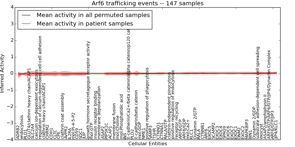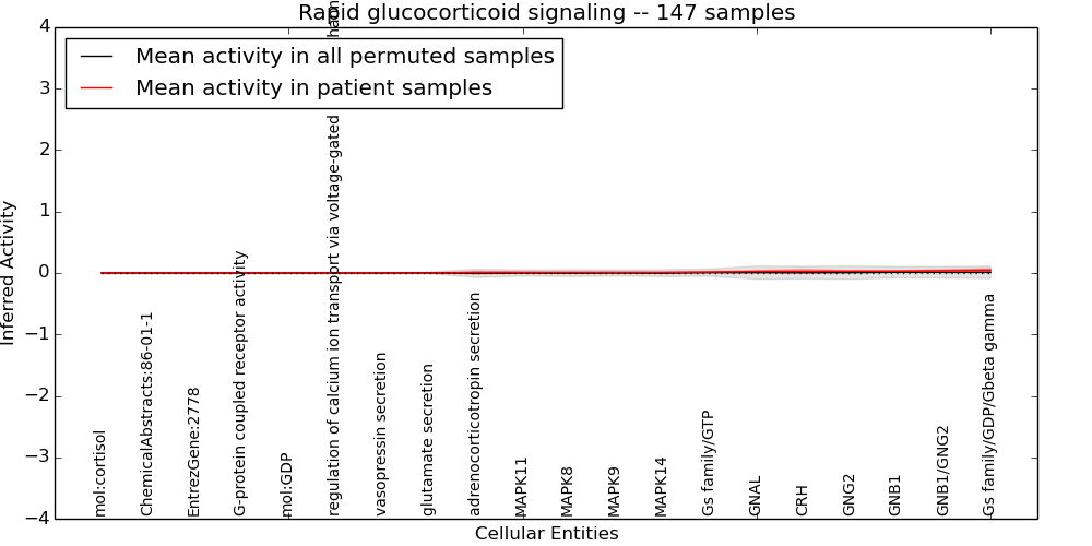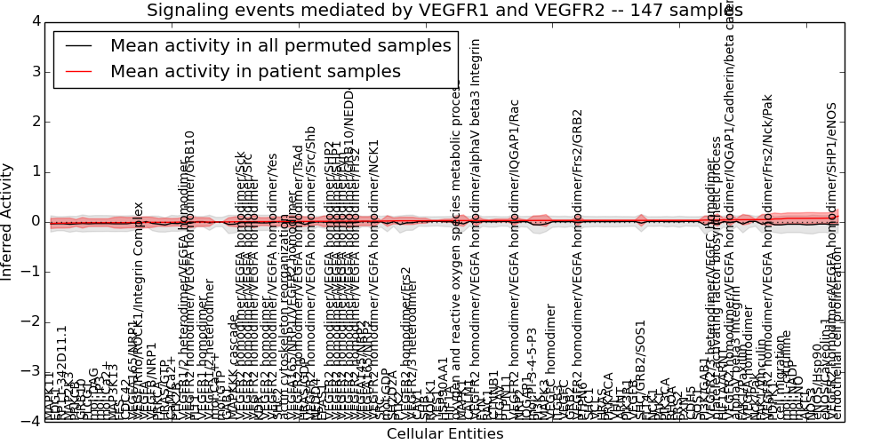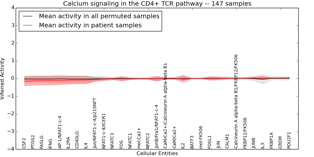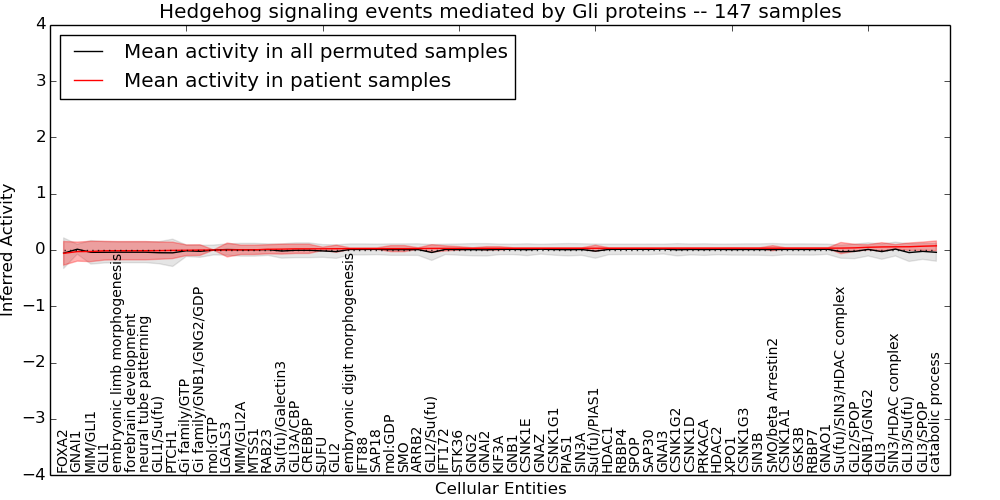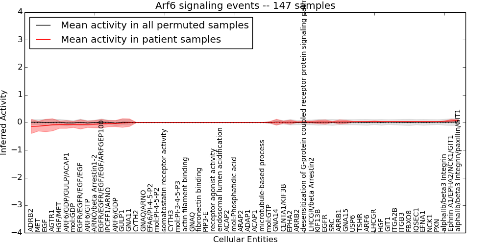 Figure S131.  Get High-res Image This plot shows pathway concept perturbations across all samples against a permutation model. The concepts along the x-axis are sorted by lowest to highest mean activity for the real patient samples. Mean inferred activities are plotted along the y-axis as a colored band showing the average level and one standard deviation range. Real samples are shown in red and permuted samples in black.