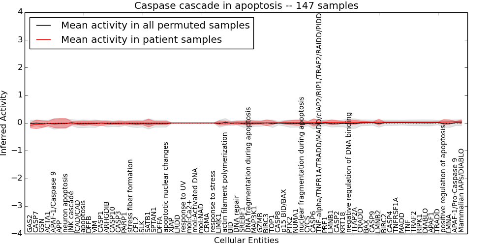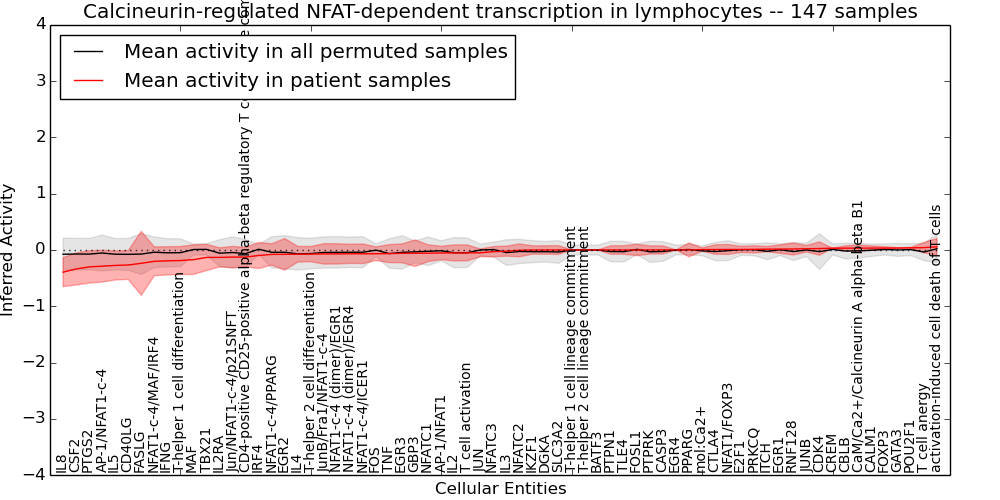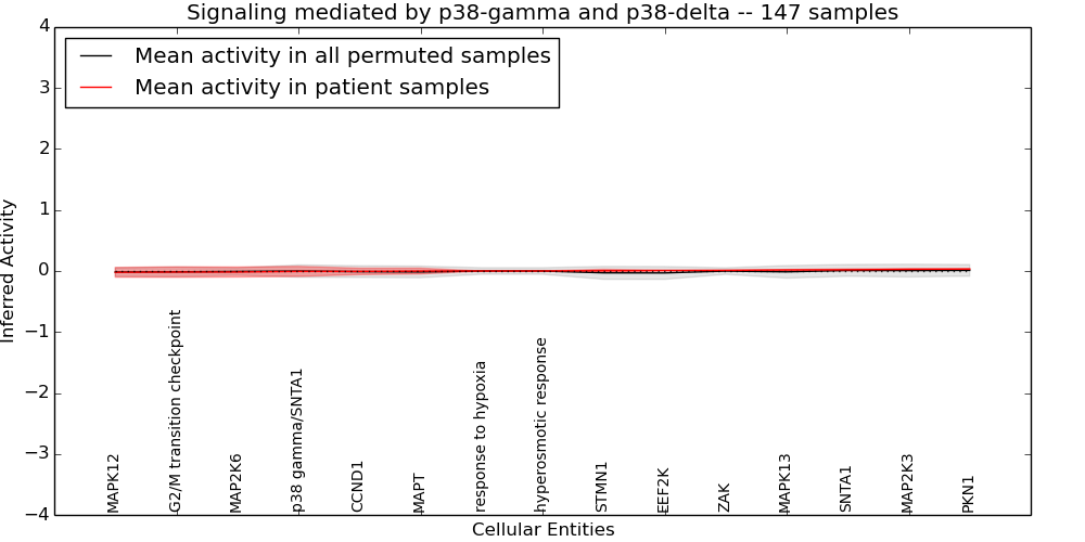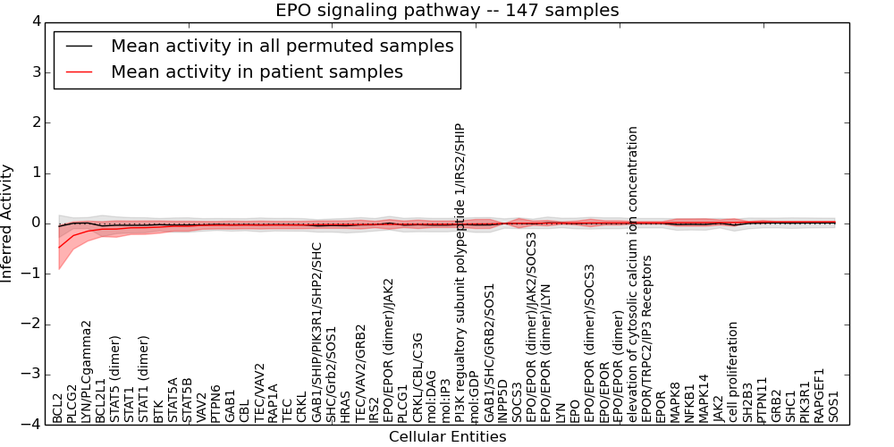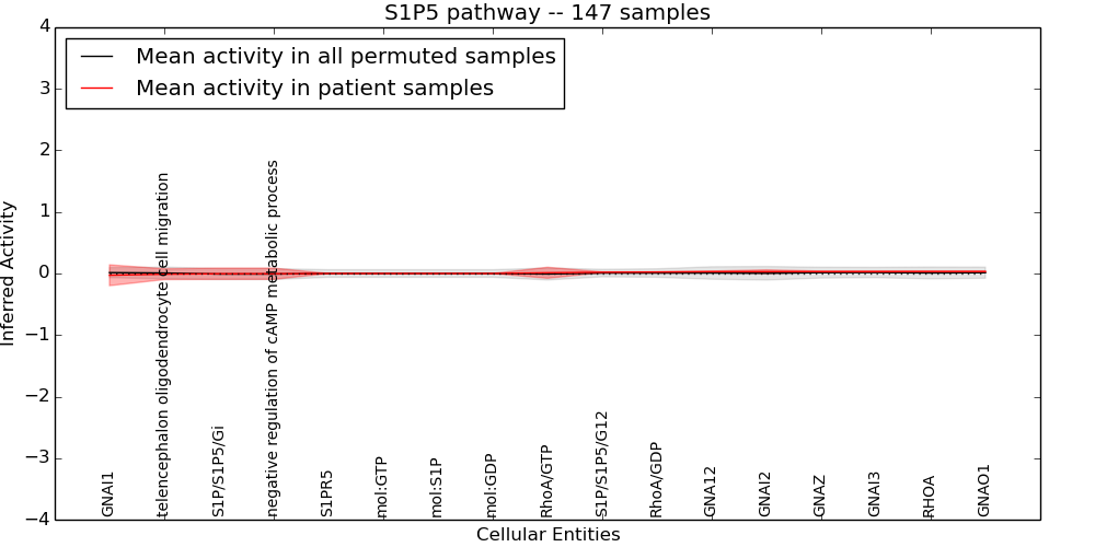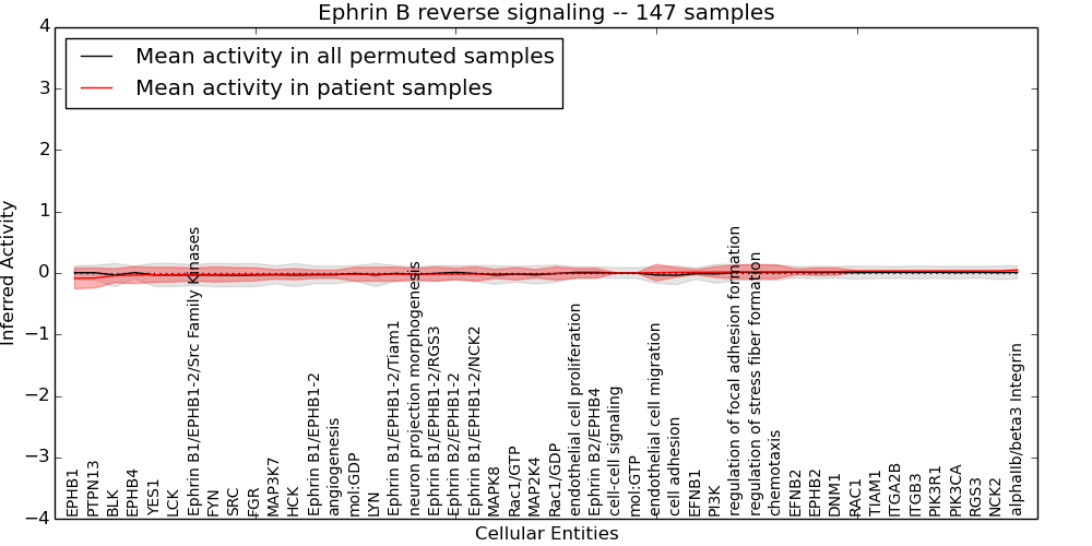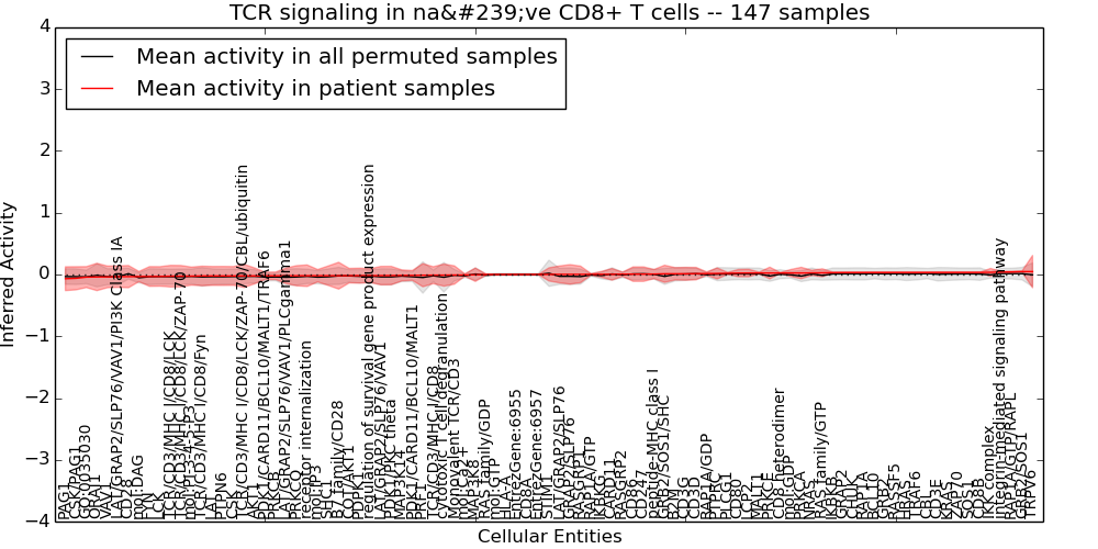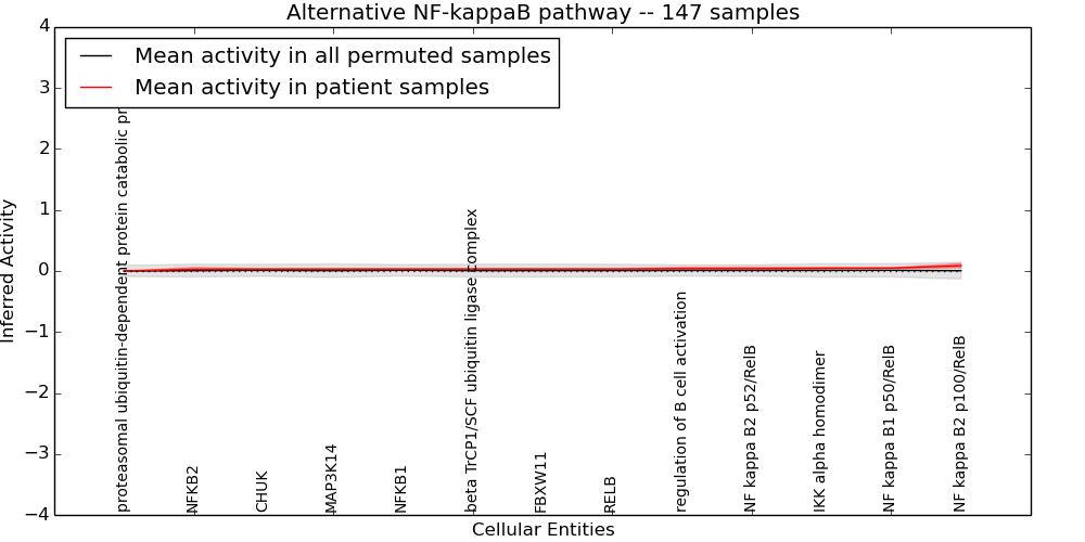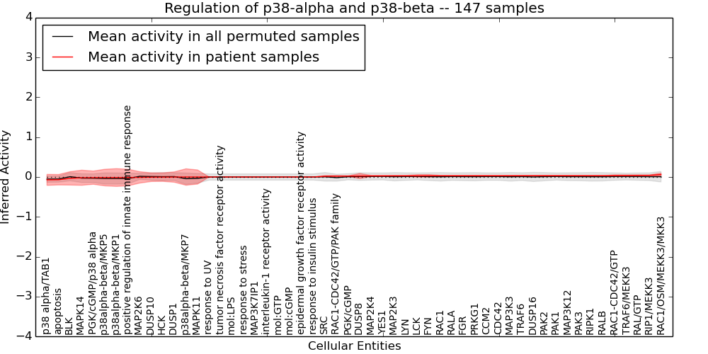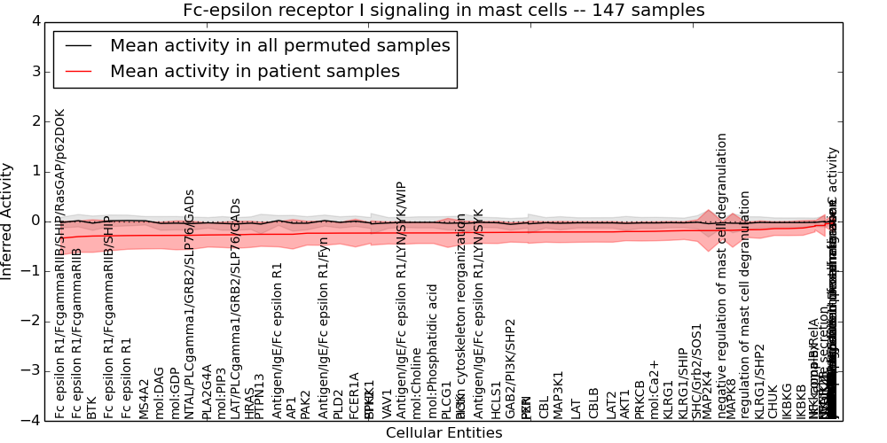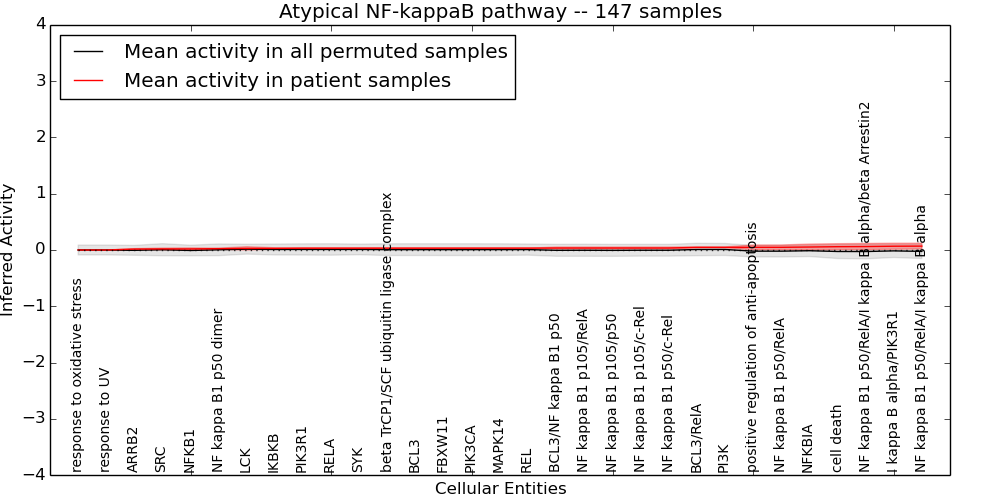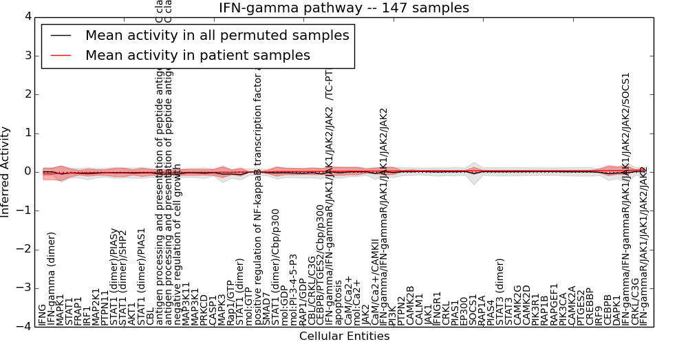 Figure S131.  Get High-res Image This plot shows pathway concept perturbations across all samples against a permutation model. The concepts along the x-axis are sorted by lowest to highest mean activity for the real patient samples. Mean inferred activities are plotted along the y-axis as a colored band showing the average level and one standard deviation range. Real samples are shown in red and permuted samples in black.