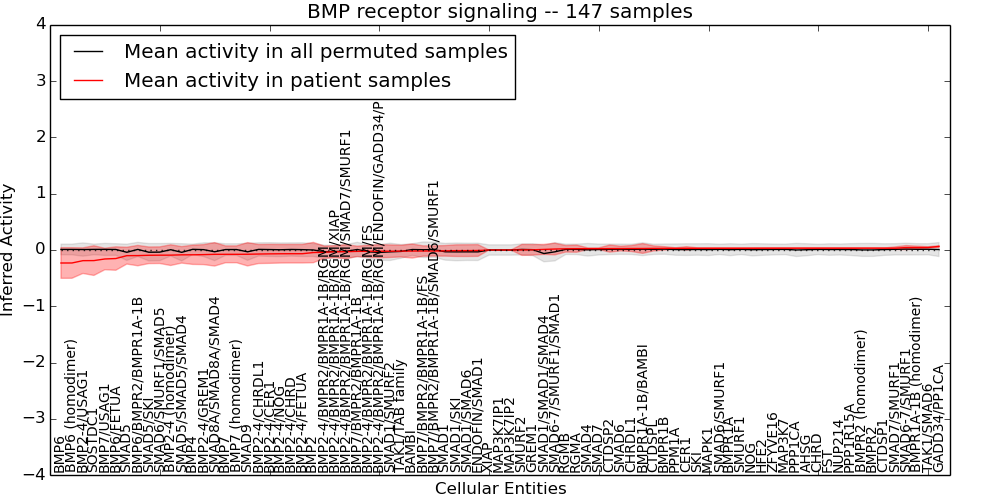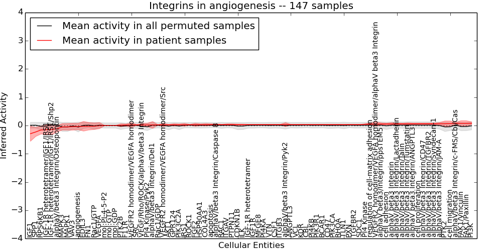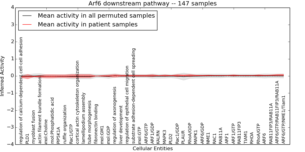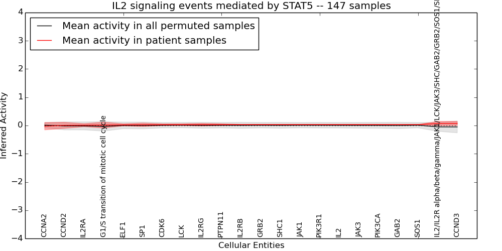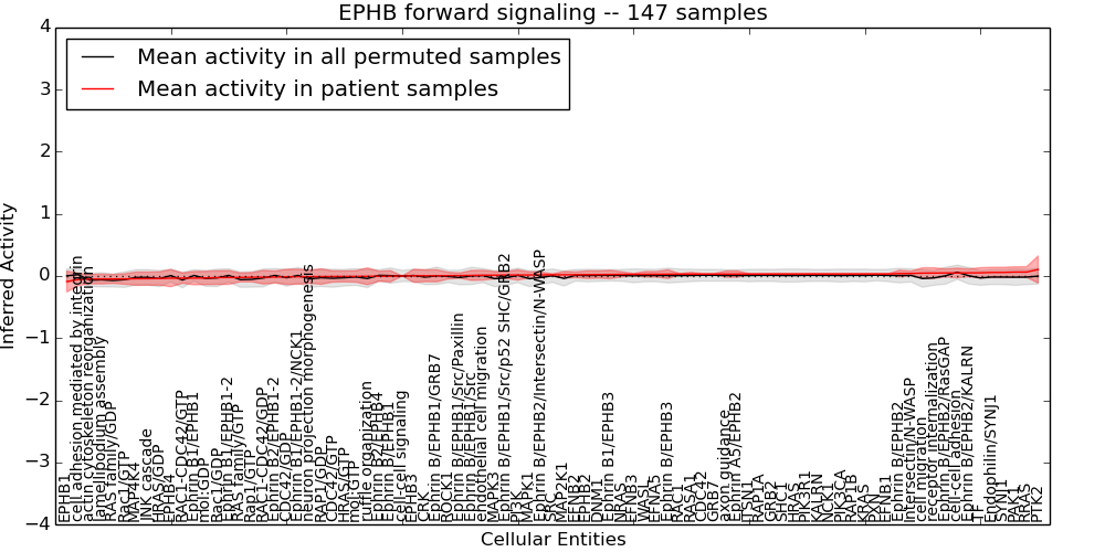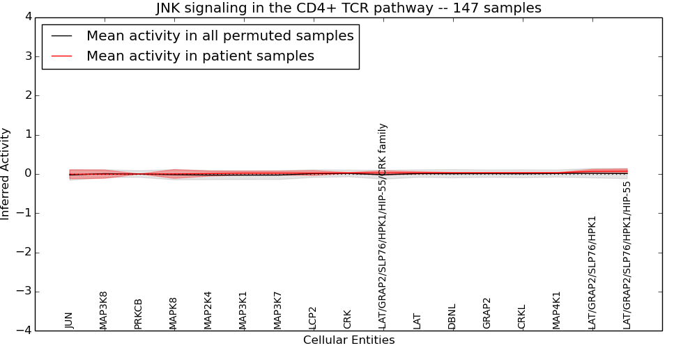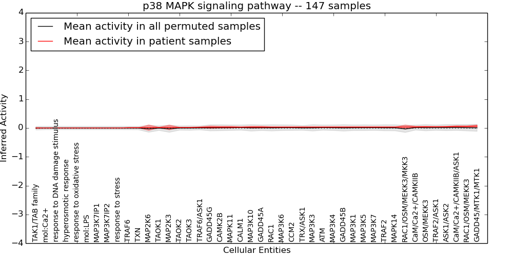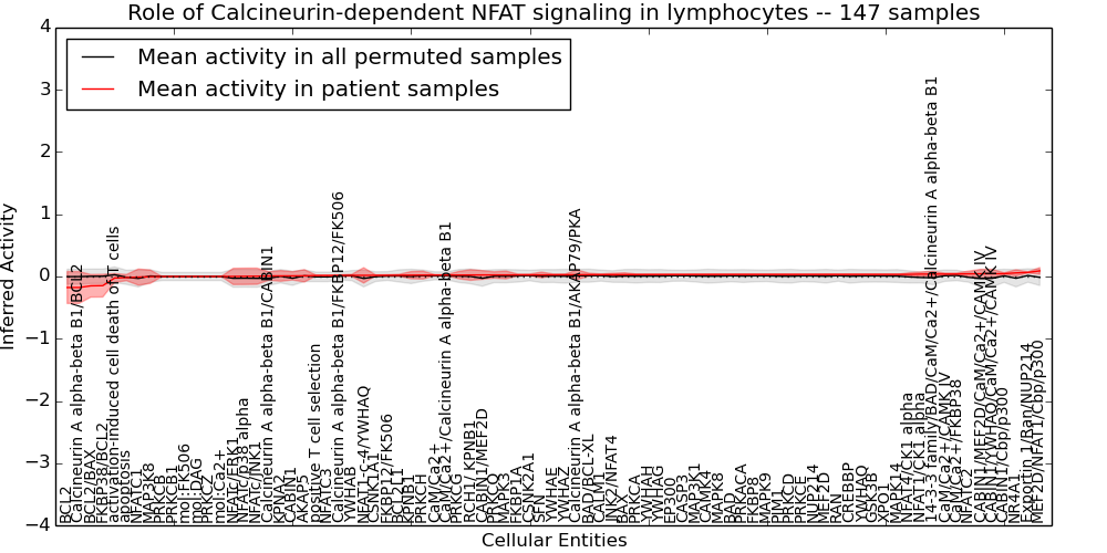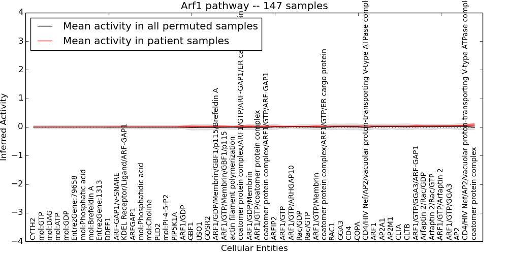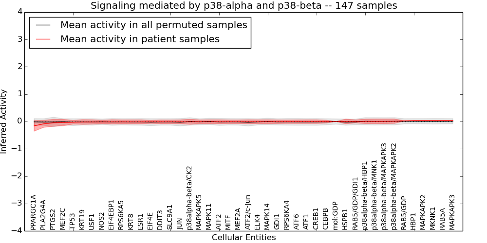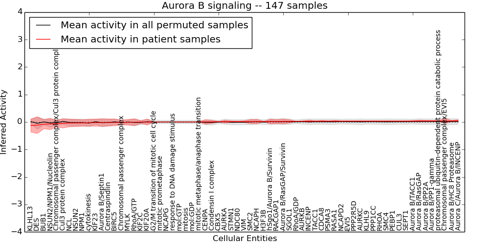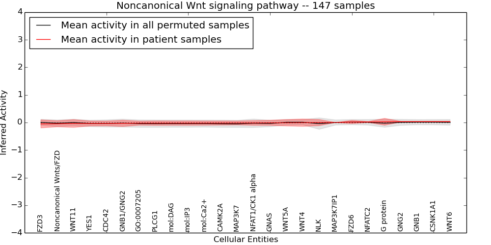 Figure S131.  Get High-res Image This plot shows pathway concept perturbations across all samples against a permutation model. The concepts along the x-axis are sorted by lowest to highest mean activity for the real patient samples. Mean inferred activities are plotted along the y-axis as a colored band showing the average level and one standard deviation range. Real samples are shown in red and permuted samples in black.