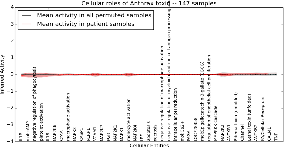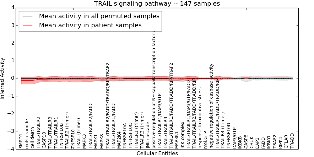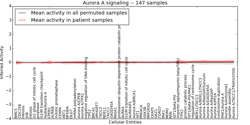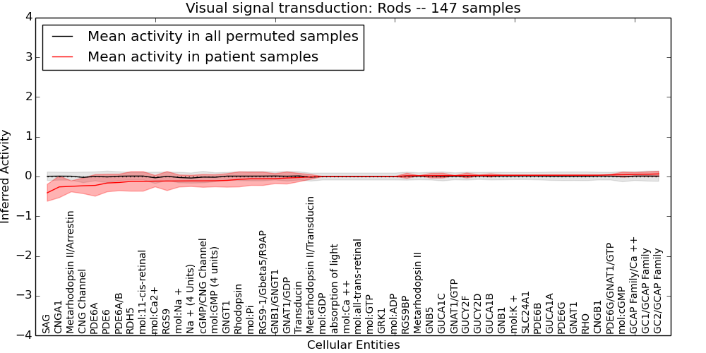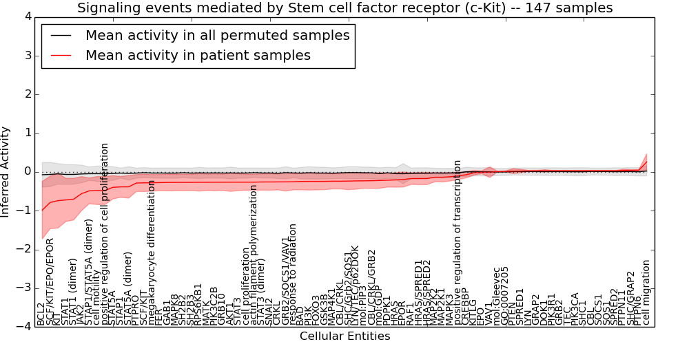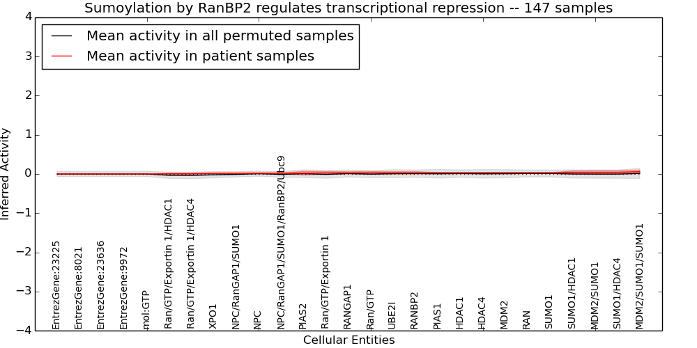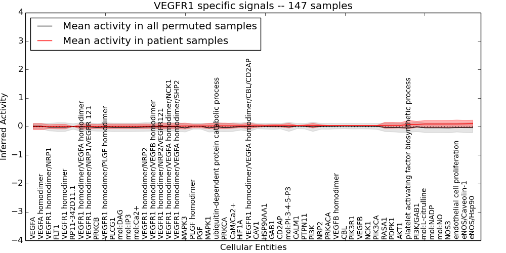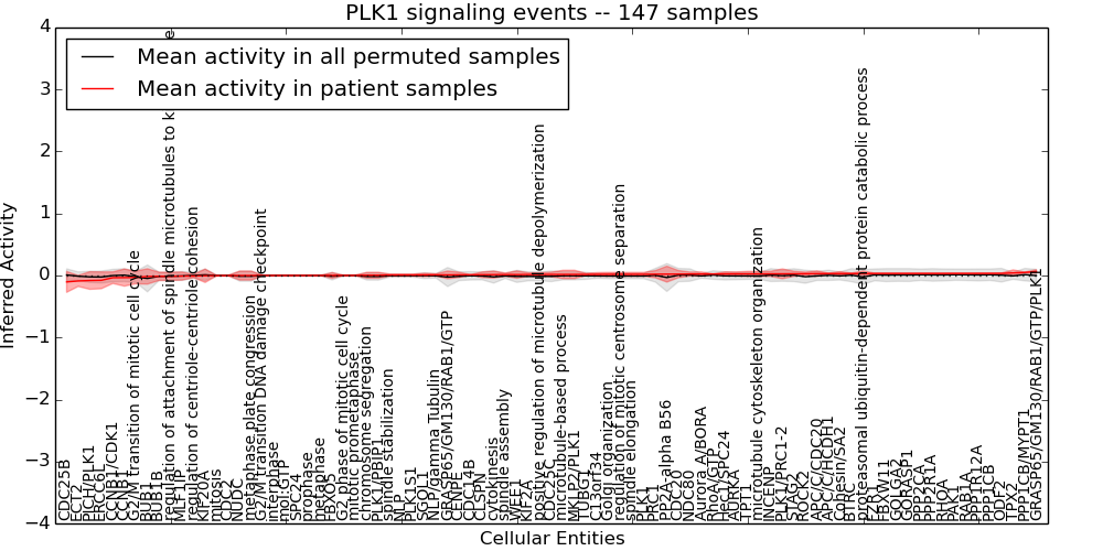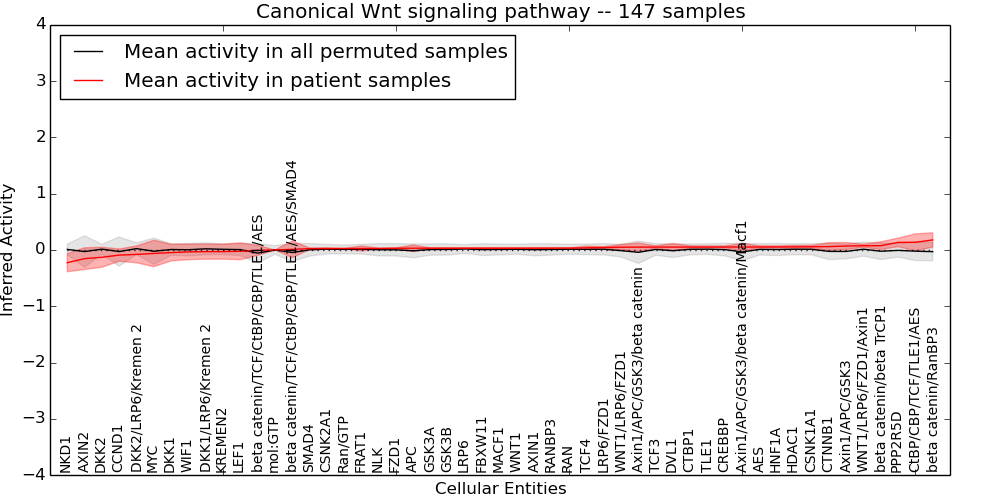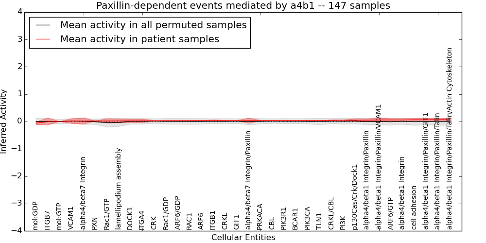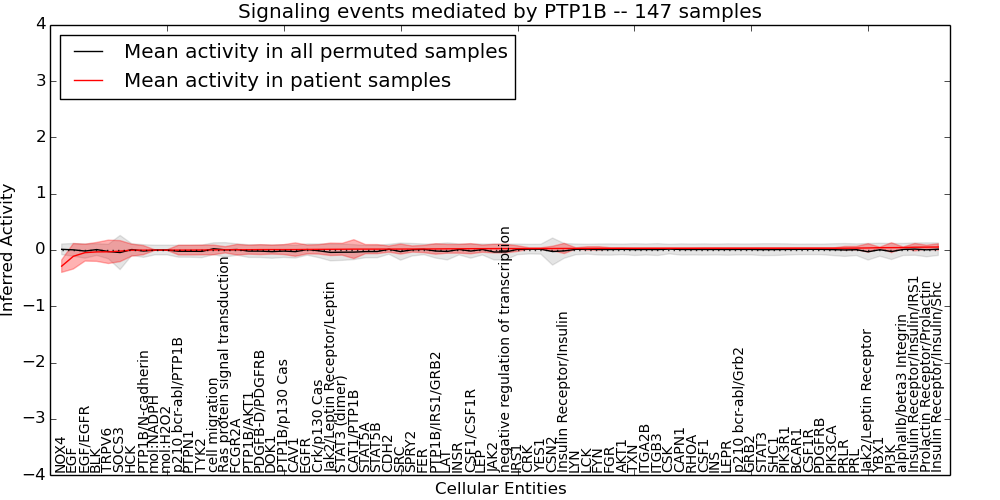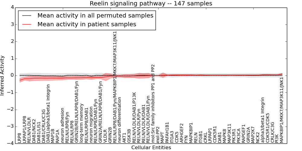 Figure S131.  Get High-res Image This plot shows pathway concept perturbations across all samples against a permutation model. The concepts along the x-axis are sorted by lowest to highest mean activity for the real patient samples. Mean inferred activities are plotted along the y-axis as a colored band showing the average level and one standard deviation range. Real samples are shown in red and permuted samples in black.
