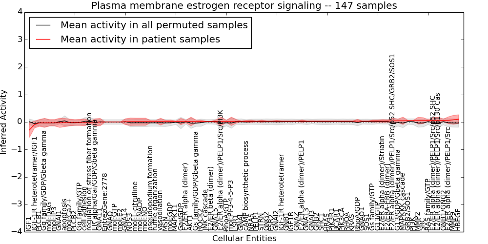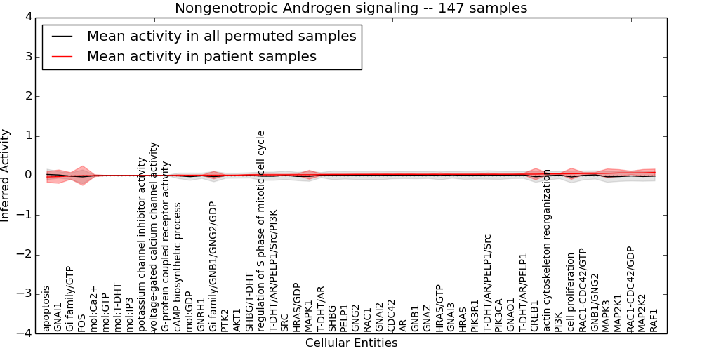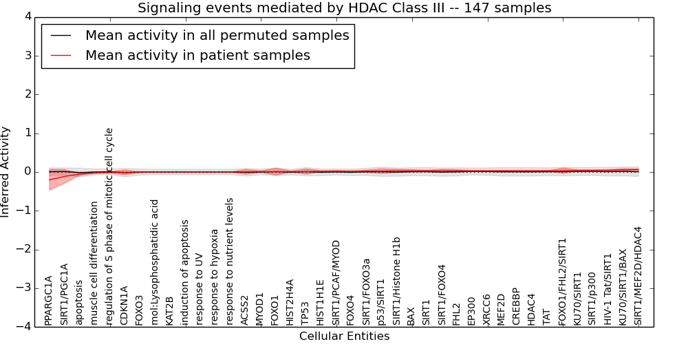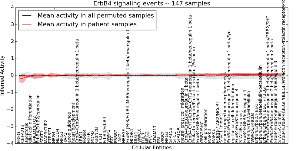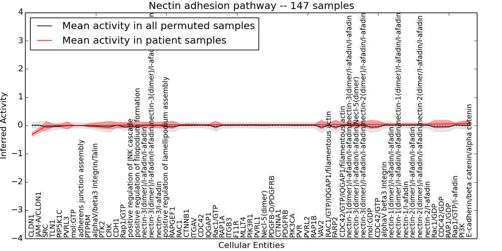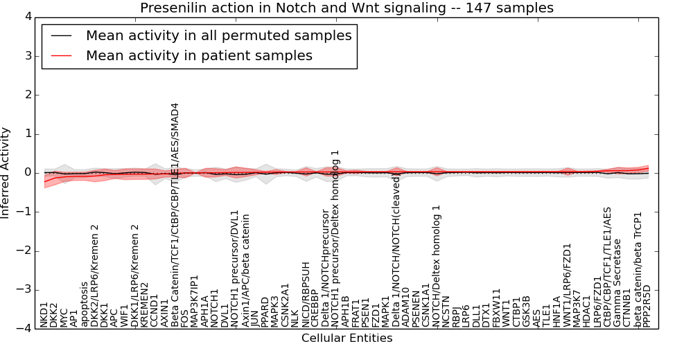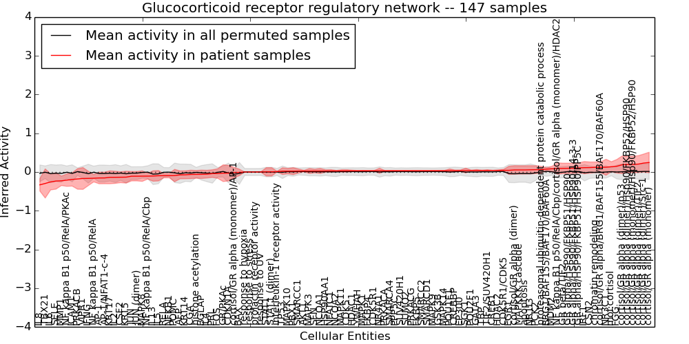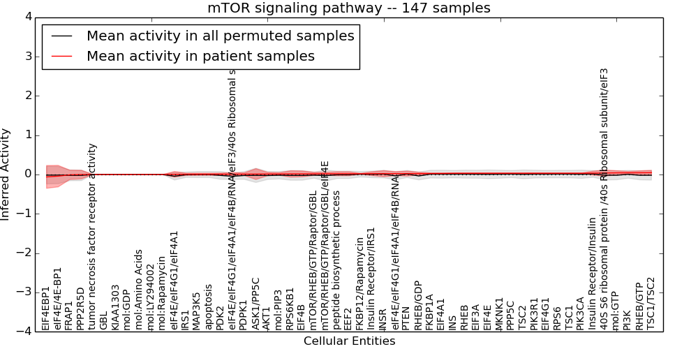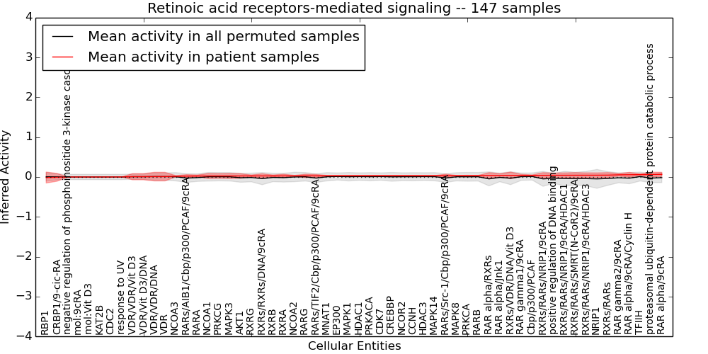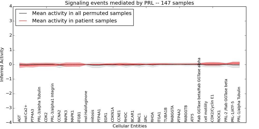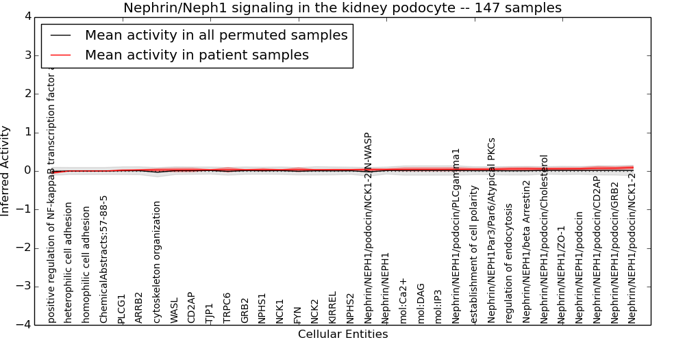 Figure S131.  Get High-res Image This plot shows pathway concept perturbations across all samples against a permutation model. The concepts along the x-axis are sorted by lowest to highest mean activity for the real patient samples. Mean inferred activities are plotted along the y-axis as a colored band showing the average level and one standard deviation range. Real samples are shown in red and permuted samples in black.