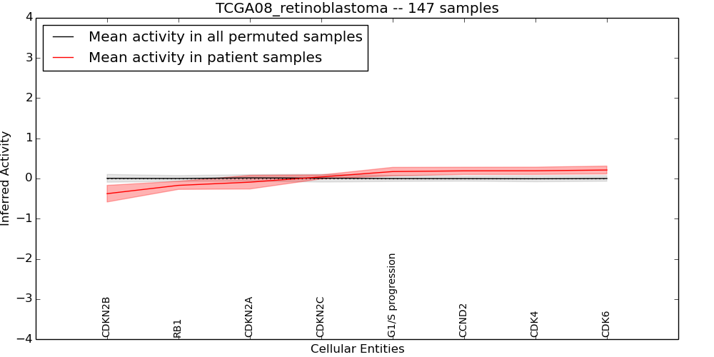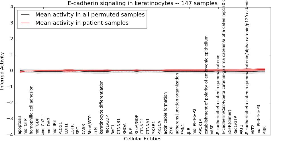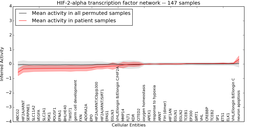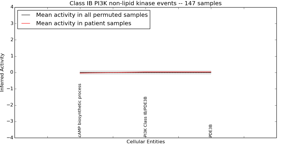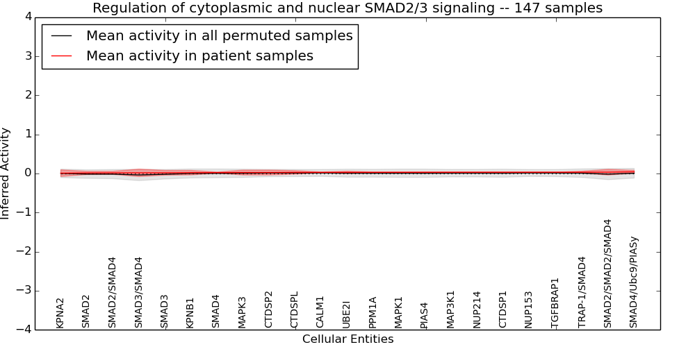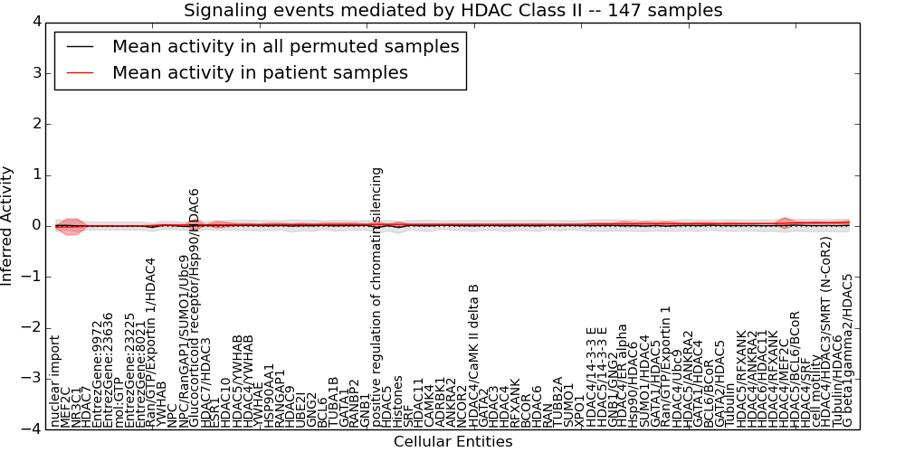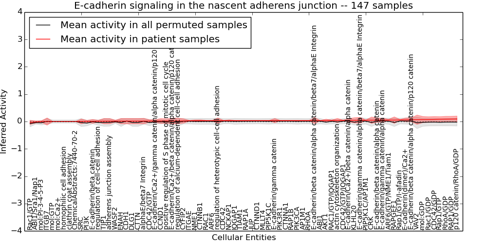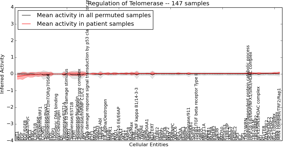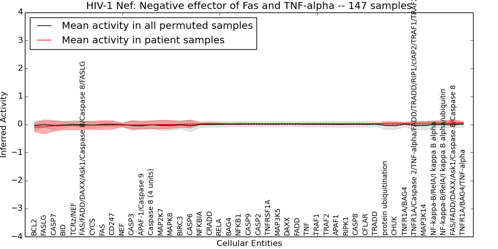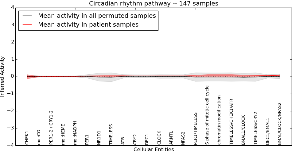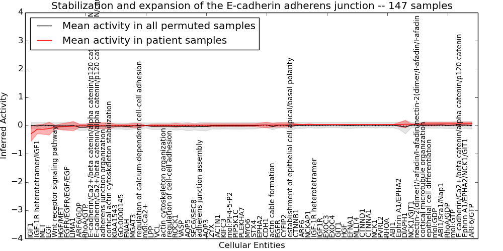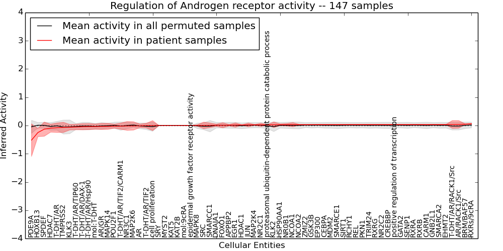 Figure S131.  Get High-res Image This plot shows pathway concept perturbations across all samples against a permutation model. The concepts along the x-axis are sorted by lowest to highest mean activity for the real patient samples. Mean inferred activities are plotted along the y-axis as a colored band showing the average level and one standard deviation range. Real samples are shown in red and permuted samples in black.