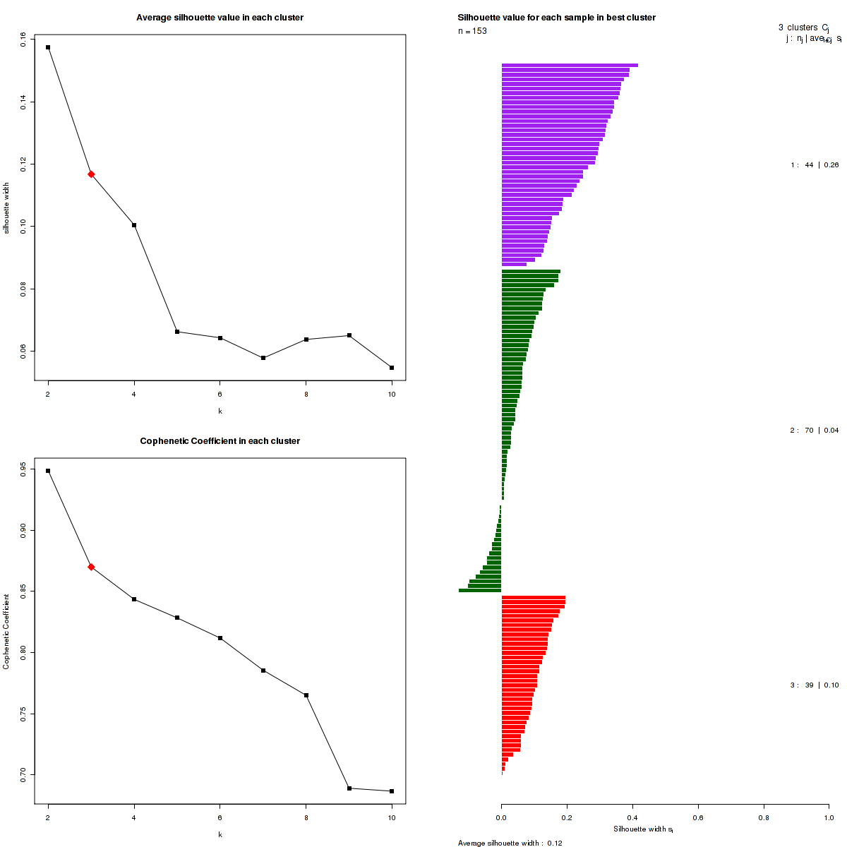 Figure 3. Get High-res Image The silhouette width was calculated for each sample and each value of k. The left upper panel shows the average silhouette width across all samples for each tested k (left upper panel). The left lower panel shows the Cophenetic Correlation Coefficients for each tested k. The right panel shows assignments of clusters to samples and the k silhouette width of each sample for the most robust clustering.