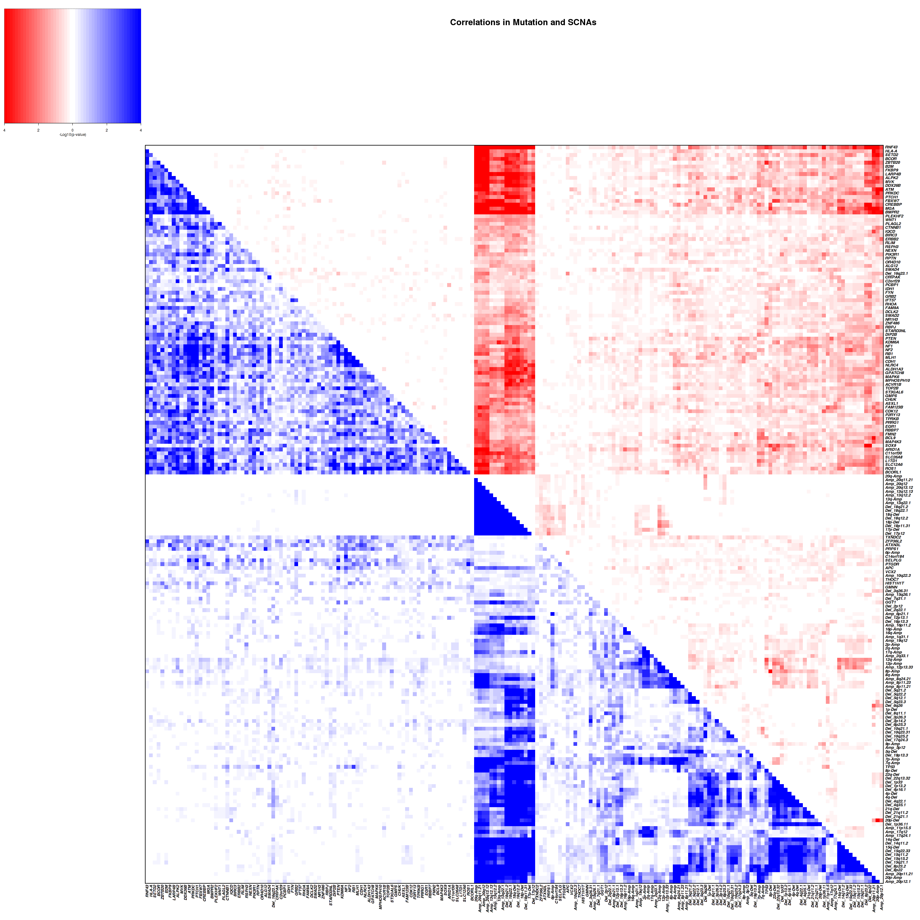 Figure 4. Get High-res Image Co-occurring and mutually-exclusive pairs for all copy number and mutation events. Blue means two events are co-occurring and red means two events are mutually-exclusive.