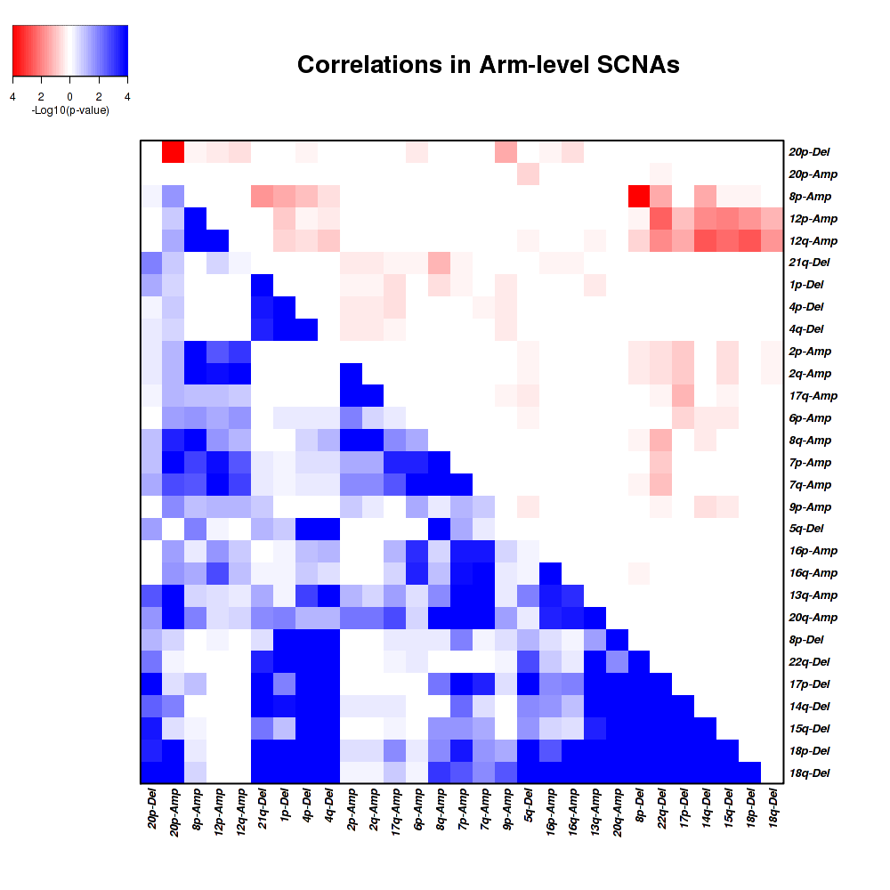 Figure 1. Get High-res Image Co-occurring and mutually-exclusive pairs for copy number variations of arm level events. Blue means two events are co-occurring and red means two events are mutually-exclusive.