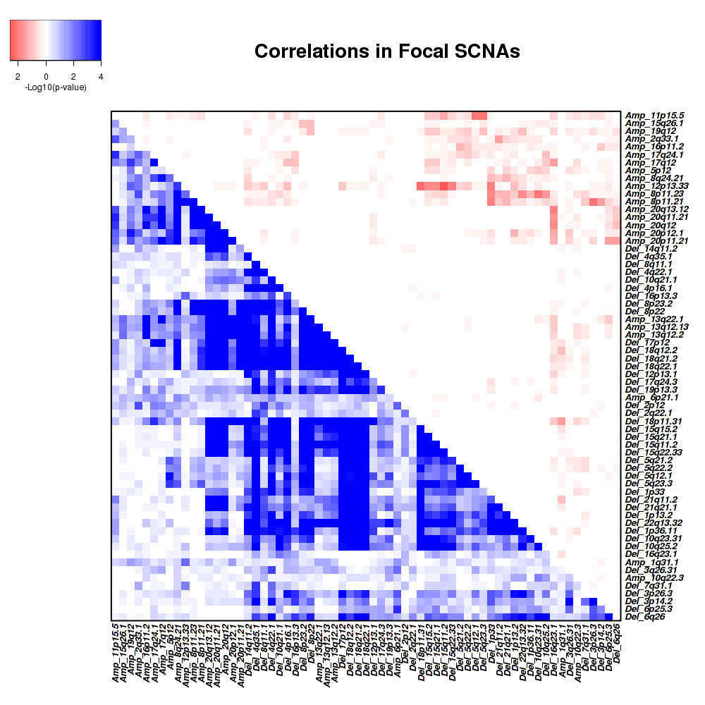 Figure 2. Get High-res Image Co-occurring and mutually-exclusive pairs for copy number variations of focal events. Blue means two events are co-occurring and red means two events are mutually-exclusive.