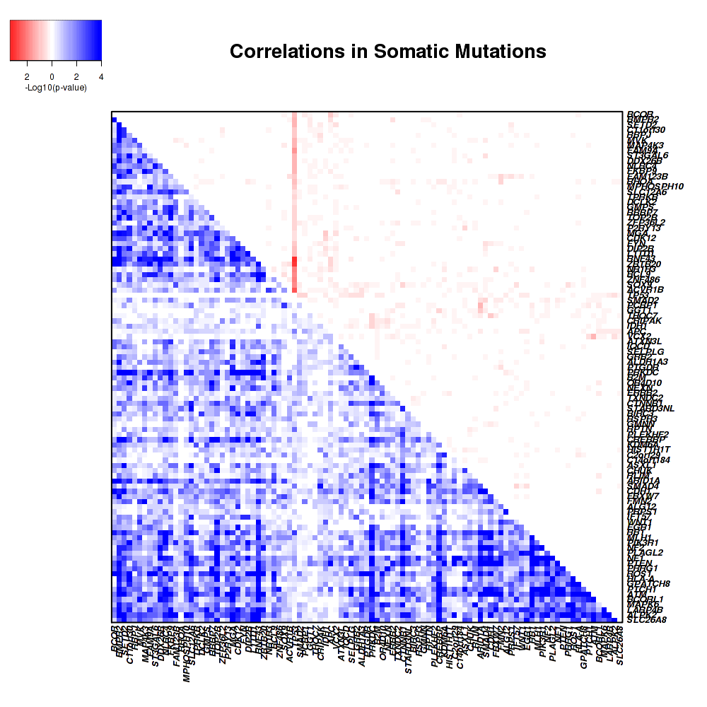 Figure 3. Get High-res Image Co-occurring and mutually-exclusive pairs for significantly mutated genes. Blue means two events are co-occurring and red means two events are mutually-exclusive.