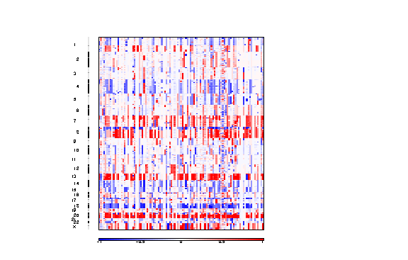 A table of chromosome arm amplification levels for each sample. Each row is a chromosome arm, and each column a sample. The data are in units of absolute copy number -2.