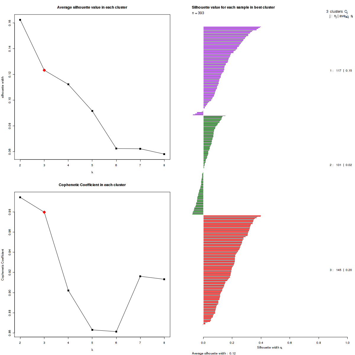 Figure 3. Get High-res Image The silhouette width was calculated for each sample and each value of k. The left upper panel shows the average silhouette width across all samples for each tested k (left upper panel). The left lower panel shows the Cophenetic Correlation Coefficients for each tested k. The right panel shows assignments of clusters to samples and the silhouette width of each sample for the most robust clustering.