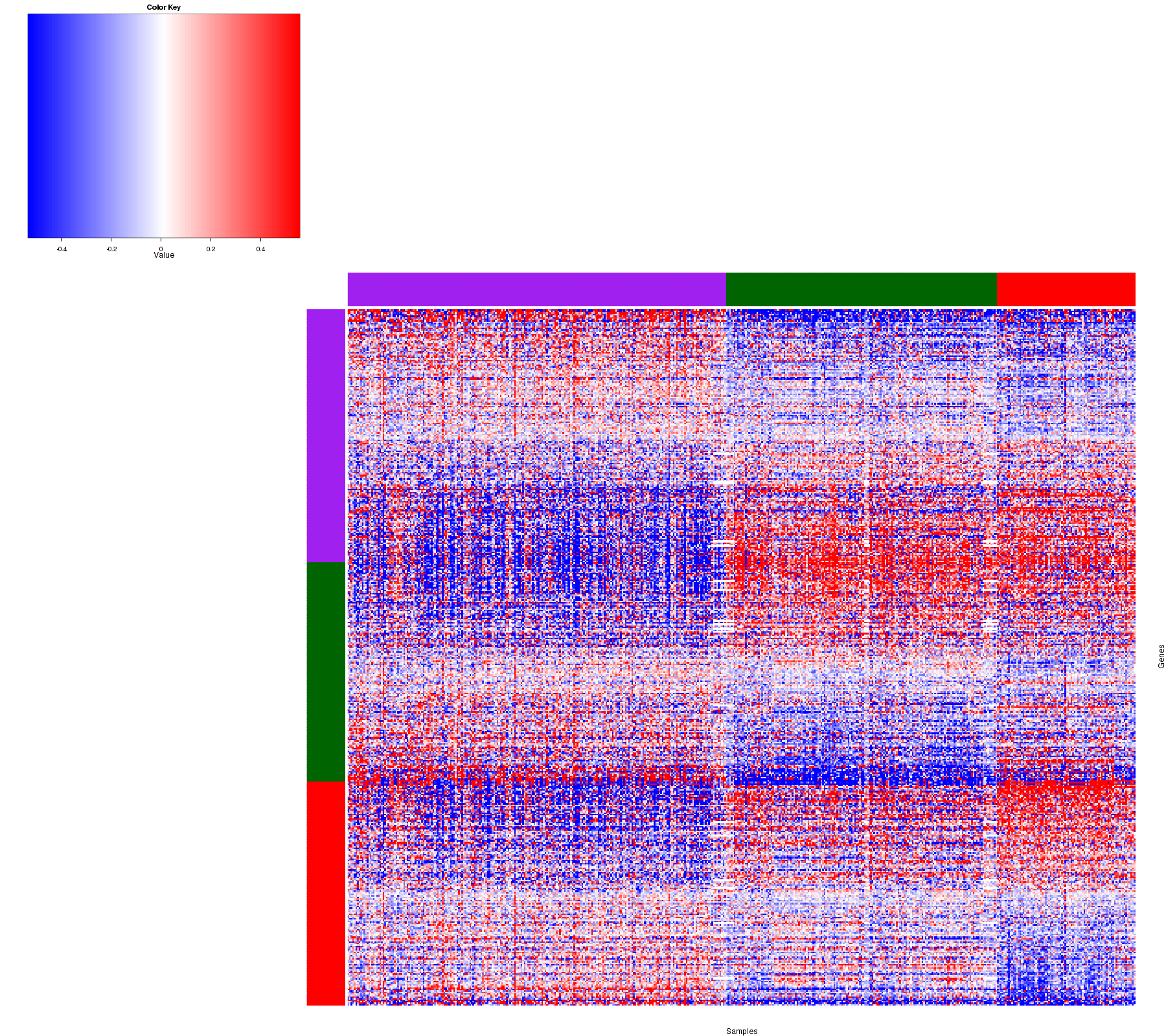 Figure 1. Get High-res Image Samples were separated into 3 clusters. Shown are 491 samples and 454 marker proteins. The color bar of the row indicates the marker proteins for the corresponding cluster.