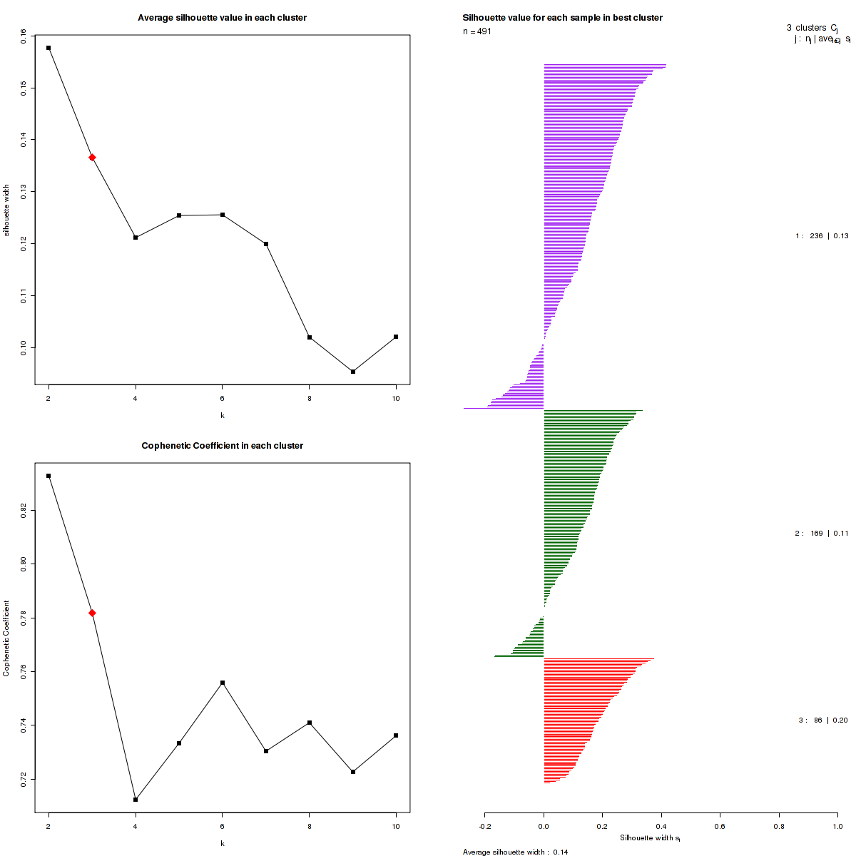 Figure 3. Get High-res Image The silhouette width was calculated for each sample and each value of k. The left upper panel shows the average silhouette width across all samples for each tested k (left upper panel). The left lower panel shows the Cophenetic Correlation Coefficients for each tested k. The right panel shows assignments of clusters to samples and the k silhouette width of each sample for the most robust clustering.
