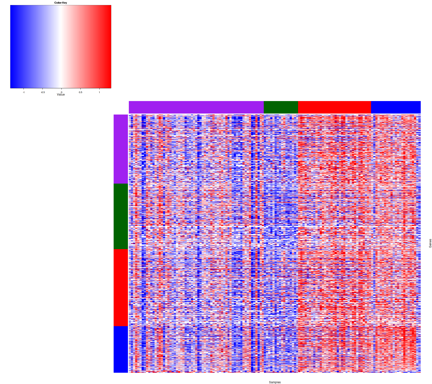 Figure 1. Get High-res Image Samples were separated into 4 clusters. Shown are 136 samples and 1256 marker miRs. The color bar of the row indicates the marker miRs for the corresponding cluster.
