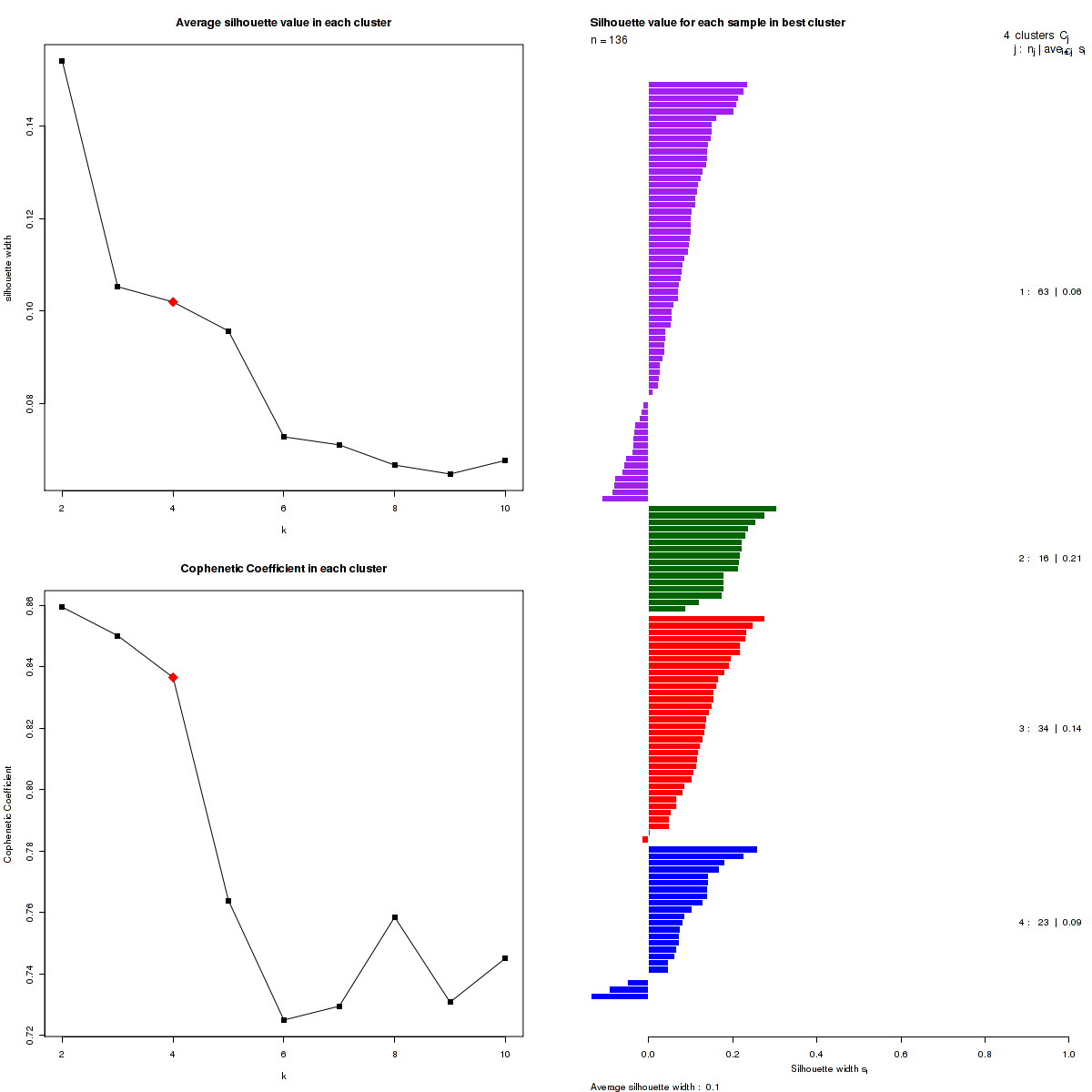 The cophenetic correlation coefficients and average silhouette values are used to determine the k with the most robust clusterings. From the plot of cophenetic correlation versus k, we select modes and the the point preceding the greatest decrease in cophenetic correlation coefficient, and from these choose the k with the highest average silhouette value.