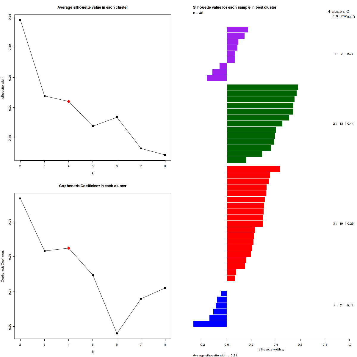 The most robust consensus NMF clustering of 48 samples using the 12661 most variable genes was identified for k = 4 clusters. We computed the clustering for k = 2 to k = 10 and uused the cophenetic correlation coefficient and the average silhouette width calculation to determine the robust clusters.