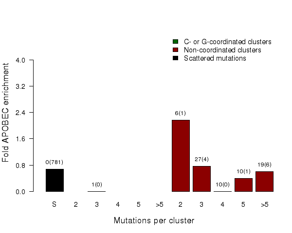 Fold enrichment of the APOBEC mutation signature in clusters of different sizes of two categories – C- or G-coordinated or non-coordinated as well as in non-clustered (scattered) mutations. Smaller clusters usually show less enrichment because they have a higher chance to be formed by random mutations that occurred in close vicinity to each other. Values above the bars display the total number of mutation clusters in each class and in parentheses the total numbers of APOBEC signature mutations in a category. Values for fold enrichment as well as mutation and mutation cluster counts are taken from the following output files which can be downloaded from firehose_get (https://confluence.broadinstitute.org/display/GDAC/Download):