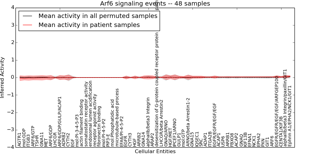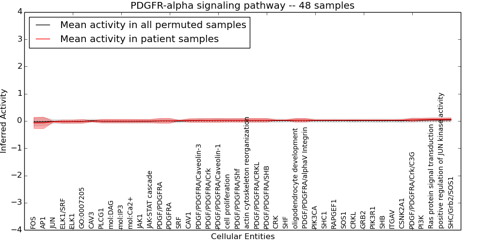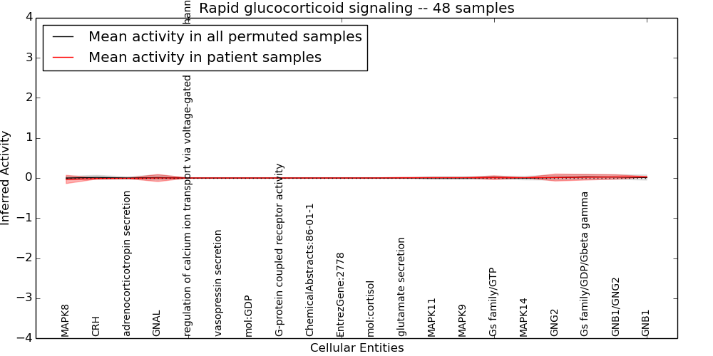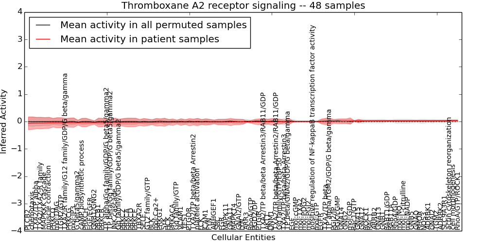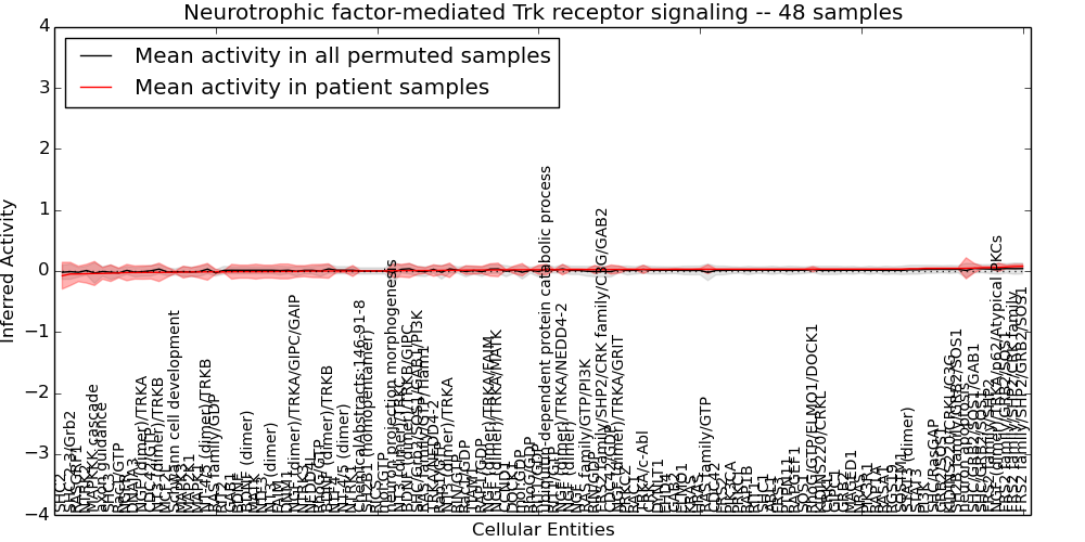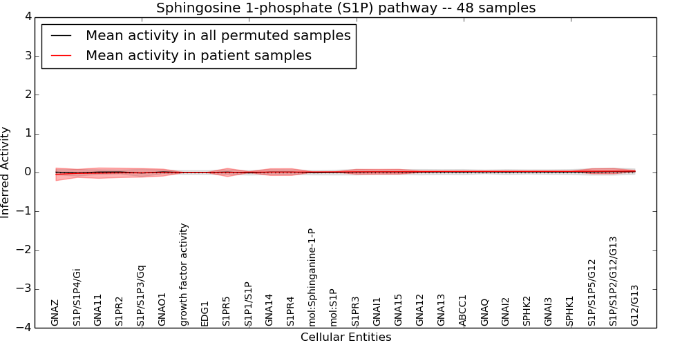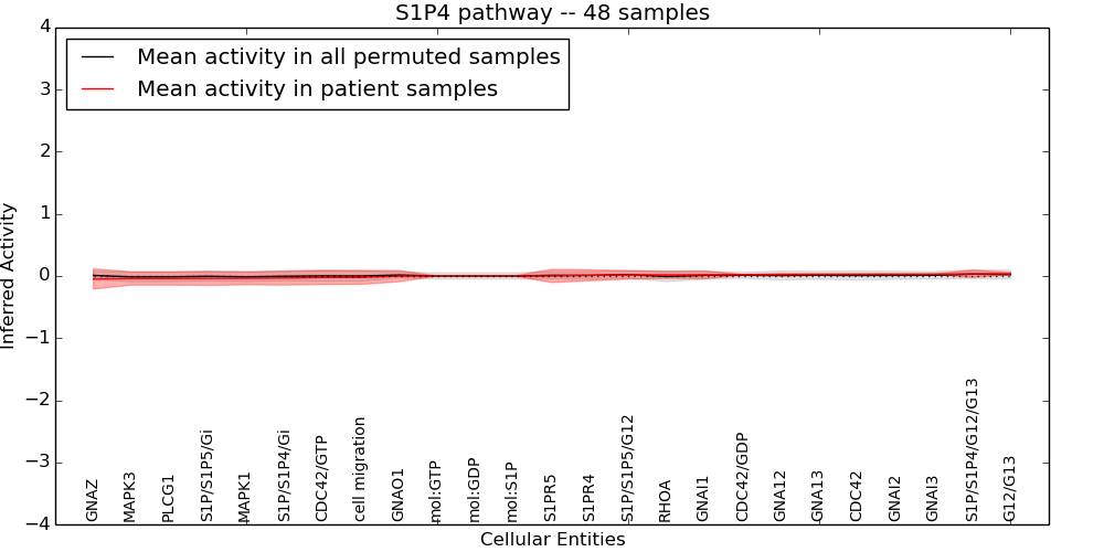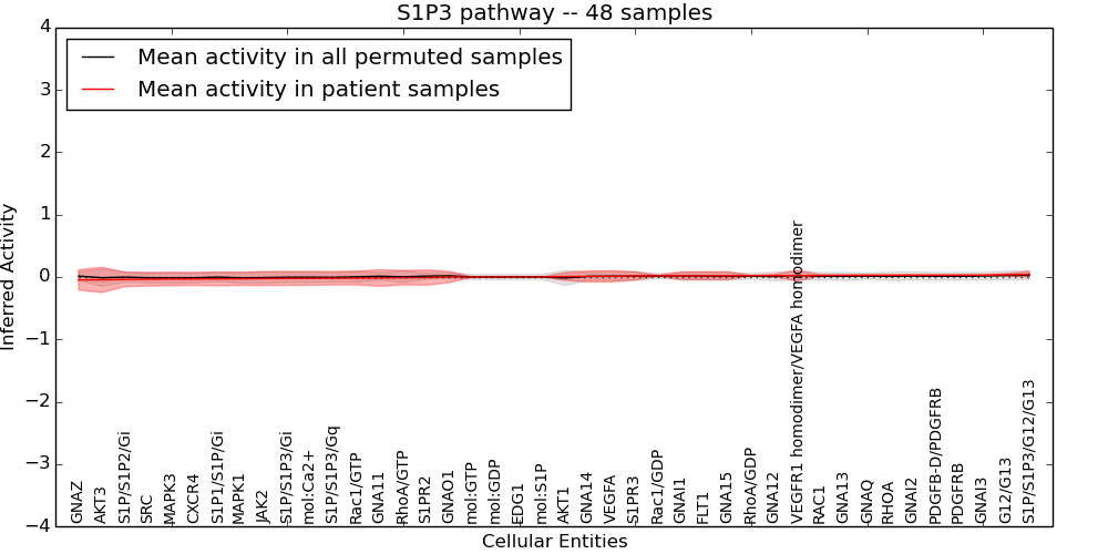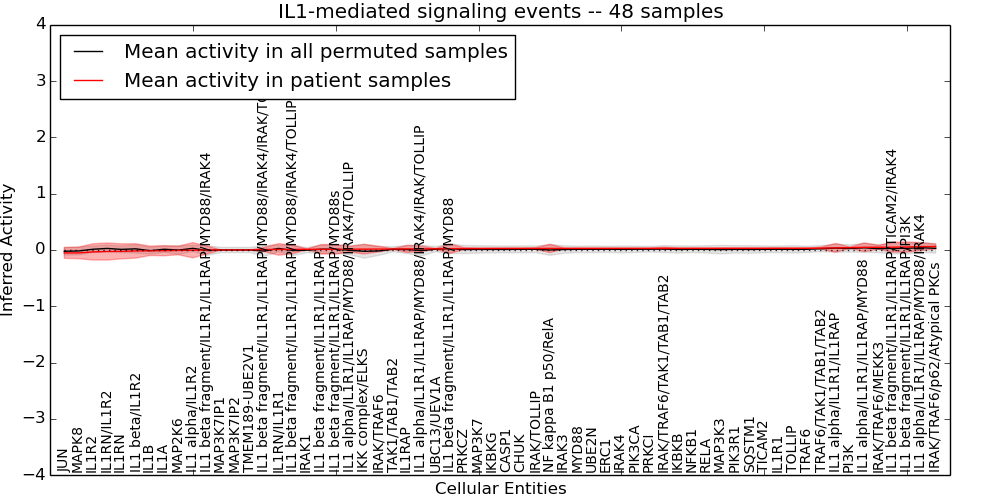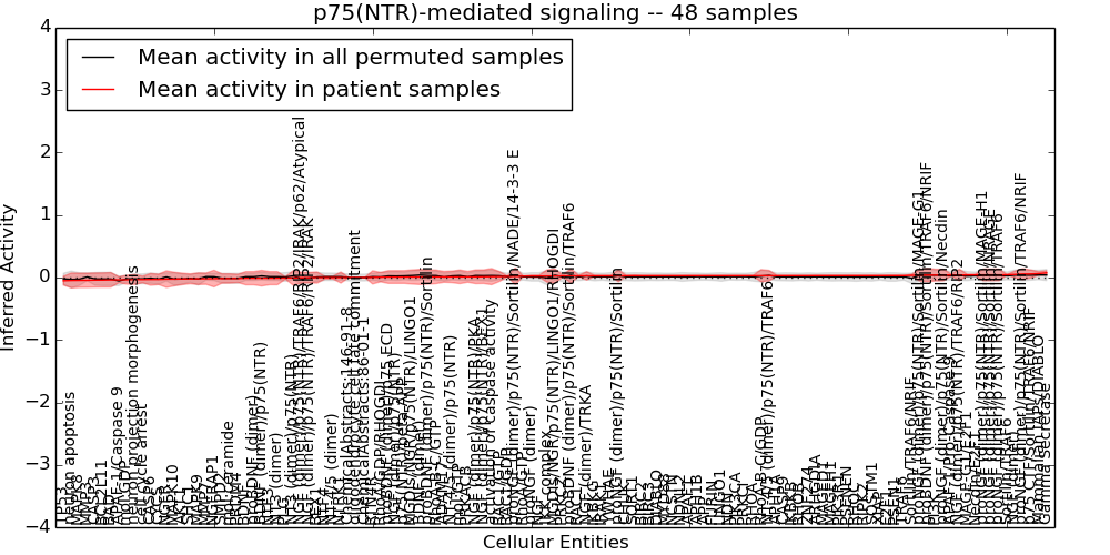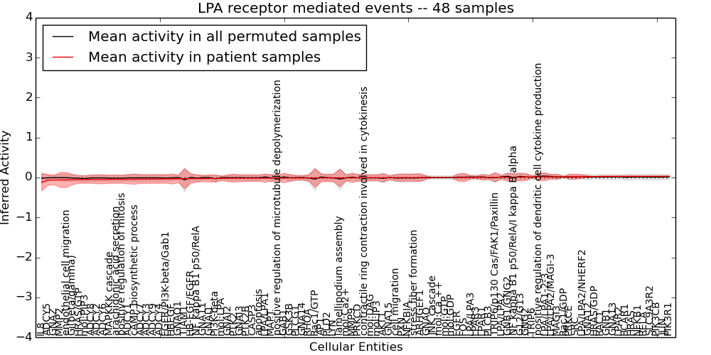 Figure S131. Get High-res Image This plot shows pathway concept perturbations across all samples against a permutation model. The concepts along the x-axis are sorted by lowest to highest mean activity for the real patient samples. Mean inferred activities are plotted along the y-axis as a colored band showing the average level and one standard deviation range. Real samples are shown in red and permuted samples in black.