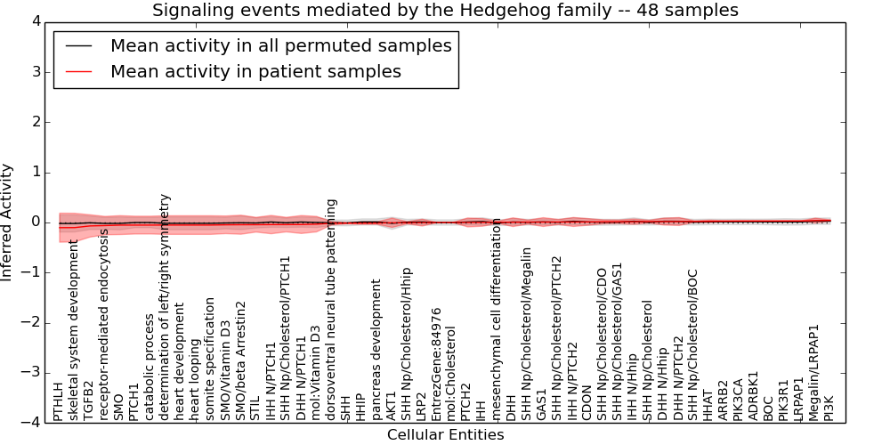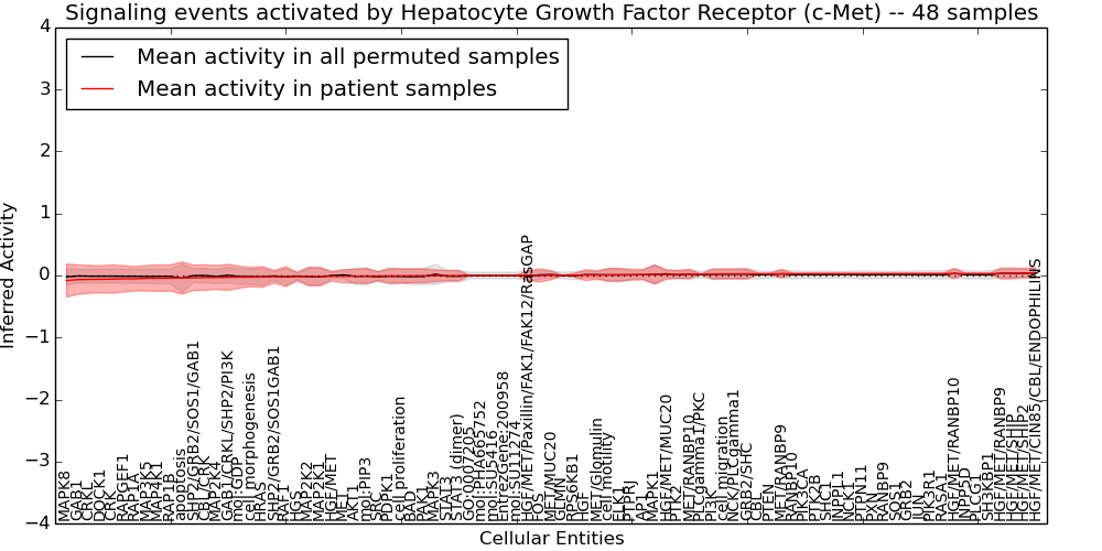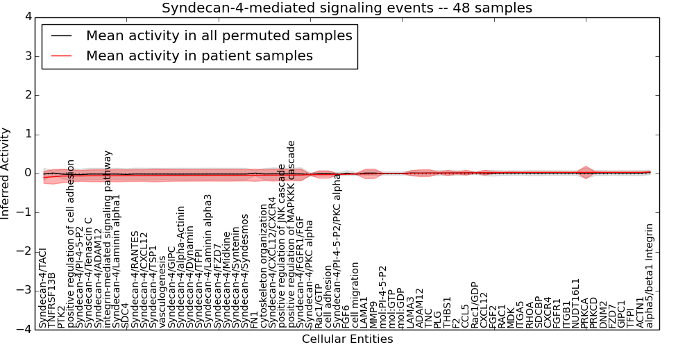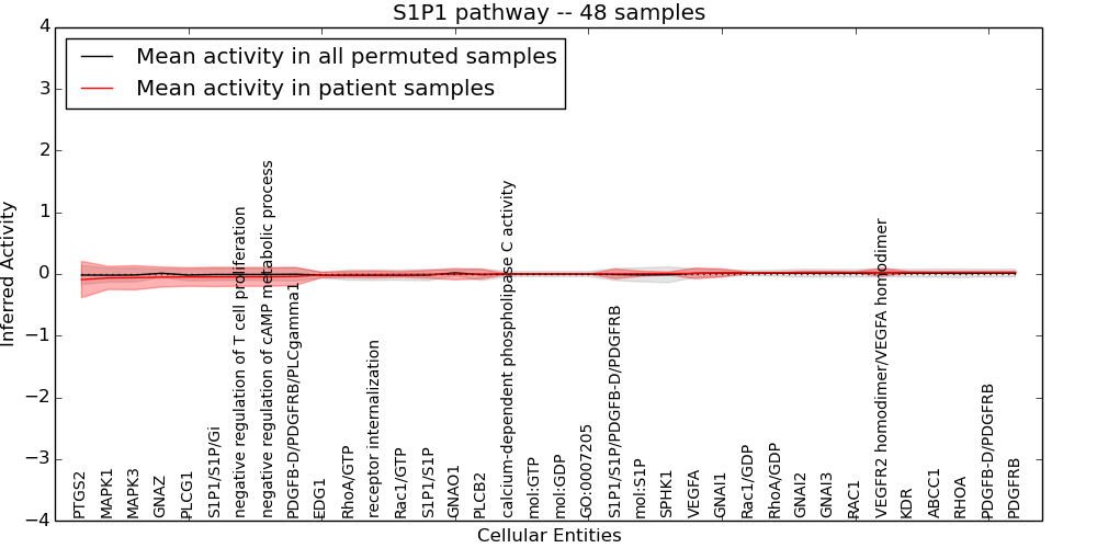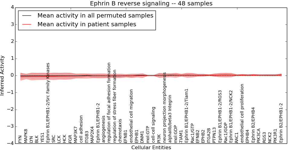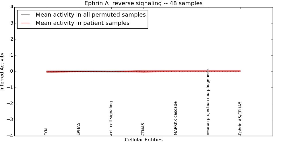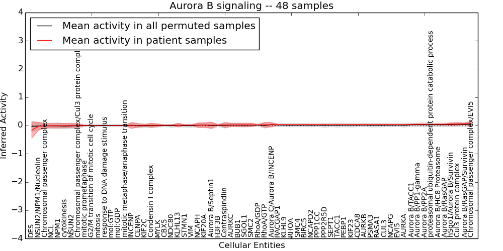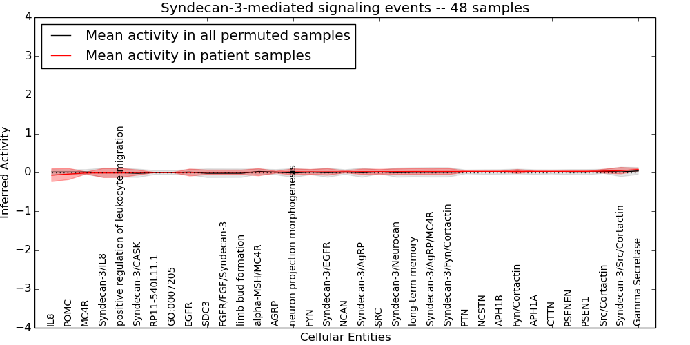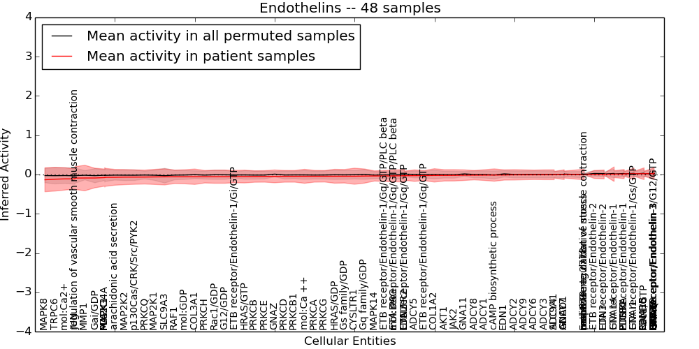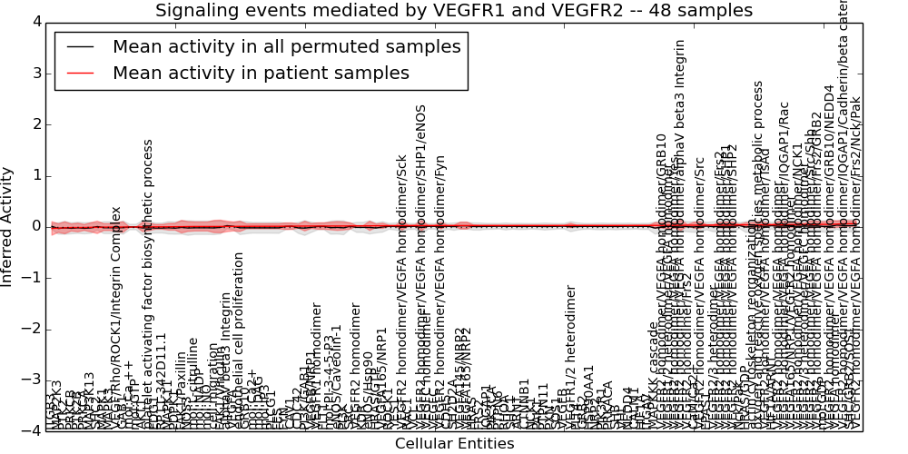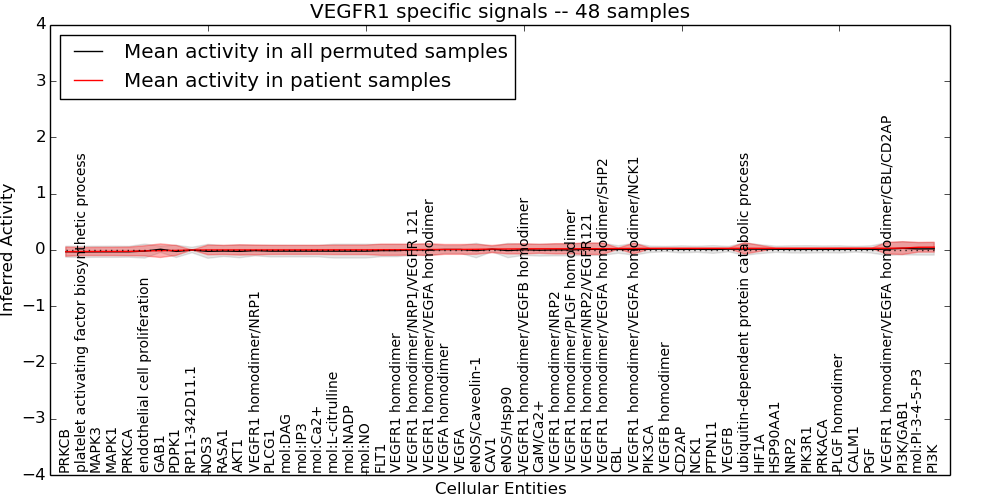 Figure S131. Get High-res Image This plot shows pathway concept perturbations across all samples against a permutation model. The concepts along the x-axis are sorted by lowest to highest mean activity for the real patient samples. Mean inferred activities are plotted along the y-axis as a colored band showing the average level and one standard deviation range. Real samples are shown in red and permuted samples in black.