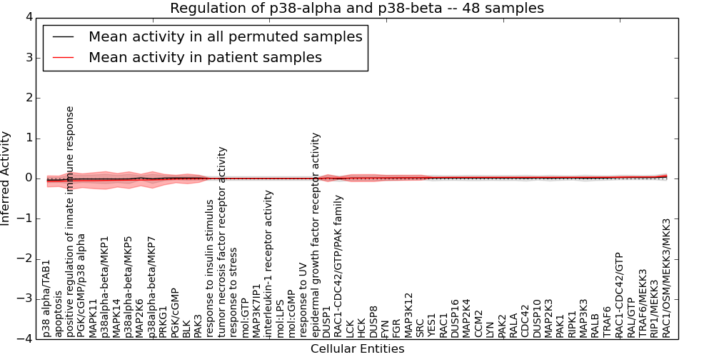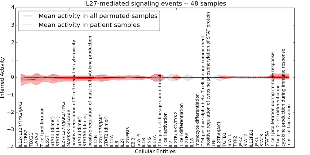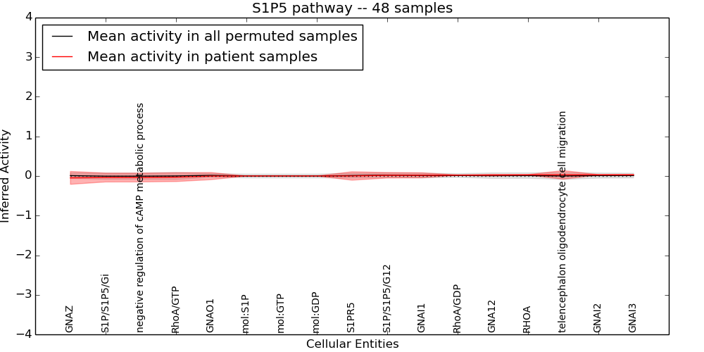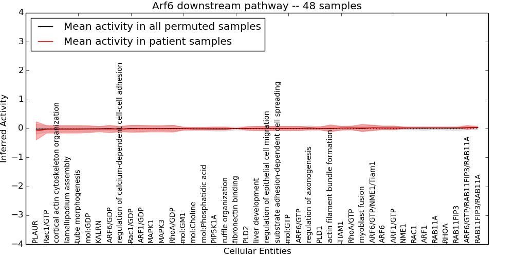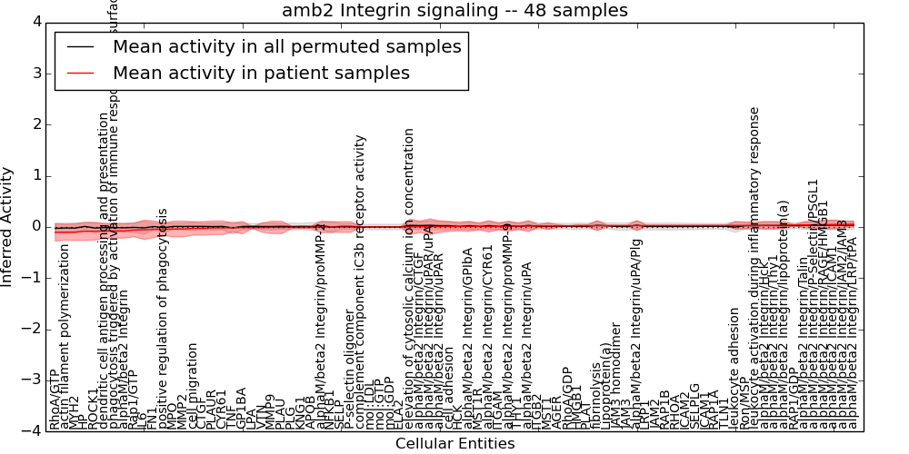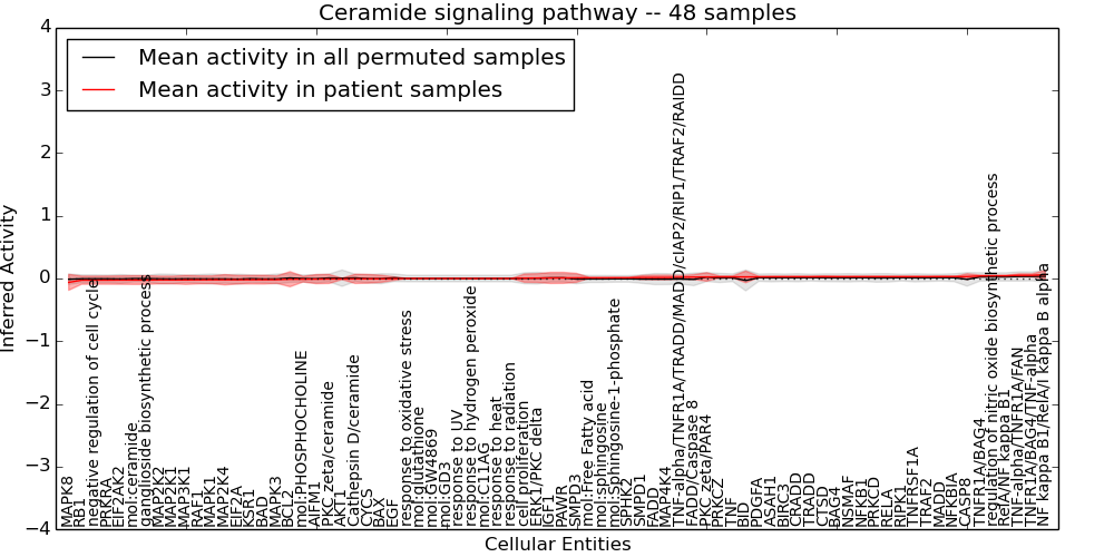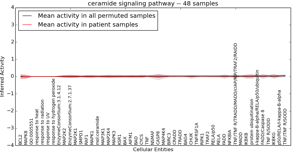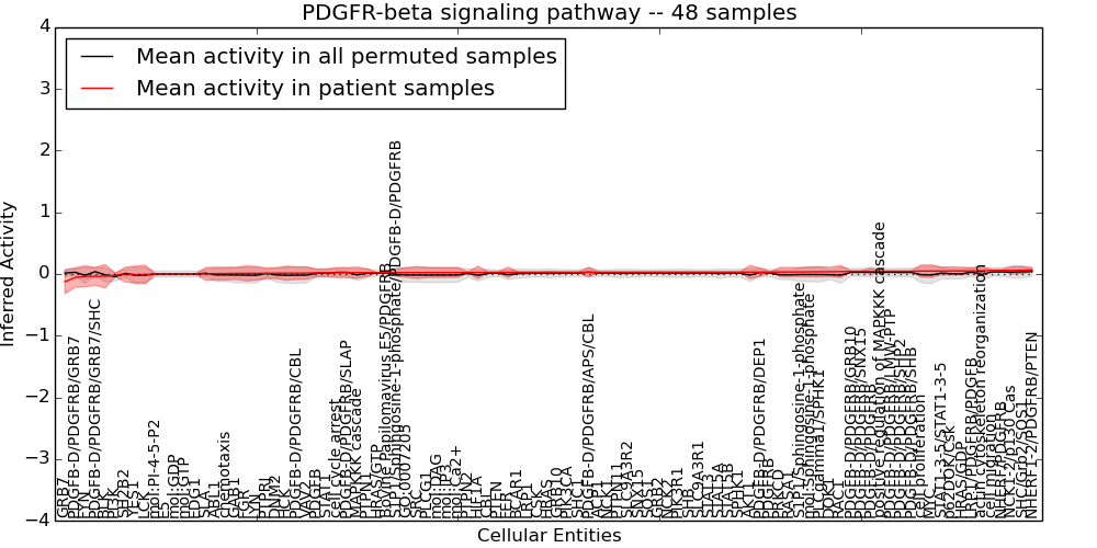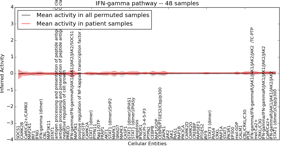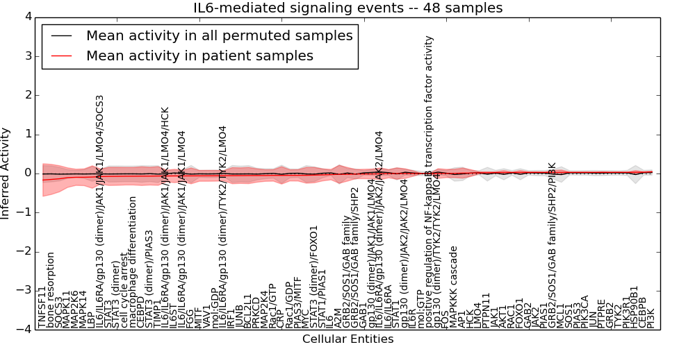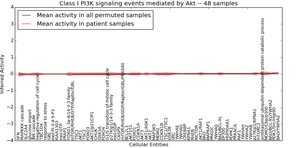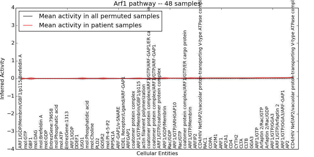 Figure S131. Get High-res Image This plot shows pathway concept perturbations across all samples against a permutation model. The concepts along the x-axis are sorted by lowest to highest mean activity for the real patient samples. Mean inferred activities are plotted along the y-axis as a colored band showing the average level and one standard deviation range. Real samples are shown in red and permuted samples in black.