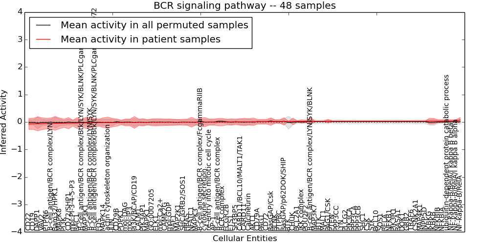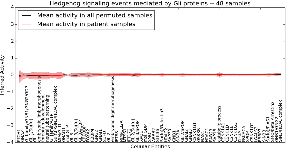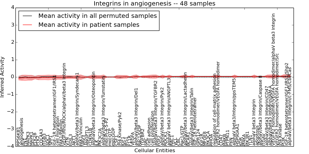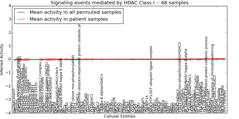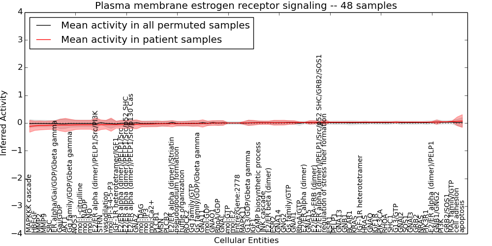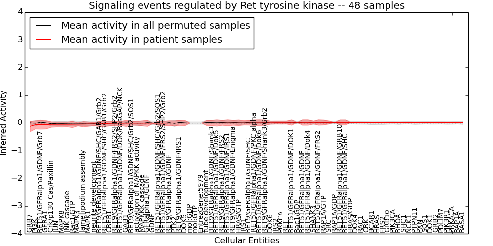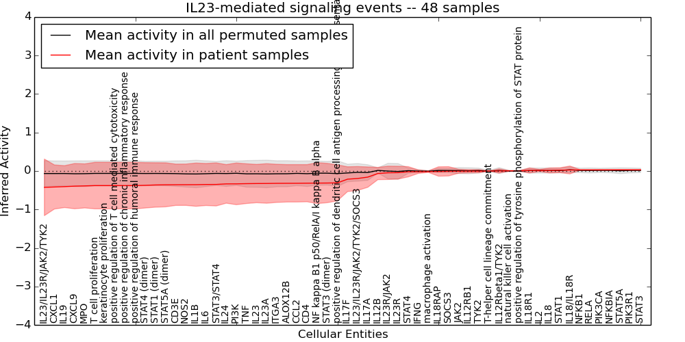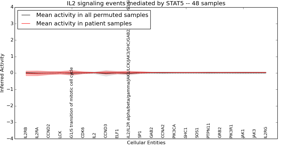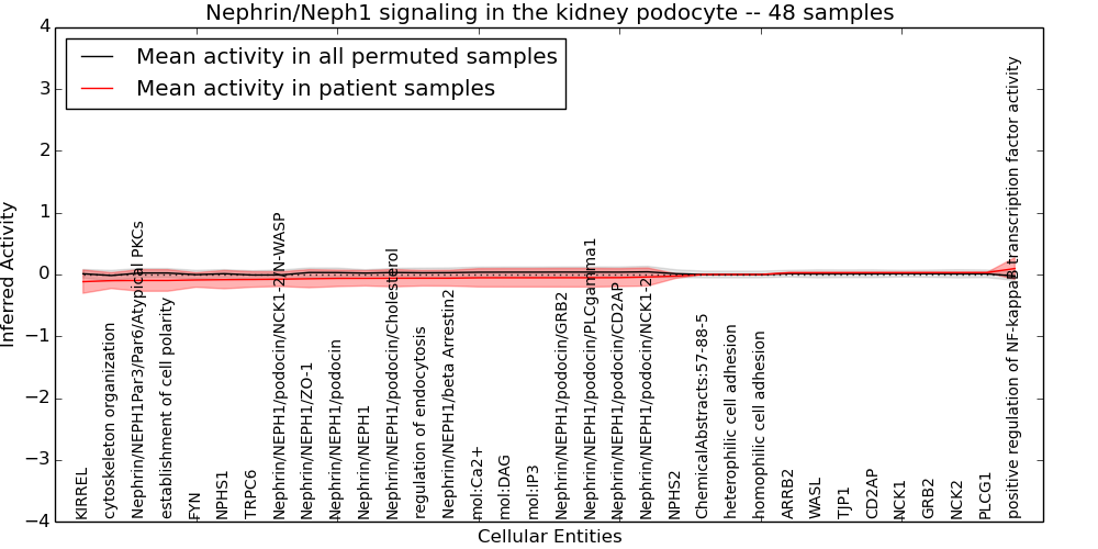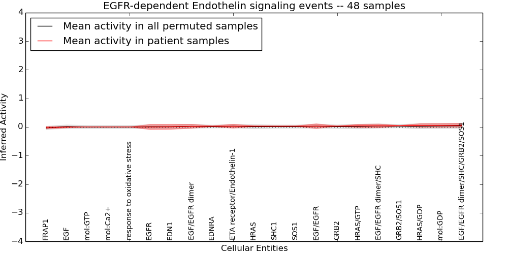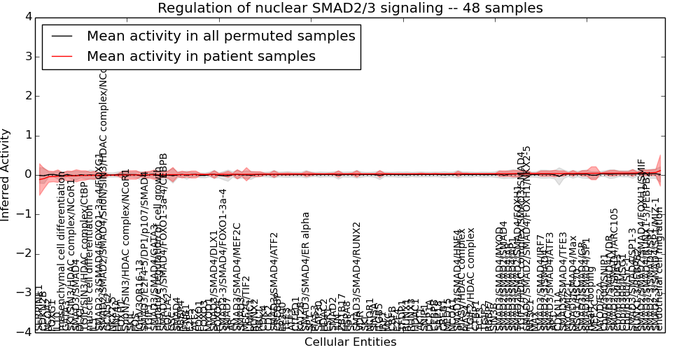 Figure S131. Get High-res Image This plot shows pathway concept perturbations across all samples against a permutation model. The concepts along the x-axis are sorted by lowest to highest mean activity for the real patient samples. Mean inferred activities are plotted along the y-axis as a colored band showing the average level and one standard deviation range. Real samples are shown in red and permuted samples in black.