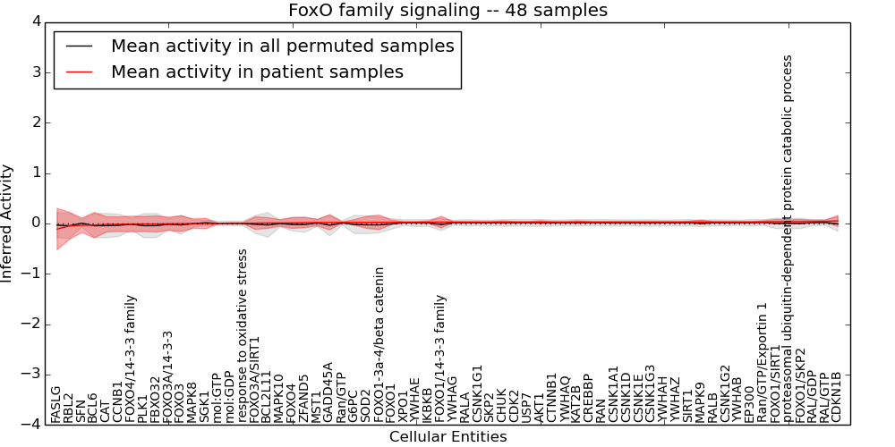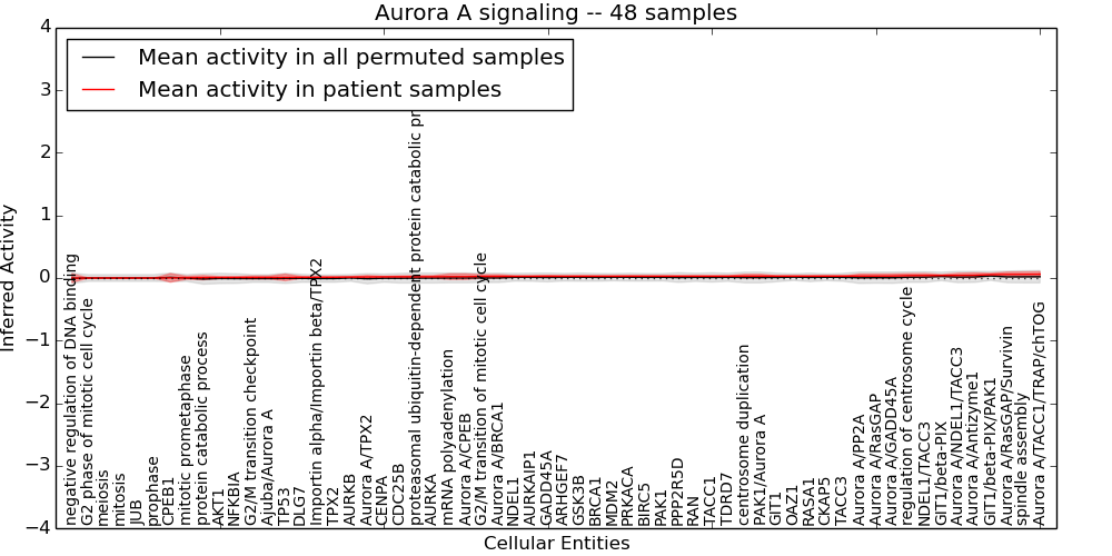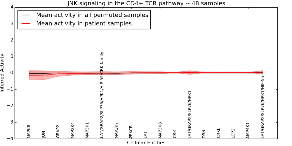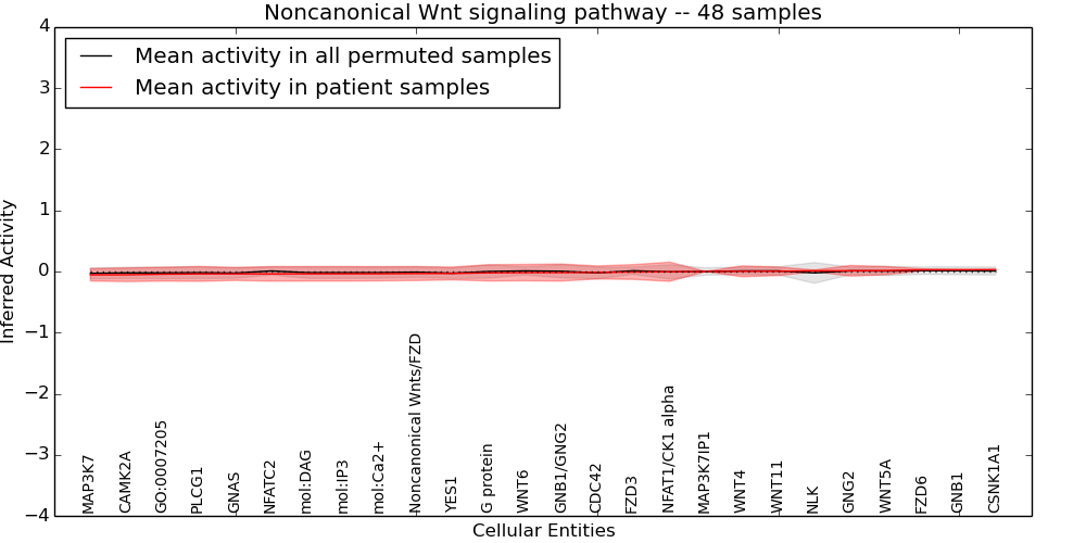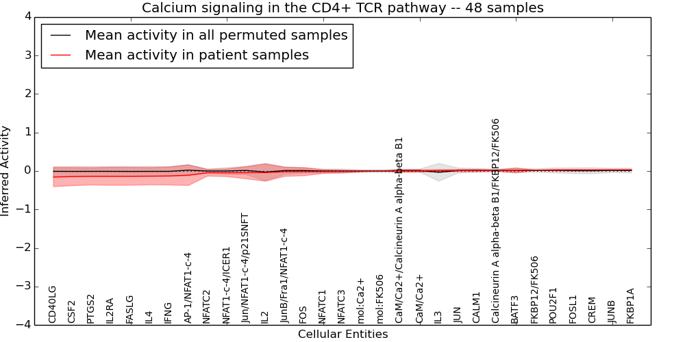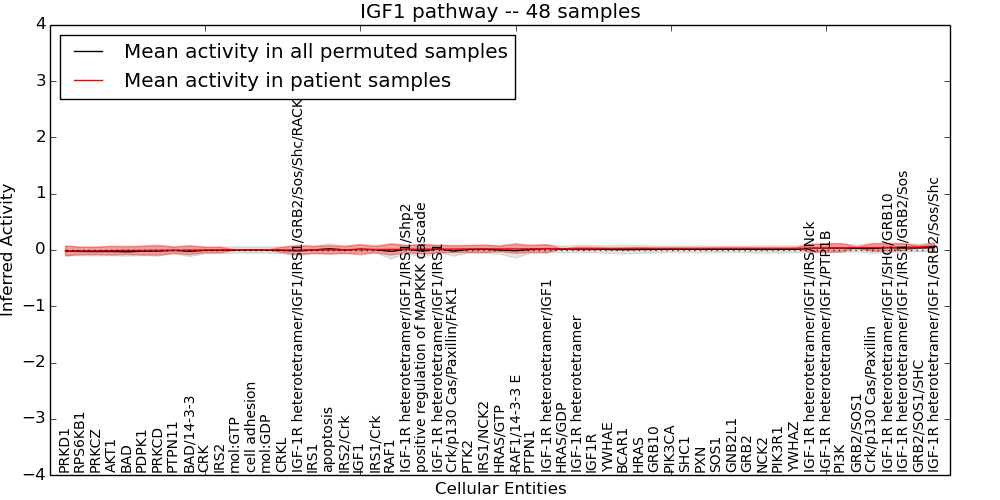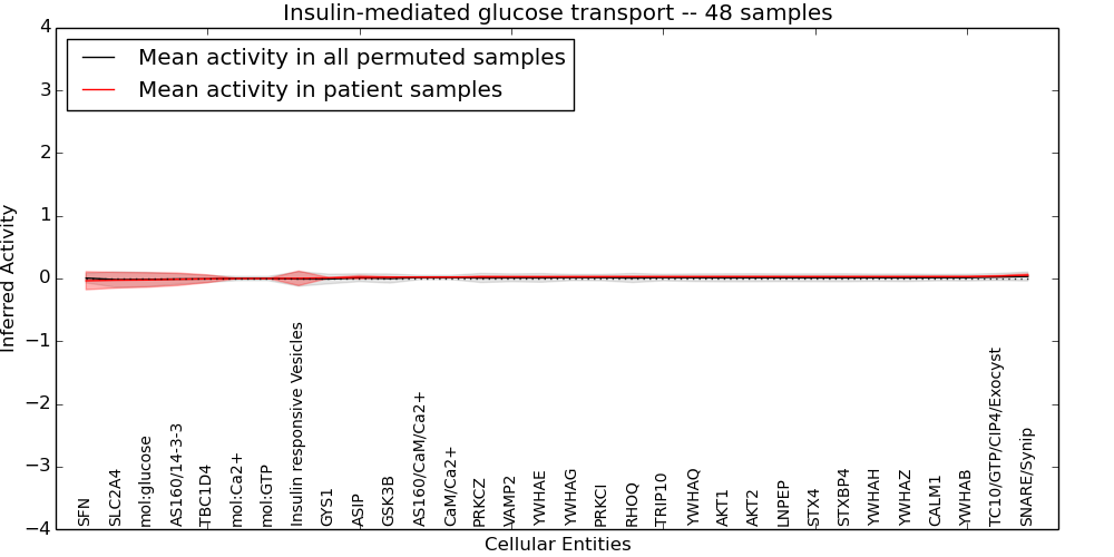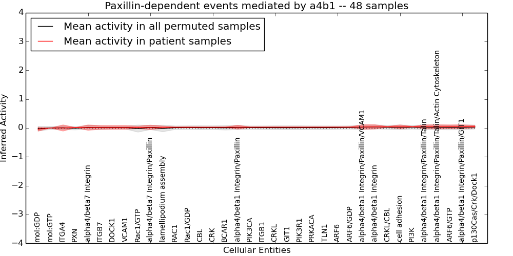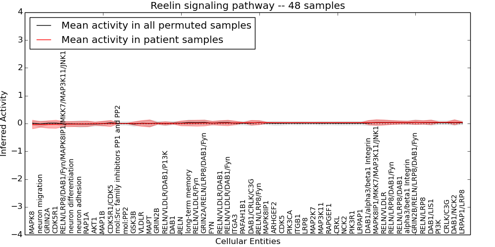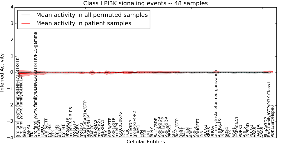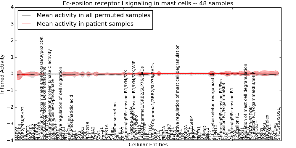 Figure S131. Get High-res Image This plot shows pathway concept perturbations across all samples against a permutation model. The concepts along the x-axis are sorted by lowest to highest mean activity for the real patient samples. Mean inferred activities are plotted along the y-axis as a colored band showing the average level and one standard deviation range. Real samples are shown in red and permuted samples in black.