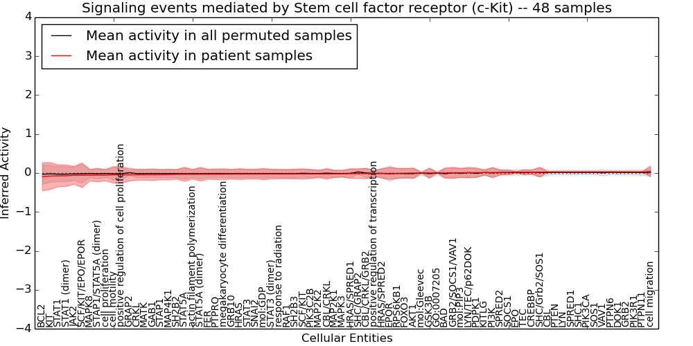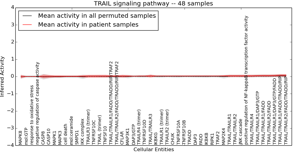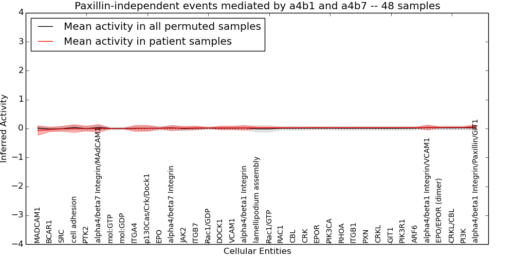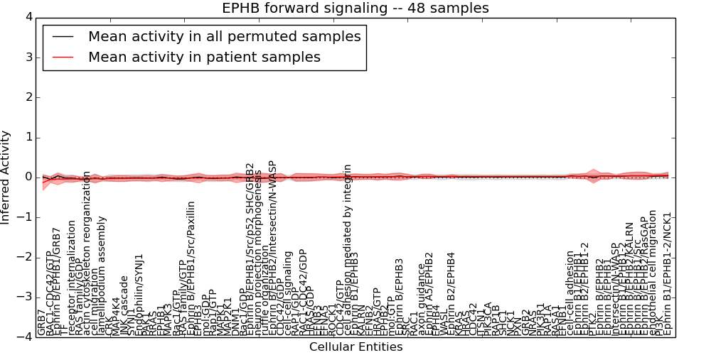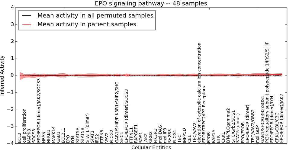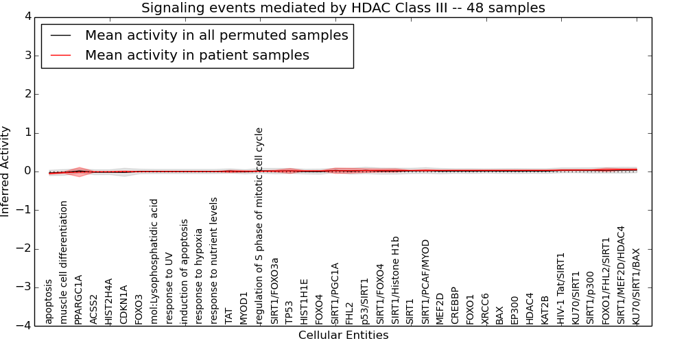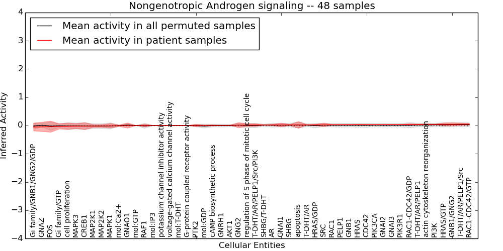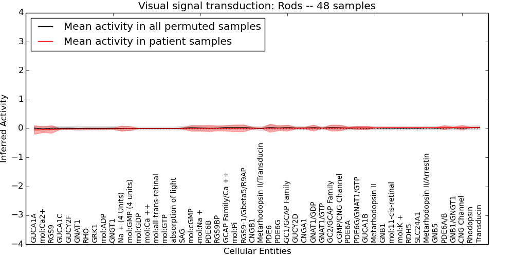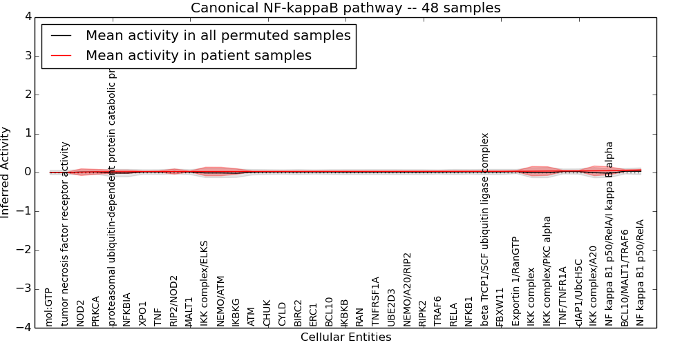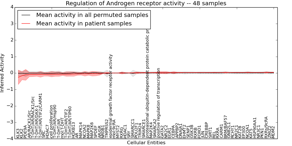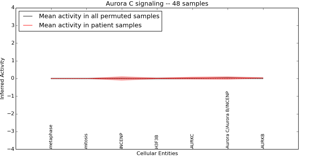 Figure S131. Get High-res Image This plot shows pathway concept perturbations across all samples against a permutation model. The concepts along the x-axis are sorted by lowest to highest mean activity for the real patient samples. Mean inferred activities are plotted along the y-axis as a colored band showing the average level and one standard deviation range. Real samples are shown in red and permuted samples in black.