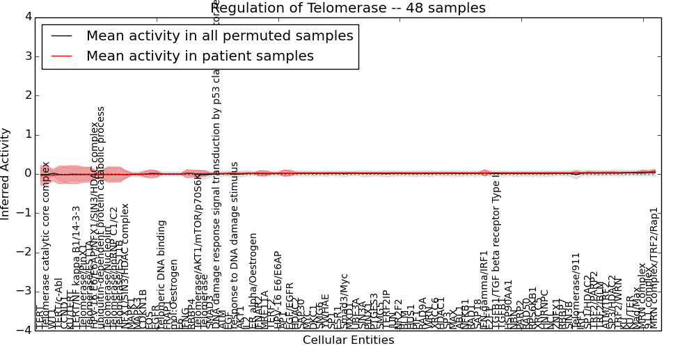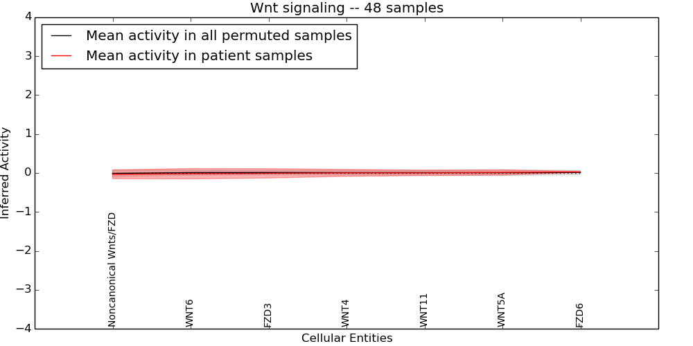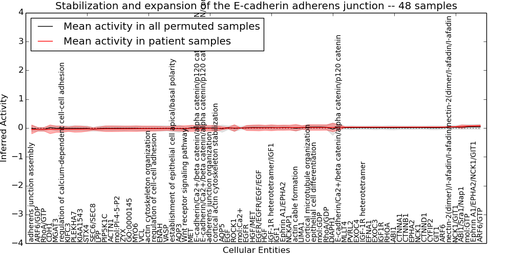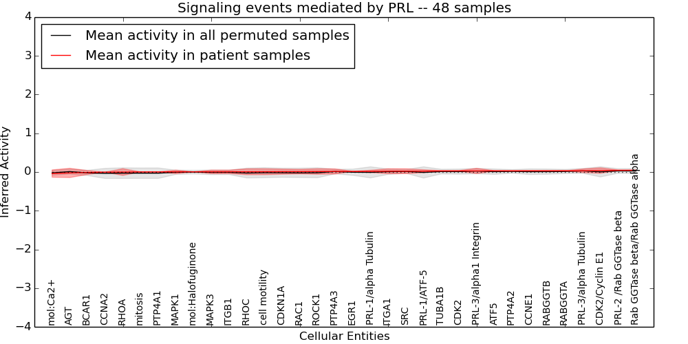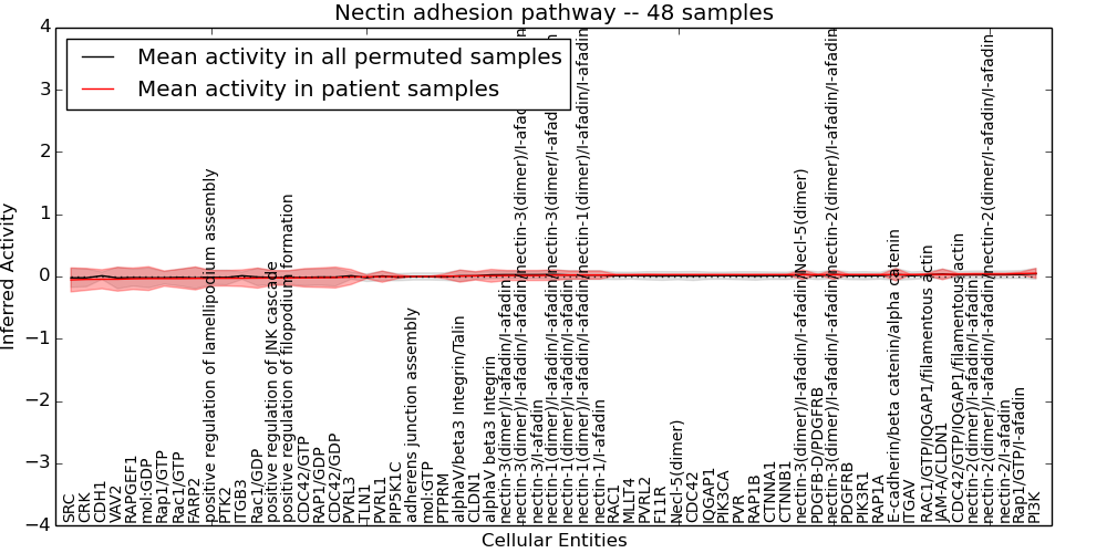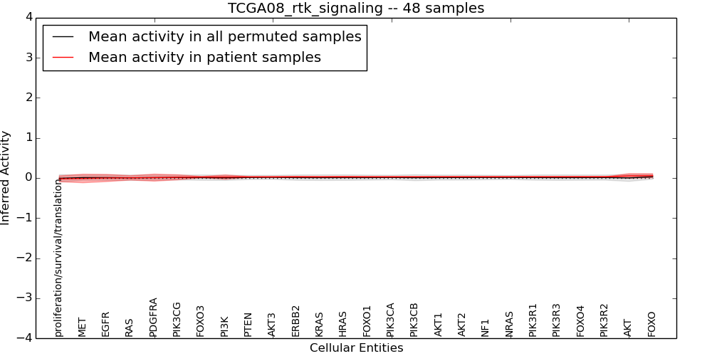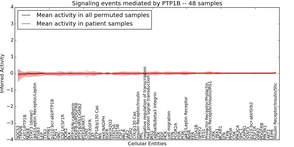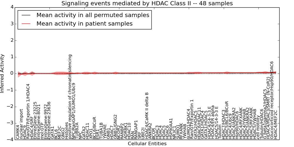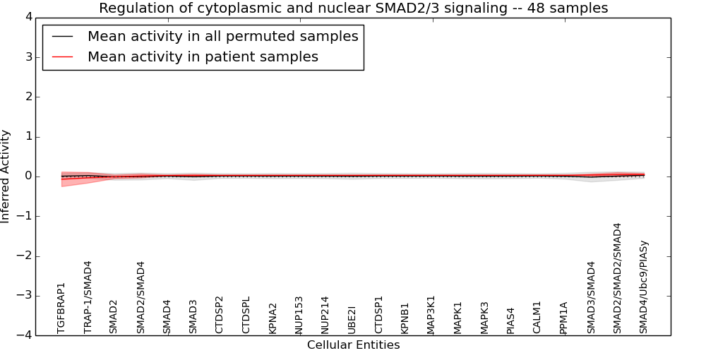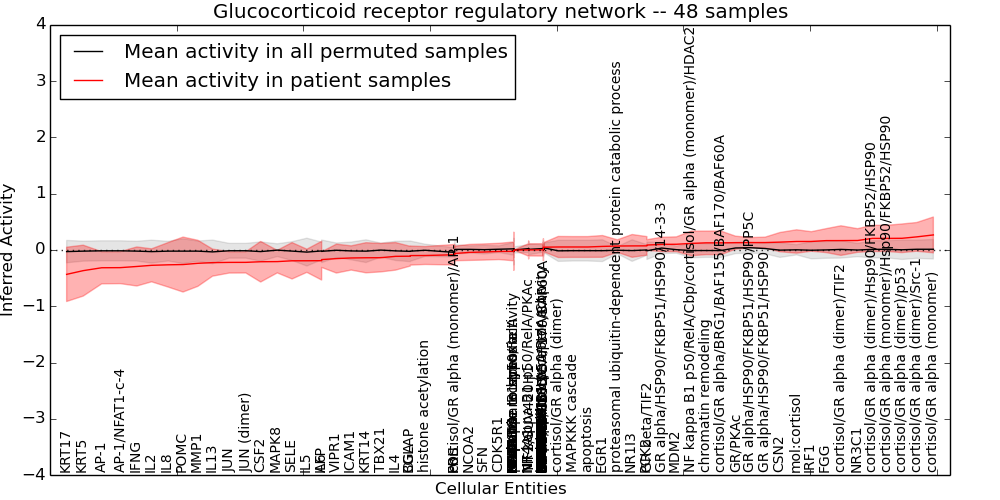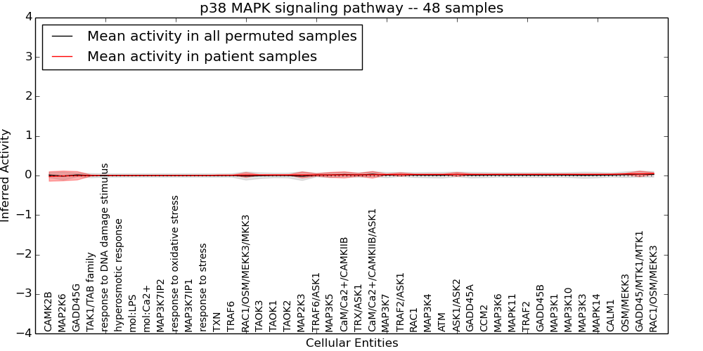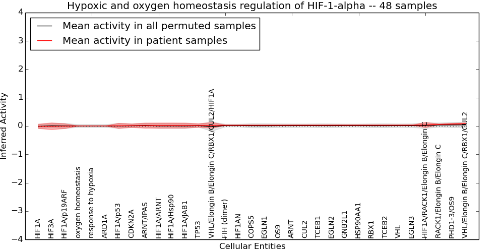 Figure S131. Get High-res Image This plot shows pathway concept perturbations across all samples against a permutation model. The concepts along the x-axis are sorted by lowest to highest mean activity for the real patient samples. Mean inferred activities are plotted along the y-axis as a colored band showing the average level and one standard deviation range. Real samples are shown in red and permuted samples in black.