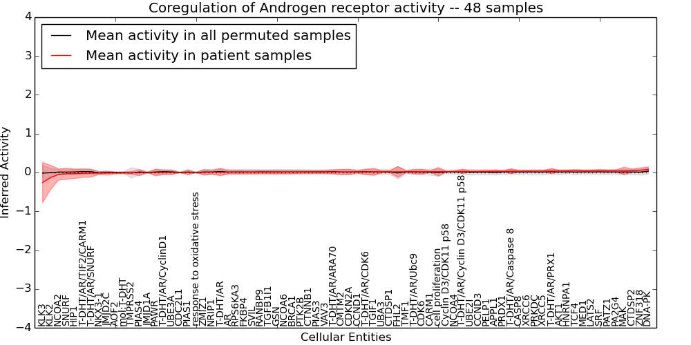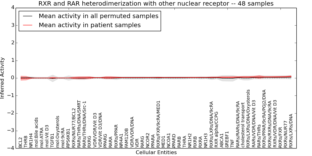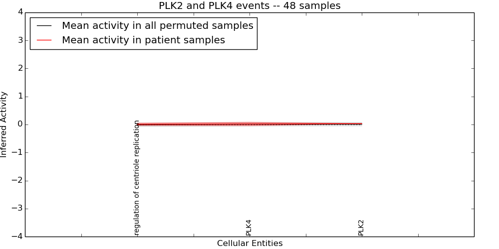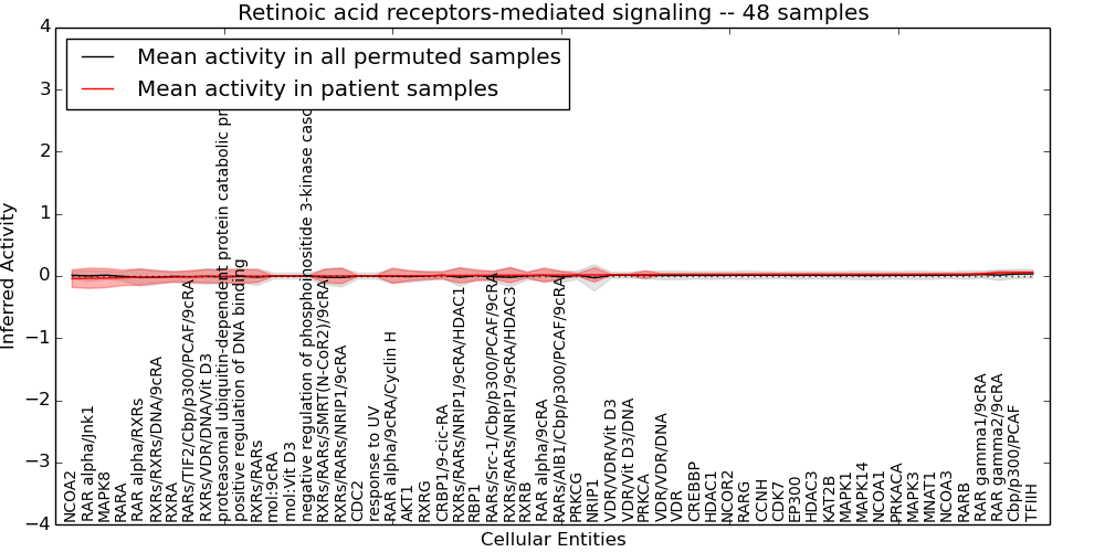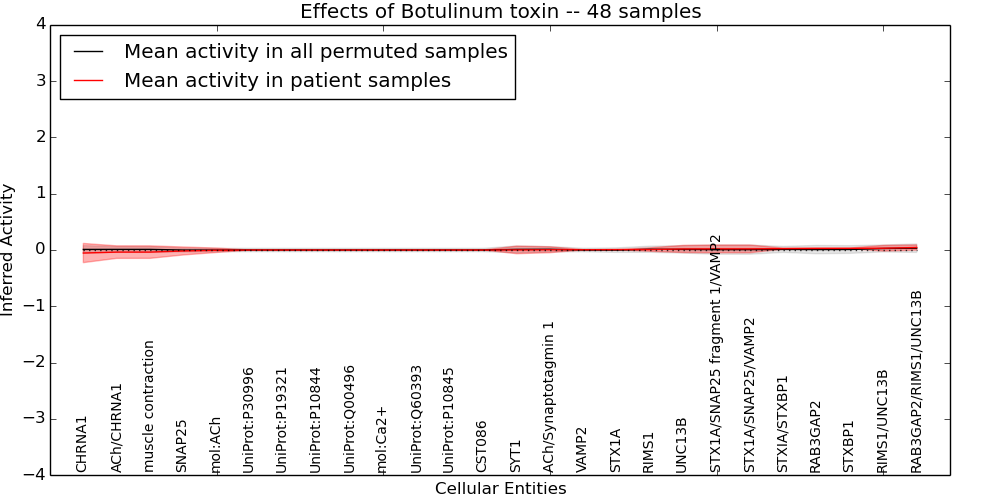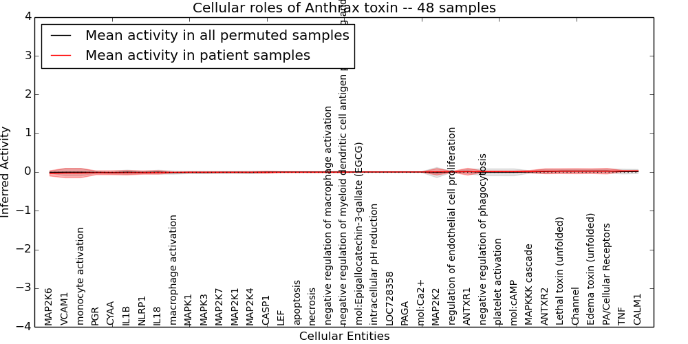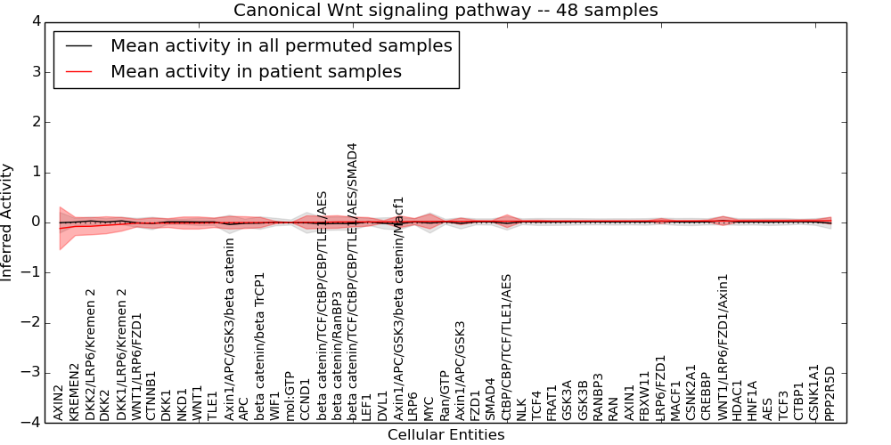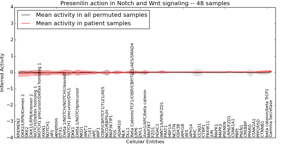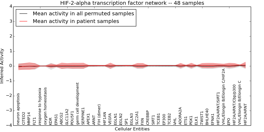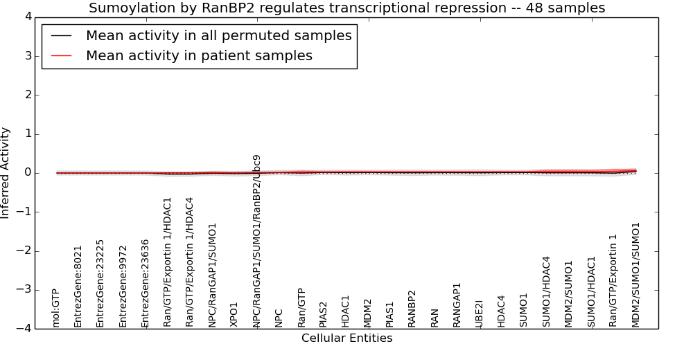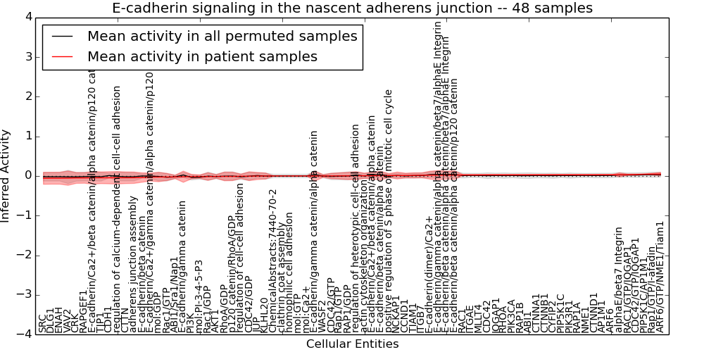 Figure S131. Get High-res Image This plot shows pathway concept perturbations across all samples against a permutation model. The concepts along the x-axis are sorted by lowest to highest mean activity for the real patient samples. Mean inferred activities are plotted along the y-axis as a colored band showing the average level and one standard deviation range. Real samples are shown in red and permuted samples in black.