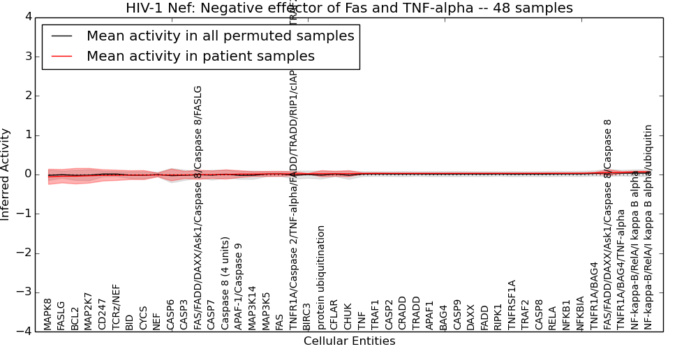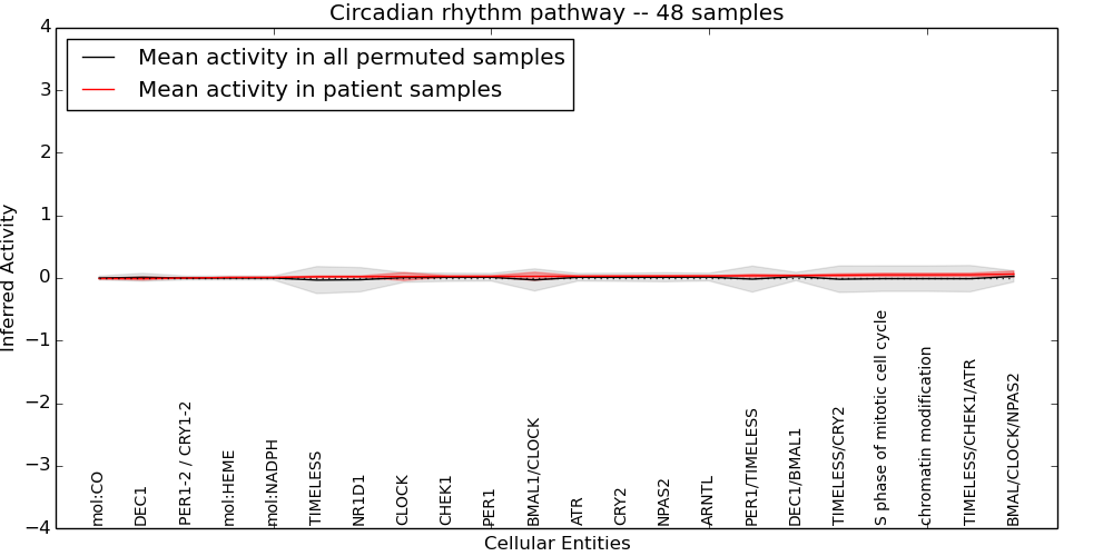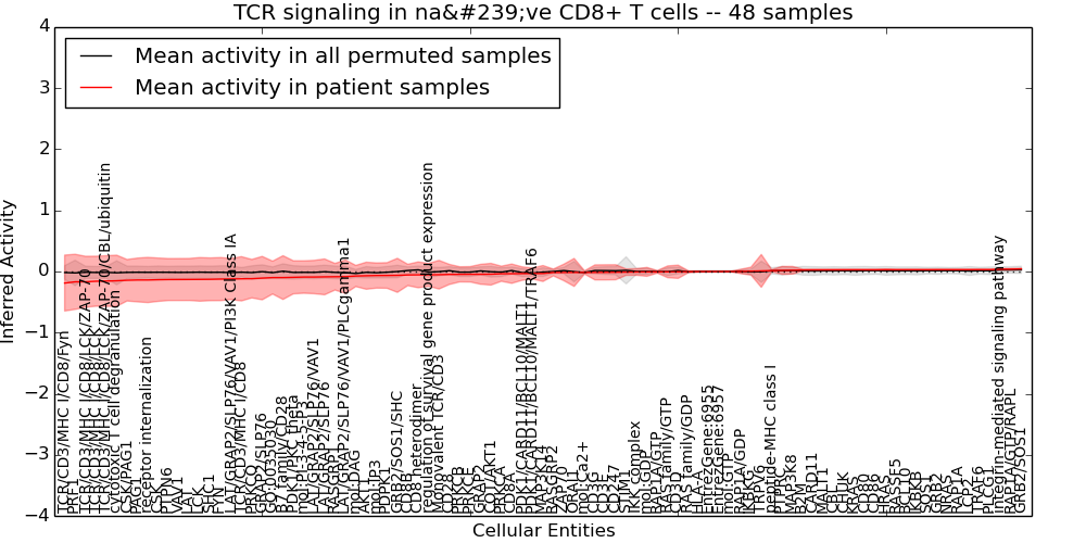 Figure S130. Get High-res Image This plot shows pathway concept perturbations across all samples against a permutation model. The concepts along the x-axis are sorted by lowest to highest mean activity for the real patient samples. Mean inferred activities are plotted along the y-axis as a colored band showing the average level and one standard deviation range. Real samples are shown in red and permuted samples in black.