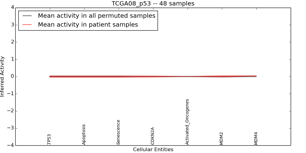 The significance of the IPL obtained for each concept in each patient sample is assessed using a permutation analysis. Importantly, the permutation analysis preserves data tuples so as to preserve any implicit correlations between the different data modalities. For example, genes that are deleted have concomitantly lower expression levels. Preserving the copy number and expression pairs therefore retains this data property. The simulation therefore makes "null samples" by permuting data tuples across all of the genes in the genome so that each gene in a null sample is associated with a random tuple of another gene with equal probability. This approach has the added benefit of preserving the pathway structure so that every observed IPL can be compared to a distribution of random IPLs derived from exactly the same interaction context. PARADIGM inferences are then obtained for 1000 "null" patients and serve as a background distribution to contrast the observed IPLs against. Pathway concepts are excluded from further analysis if they did not obtain a minimum IPL of 0.5 in any patient sample both observed or simulated.